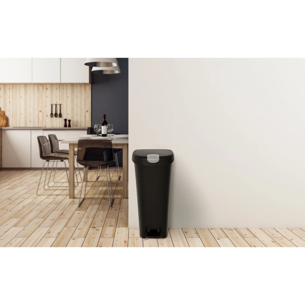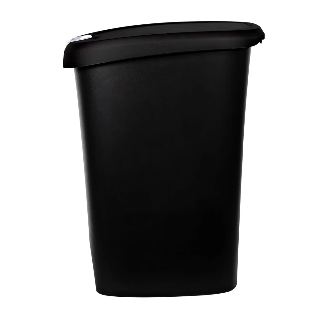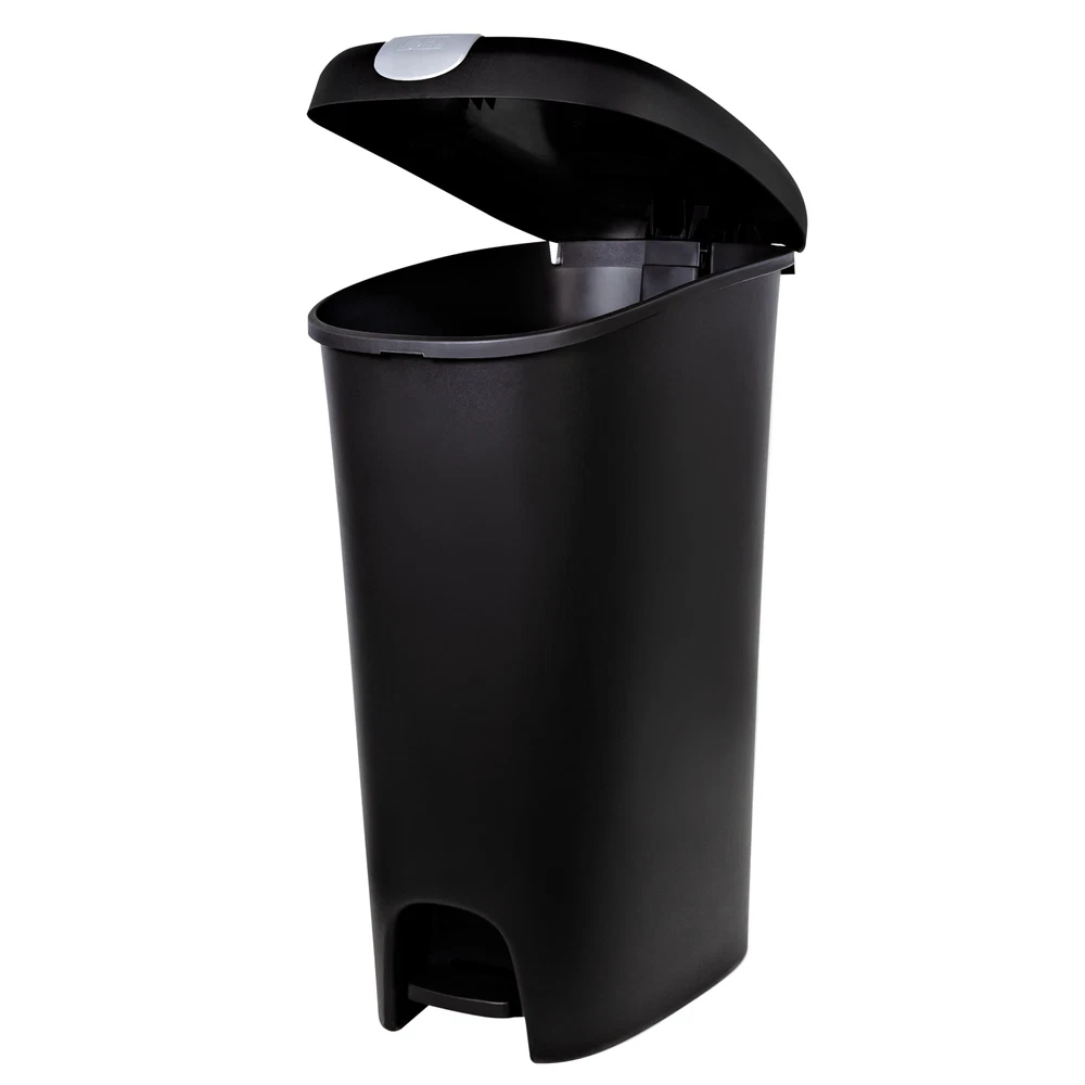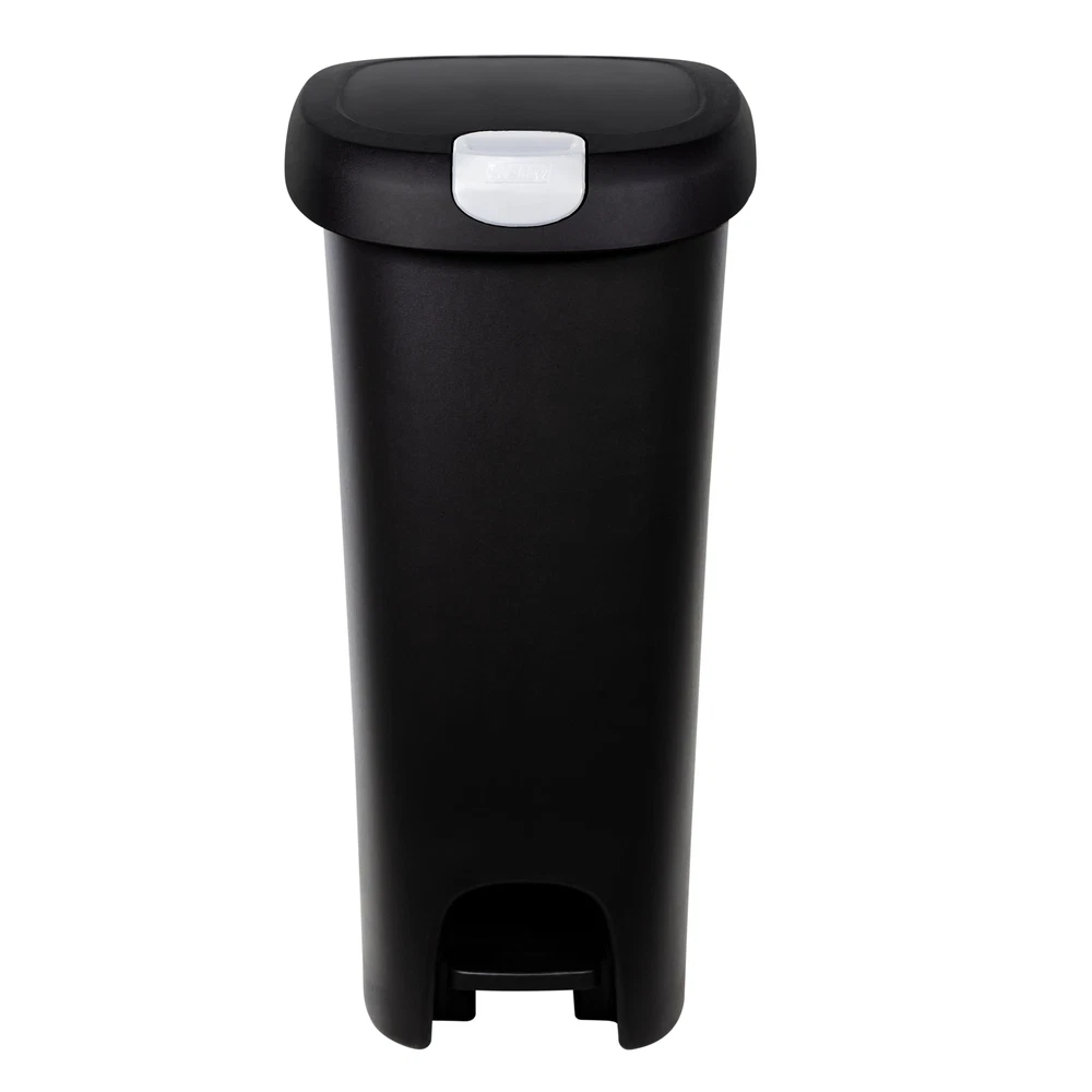 The Hefty Lockable Step On Plastic Trash Can has a locking lid to help keep curious pets and children out and easily avoid messes. The slim design in black with a 12-gallon capacity make this an large kitchen trash can great for busy families who want to limit trips to take the garbage out. Use the step on pedal for easy, hands-free trash disposal. It also uses standard 13 gallon kitchen trash bag. On Dec 22, 2024 at 17:41:50 PST, seller added the following information: