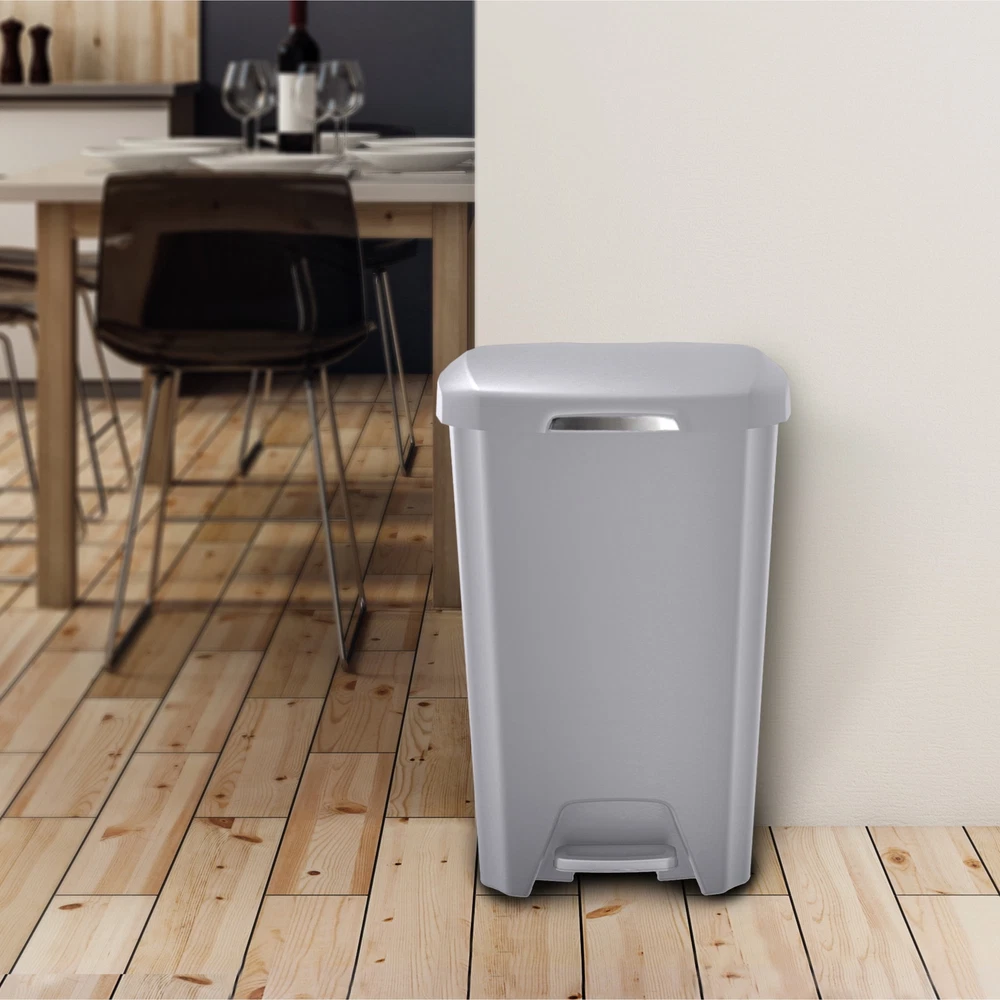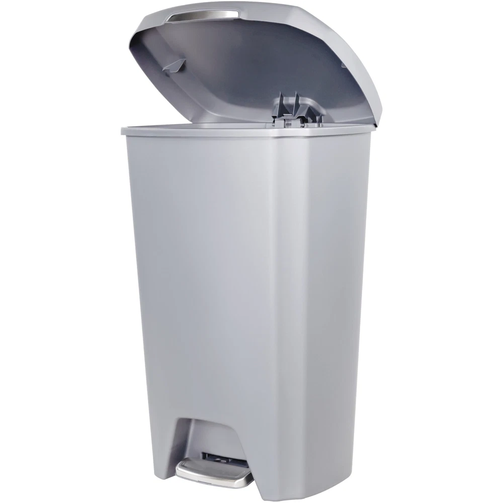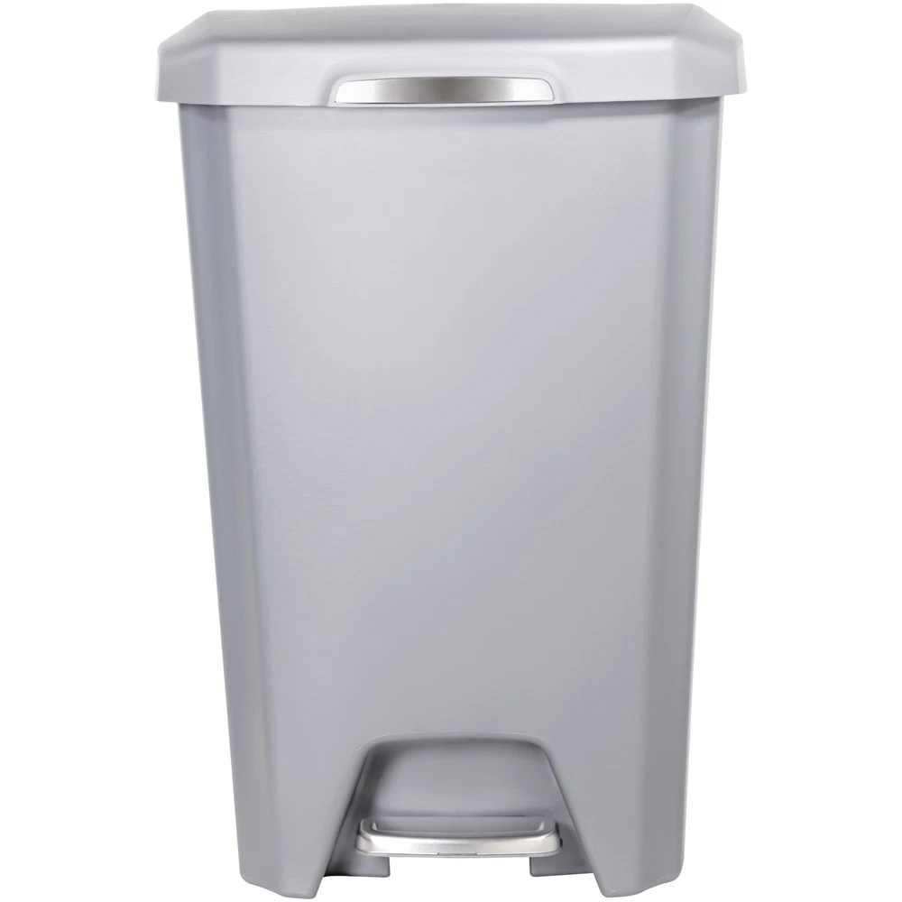 This Hefty Step On trash can in cement gray makes cleanup a breeze with its hands-free operation. Just step on the pedal to dispose and enjoy a silent, soft close. The brushed finish and stainless steel accents will elevate your space. Keep the trash bag secure by utilizing the notches at the top of the bin and change bags less thanks to the 12.1 gallon capacity. This stylish and functional waste solution is sure to take your space to the next level. On Feb 19, 2025 at 01:31:15 PST, seller added the following information: