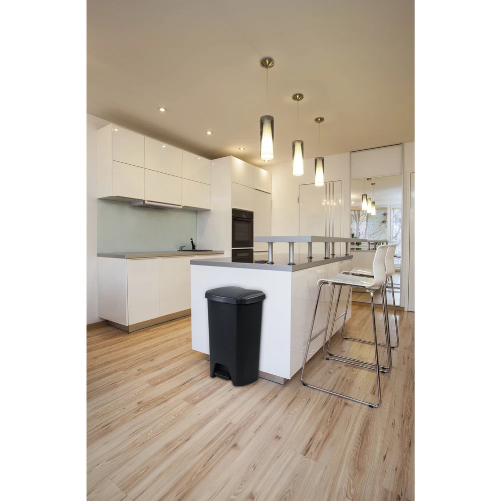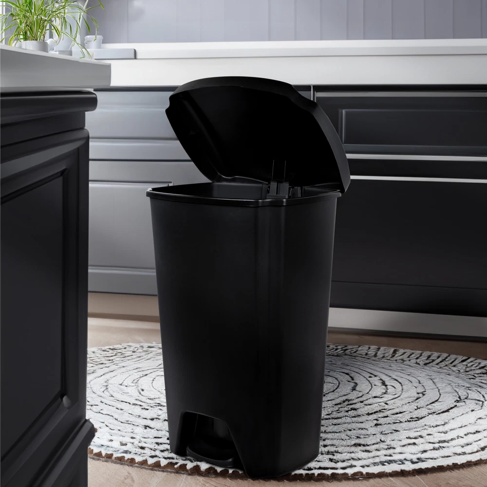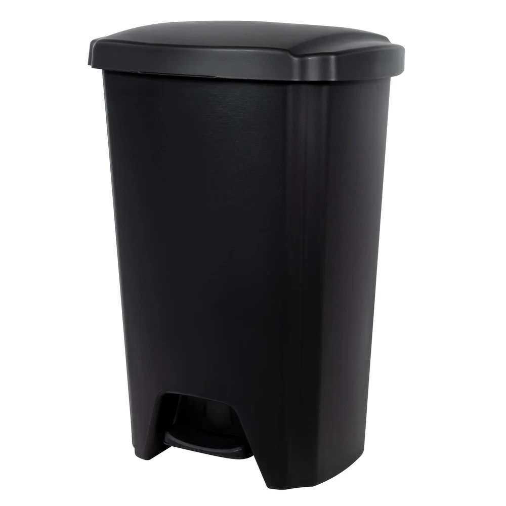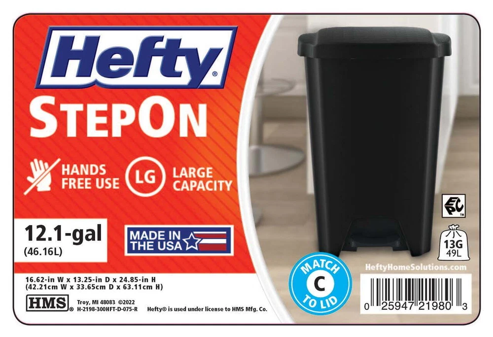 This Hefty Step On trash can in black makes cleanup a breeze with its hands-free operation. Just step on the pedal to dispose and enjoy a silent, soft close. Use with confidence, knowing that it has been engineered to withstand over 22,000 steps. Keep a 13-gallon trash bag secure by utilizing the notches at the top of the bin. This classic and functional waste solution is sure to be a household staple for years to come. On Dec 22, 2024 at 17:41:52 PST, seller added the following information: