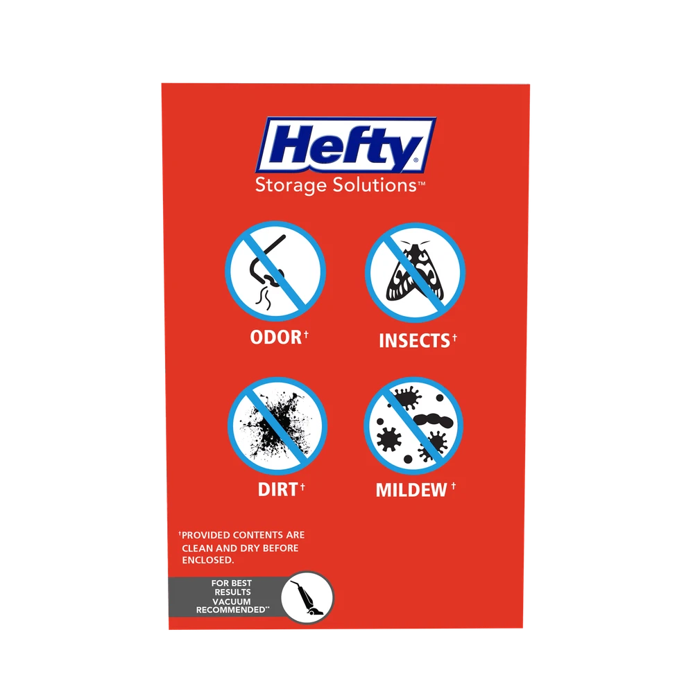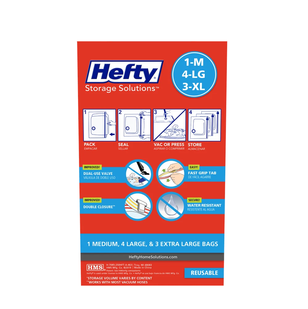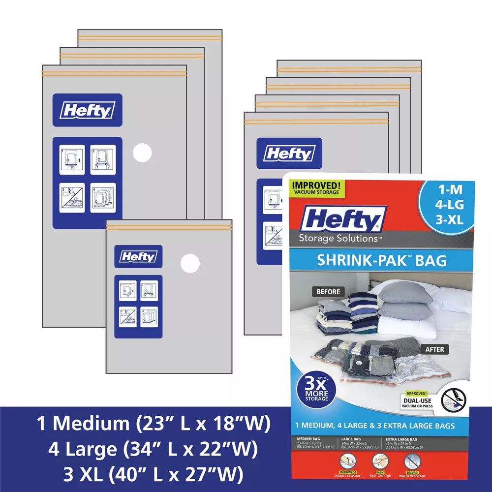 Maximize your storage capabilities with this SHRINK-PAK variety pack. Meet all your storage needs with these 3 different sized bags. The medium vacuum seal bag is ideal for switching out your seasonal wardrobe. You can easily store sweaters, shirts, sweatshirts, pants, and coats** in the medium bag. The large space saving bags are great for blankets and towels, while the XL bags can be used to store pillows and comforters. Fit these plastic storage bags under your bed, inside closets, or in basement storage rooms. These 8 space saving bags are also dual-use, so you can securely store your items with or without a vacuum. **Do not use to store fur or leather Features: Dual-use valve (vacuum or press)Double Closure with red/yellow zipper. Reusable. Water resistant. Up to 3 times more storage Hefty : The Toughest Name In Storage On Nov 6, 2024 at 04:19:48 PST, seller added the following information: