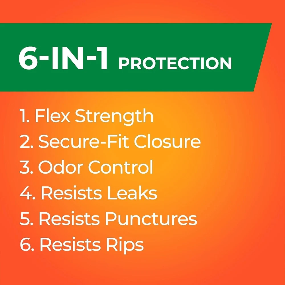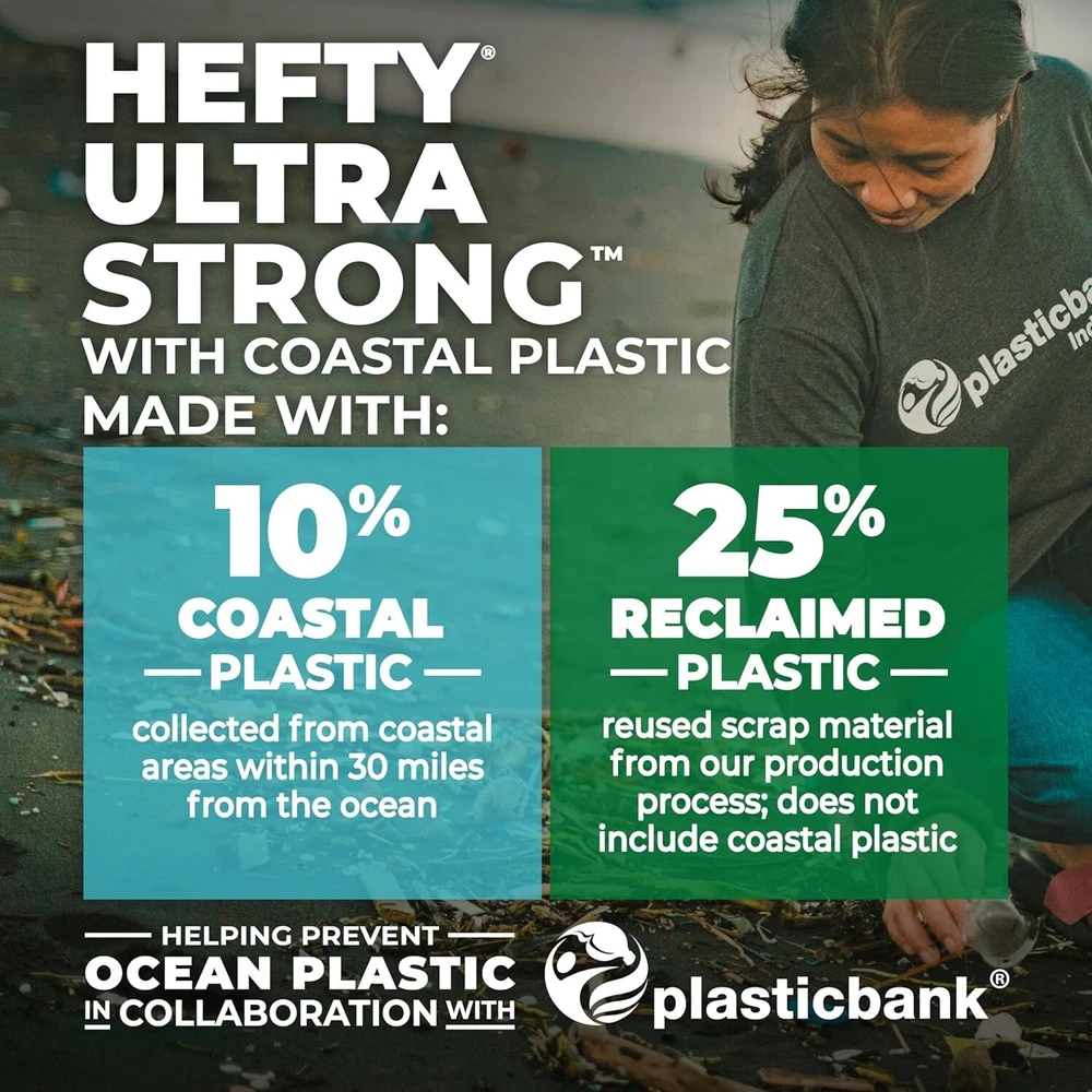 About this item Large Garbage Bags: This package contains 80 Hefty Ultra Strong Tall Kitchen 13 Gallon Trash Bags made with 35% recovered materials including 10% coastal plastic*, Gray, Seaside Breeze Scent Continuous Odor Control: Tall kitchen trash bags with continuous odor control and a Seaside Breeze scent to fight nasty odors and keep your kitchen smelling fresh 6-IN-1 Protection: Flexible scented large trash bags are made from coastal and reclaimed plastic and offer 6 points of protection to keep garbage where it belongs: flex strength, tough drawstring, odor control, and resistance to leaks, punctures, and rips Dependable Drawstring Closure: The durable drawstring on these kitchen garbage bags makes it easy to transport heavy loads, donations, seasonal items and more 100% Satisfaction Guarantee: We want you to be happy with your Hefty trash bags 13 gallon size, if you have any issues, please contact us via the hotline number on the back of the package so we can help
