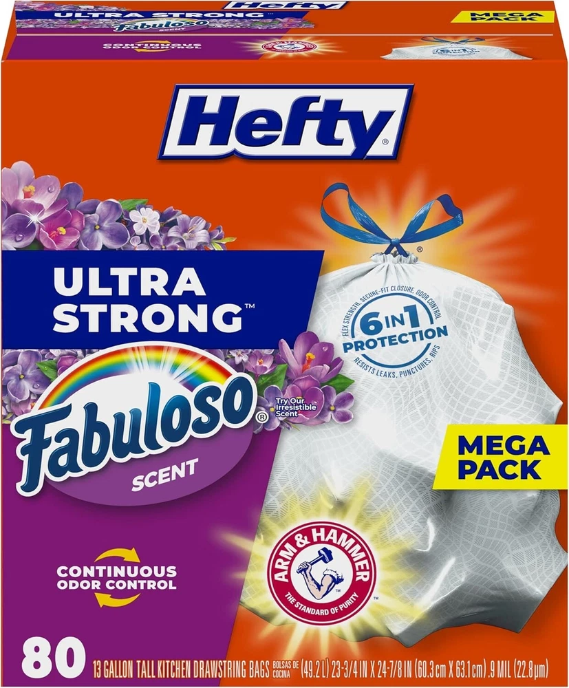 Hefty Ultra Strong 13 Gallon Kitchen Trash Bags β 80 Count, Fabuloso Scent πΈποΈ π Superior Strength & Odor Control for a Fresh, Clean Kitchen! π Upgrade your kitchen cleanup with Hefty Ultra Strong 13-Gallon Trash Bags ! These tough, reliable bags feature a break-resistant drawstring , 6-in-1 protection , and the fresh scent of Fabuloso , powered by Arm & Hammer Odor Control to fight unpleasant smells. Perfect for everyday messes, these trash bags ensure leak, rip, and puncture resistance , making them a must-have for any home! πΉ Includes: 80 Hefty Ultra Strong Tall Kitchen Bags πΉ Size: 13 Gallon β Fits Most Kitchen Trash Cans πΉ Scent: Fabuloso πΈ β Keeps your home smelling fresh πΉ Odor Control: Arm & Hammer Patented Technology ππ«π πΉ Strength: Leak-proof, rip-resistant, and extra durable πͺ πΉ Secure Drawstring: Break-resistant for easy closure & carrying π― π· Check out the images for more details! π· β Perfect for kitchens, offices, and everyday household use! β Ships fastβorder today for a cleaner, fresher home! ππ¦ #HeftyTrashBags #KitchenCleanup #OdorControl #13GallonBags #FabulosoScent