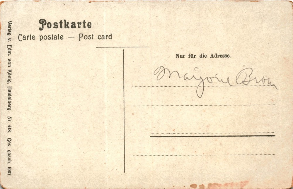 The postcard depicts Heidelberg Castle, a famous landmark in Heidelberg, Germany. The publisher of the postcard is Edm. von König, based in Heidelberg, and the card is numbered 418, with a copyright date of 1907. The postcard is intended for the address only, with a note mentioning Major Brow.