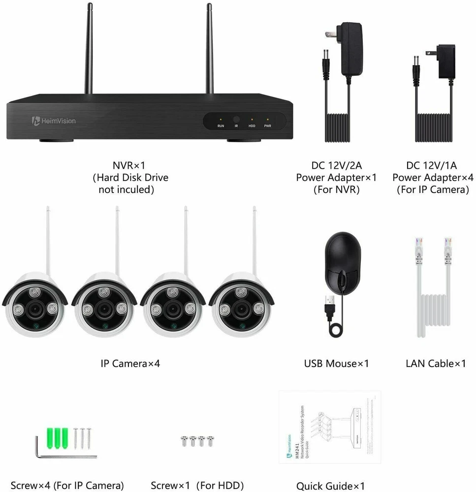 EL_Star Store Store Categories Store Categories Projector Tablet & PC Home Security Drone Electronic Home & Garden Other HeimVision Wireless Security Camera System 8CH NVR 12'' LCD Monitor Outdoor CCTV Item Description HeimVision HM243 1080P Wireless Security Camera System with 12 inch LCD Monitor, 8CH NVR 4Pcs Outdoor/Indoor WiFi Surveillance Cameras • Note 1: Hard Drive is NOT Included (HDD means Hard Drive Disk) • Note 2: Wireless means wireless Internet connection, but also need to be plugged in the power supply/outlet for 24/7 recording. Wireless Camera is different from Wire-free camera, the power cable is still required to get electricity for 24/7 surveillance purposes. Wireless means that there is no video cable between cameras and NVR, easy to install. Features: All-in-One and Easy Setup: Heimvision wireless CCTV camera system features a 12" full HD 1080P monitor (Not Touch Screen). The wireless cameras and NVR monitor are auto-paired during the factory setting. Just need to connect the wireless cameras and NVR with Power Supply provided for 24/ 7 surveillance purposes. Perfect for villa, home, office, shop, hotel, warehouse, school, business or elsewhere. (Wireless means wireless Internet connection, but also need to plug-in power supply) IP66 Weatherproof Security Camera: Records in 1080P Full HD to capture sharp and crisp images, provide crystal-clear HD live video, ensures crisp smooth footage day and night with 2.0 Megapixel bullet cameras. 1080P NVR is an HD video recorder for recording, transmission, and storage, etc. (Hard drive MAX 6TB support. Not Included HDD). Up to 15m Night Vision. The IP cameras are rated as dust-tight and waterproof and cover with durable housing. Best choice for your outdoor home security. Motion Detection and Email Alert: HeimVision wireless surveillance camera system provide to minimize false alarms. Smart notifications with email/ snapshot alerts will be pushed to your smartphone via iPhone/ Android App when motion is detected. Customize your own detection plan and zone for each camera, you will get extra peace of mind by receiving instant alerts and get notified of what’s happening. Mobile Remote Viewing: Connect the NVR to the home router via Ethernet cable provided, then download free app ''HeimKits'' into your mobile device. This video recorder system supports video preview, recording, sync-playback, backup, motion detection, and email alarm. You can remote access simultaneously on smart devices(IOS、Android) at any time, anywhere with WiFi/ 2G/ 3G/ 4G on smart Phone, Pad, and PC. You’ll never miss out on a moment with remote and local playback, no matter where you are. Robust Quality and Service: Security camera system boast a durable and long-lasting design. With well-experienced engineers and dedicated support team, we are always standing by your side and ready to help you. If you have any questions, please feel free to contact us. The expandable system can support up to 8 cameras. Comes with 1x 8-channel 1080P LCD NVR and 4 x 1080P wireless IP66 Cameras. Additional cameras can be purchased on our front store: CA01 Extra camera. Technical Specifications: Product Dimensions: 12.6 x 7.1 x 10.6 inches Item Weight: 8.5 pounds Camera Resolution: 1080P Angle of Field: 110° Night Vision Range: 50ft Power Input: DC 12V 1A for cameras Power Input: DC 12V 2A for the NVR APP: HeimKits PC Client: Eseecloud What’s in the Box: 1 x 8CH 1080P Wireless Network Video Recorder (12inch Monitor Wireless NVR) 4 x 1080P 2.0MP IR LEDs IP Cameras with 5DB Extension Antenna 4 x 10FT Power Supply (12V/1A) Power Adapter for Security Cameras 1 x 3.3FT Power Supply (12V/2A) for NVR recorder 1 x Screw for Hard Drive' Installation 4 x Screw for Bullet Cameras' Installation 1 x 3.3FT Network Cable 1 x USB Mouse 1 x User Manual HeimVision HM241 Wireless 1080P HD Security IP Camera System 8CH NVR WIFI Night Vision * Note 1: Hard Drive NOT Included (HDD means Hard Drive) , only supports 2.4G wifi , not support 5G , The PTZ Camera could not de added to the NVR system. * Note 2: Wireless means wireless Internet connection, it is not battery camera , it is powered via the US plug ( included) Specifications NVR/DVR Box : 8-Channel NVR Box Resolution: 1080P Camera Resolution: 4Pcs/ 1080P Hard Drive: Not included Free App: Heimkits/ IP Pro Connection Type: LAN Cable/ 2.4G WiFi Display: HDMI/ VGA Weatherproof : IP66 Night Vision: 65ft Features: Motion Detection, Email Alert, Video Loss Alert, Privacy Protection Features: Plug & Play and Easy Setup: The wireless cameras are paired with the NVR system at the manufacturing site. Just power on and serve yourself with 24/7 surveillance. Perfect for villa, home, office, shop, hotel, warehouse, school, business or elsewhere you wish. (Refer to the manual for further usage) IP66 Weatherproof Security Camera: Records in 960P HD to capture crisp images, provide HD live video, ensures smooth footage day and night with 1.3 Megapixel bullet cameras. Up to 50ft Night Vision. The IP cameras are rated as dust-tight and waterproof. Best choice for your outdoor home security Motion Detection and Email Alert: Smart notifications with email/ snapshot alerts will be pushed to your smartphone when motion is detected. Customize your own detection plan and zone for each camera, you will get extra peace of mind by receiving instant alerts and get notified of what's happening to your smartphone via iPhone/ Android App Infrared. Clear Day Night Vision: Featuring 3.6mm LEDs with IR CUT function, 110 viewing angle, 50ft Night Vision range. The camera's infrared mode is automatically activated in low lighting conditions. It can clearly monitor everything even at night. Mobile Remote Viewing: Connect the NVR to the router then download the free app ''IP Pro'' into your Phone, Pad, or PC. You can remote access simultaneously on smart devices at any time, anywhere with Wi-Fi/ 2G/ 3G/ 4G. You will never miss out on a moment with remote and local pla