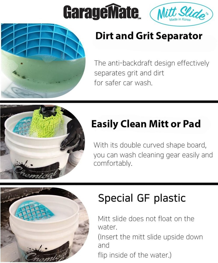 The Anti-Backdraft Design Effectively Eliminates Grit And Dirty Particles From Your Cleaning Mitt Or Towel To Enjoy A Scratch Free Car Wash Easily Cleans Mitts, Towels or Pads on the Sleek Double Curved Shaped Board Simple and Fast Installation: Insert the Mitt Slide Upside Down in a Water Filled Bucket and Flip! Mitt Slide is Designed to fit in Any Standard 3 or 5 Gallon Buckets (14-16 Liters)
