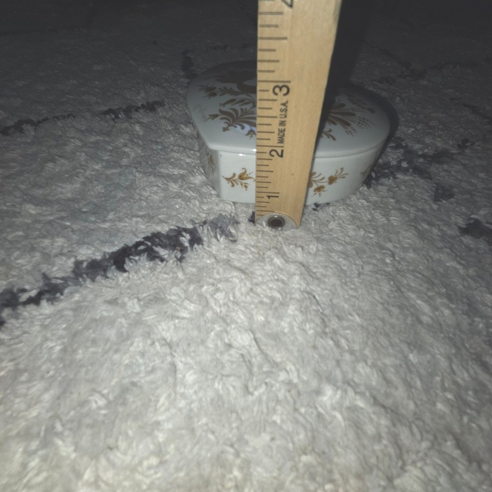 A touch of romance arrives in this heart-shaped trinket box, perfect for safeguarding your most cherished keepsakes. The lid features a delicate design of stylized birds and floral accents in shimmering gold, adding a touch of elegance to any space. Inside, a sweet inscription in German, "Ich hab Dich lieb" (I love you), adds a personal and heartfelt touch. This charming box is ideal for holding jewelry, small mementos, or as a decorative piece on a vanity or bedside table. It would also make a thoughtful gift for a loved one on Valentine's Day or an anniversary. Keywords: Heinrich, Porcelain, Trinket Box, Heart Shaped, Birds, Gold Accent, Germany, Vintage, Keepsake Box, Jewelry Box, Decorative Box, Romantic Gift, Valentine's Day, Anniversary Gift