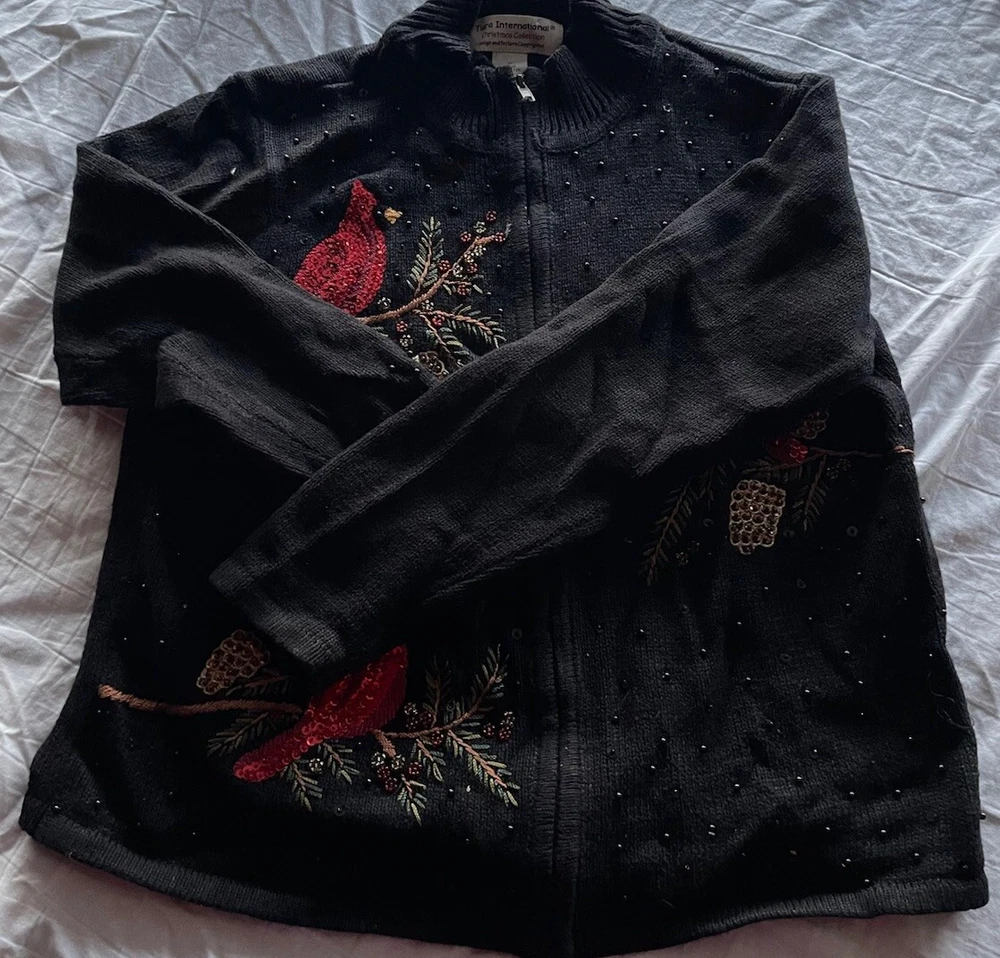 Get into the holiday spirit with this stunning Heirloom Collectibles Christmas cardigan sweater! Featuring a beautiful pattern of birds in black, red, green, yellow, and multicolor, this sweater is perfect for any Christmas occasion. The long sleeves and round neckline provide warmth and comfort during the chilly winter season, while the cotton blend material ensures a soft and cozy feel. This sweater is a size L and is designed for regular size women. It features a full zip and is accented with sequins for a touch of sparkle. The vintage and classic style makes it a perfect addition to any wardrobe, while the graphic print adds a fun and playful touch. Ideal for Western, Christmas, animals, winter, holiday, colorful, classic, ugly sweater, and 90s themes, this sweater is sure to make a statement. Hand-wash only for optimal care and maintenance.