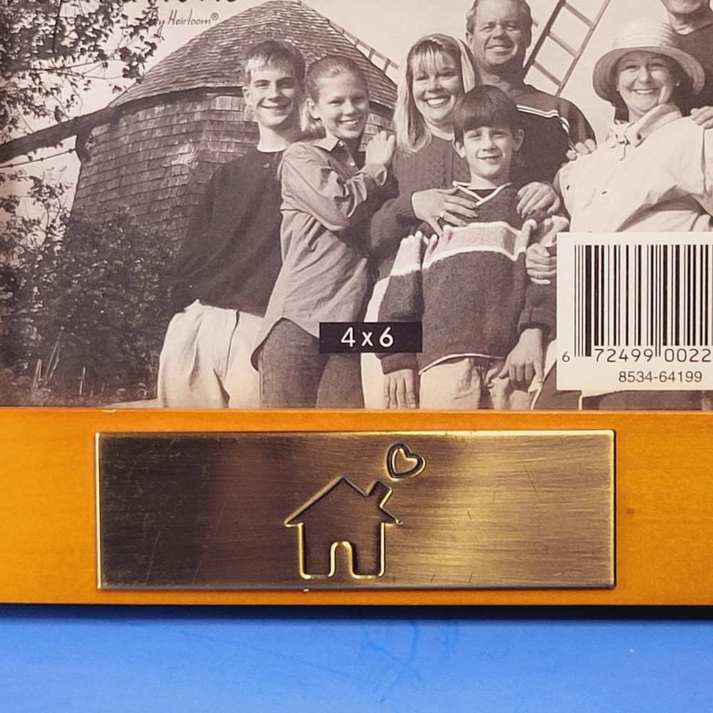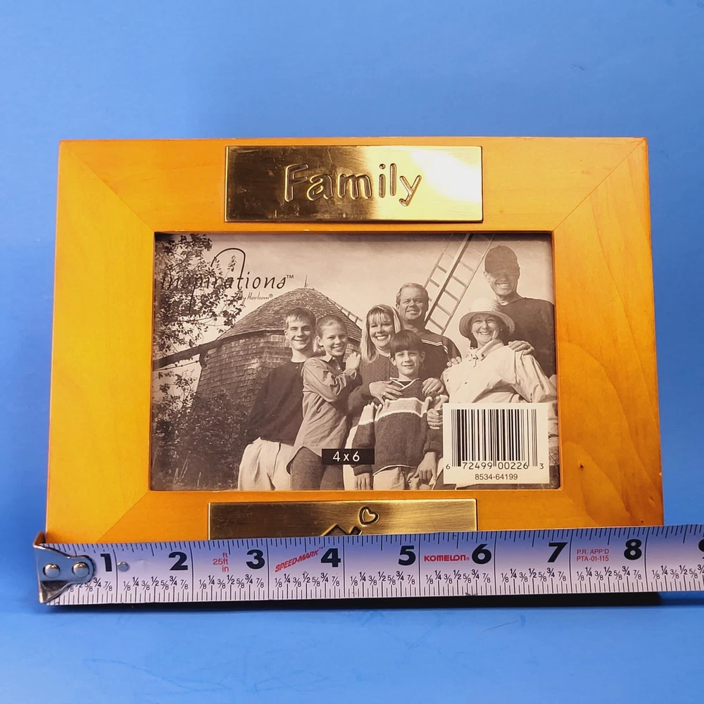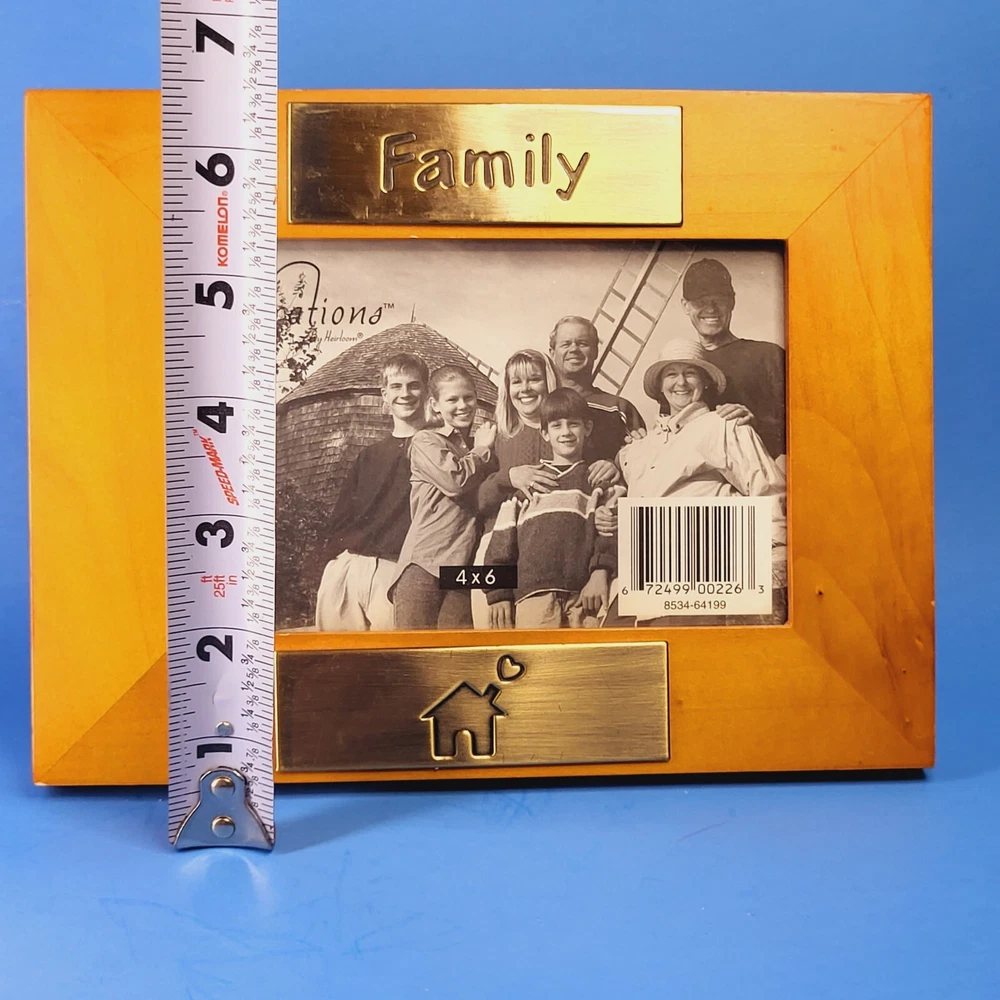 Inspirations by Heirloom picture frame Wood with brass-look accents - "Family" Fits horizontal photo size 4" x 6" Frame size 8.25" x 6.5" Easel back Thank You!