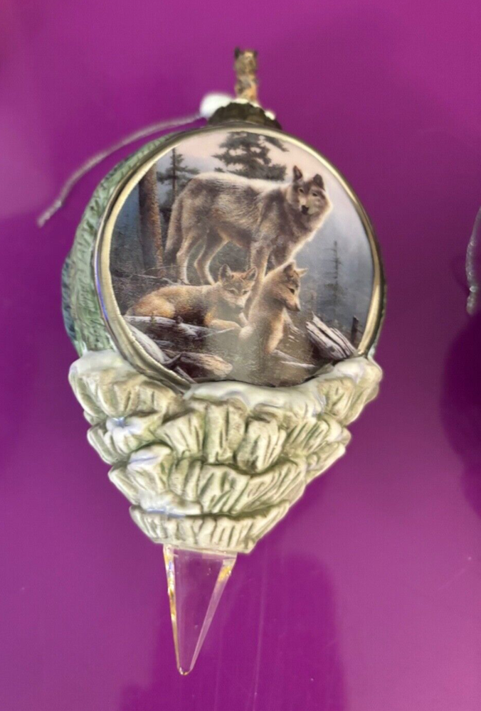 Experience the allure of the great outdoors with the Call Of The Wilderness Heirloom Porcelain Bauble from Bradford Exchange. This exquisite piece is crafted from high-quality porcelain, ensuring a delicate and timeless charm that complements any Christmas decor theme. Perfect for the holiday season, it's designed to capture the essence of nature's serene beauty. Whether displayed on your mantle or as part of a festive table spread, this bauble is sure to add a touch of elegance and warmth to your celebrations. Set includes : “Howling Lesson”, “Night Watch”, and “First Outing” #A4648 Never used/out of box Smoke Free home
