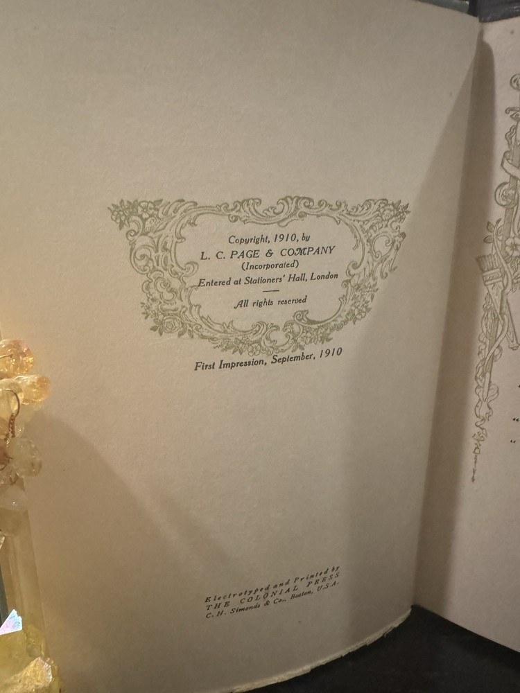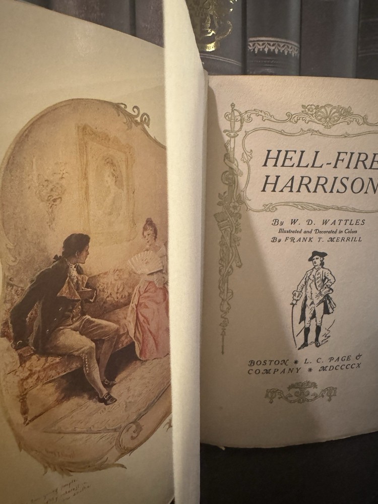 A rare early-20th-century first edition by renowned New Thought author Wallace D. Wattles, best known for The Science of Getting Rich. Hell-Fire Harrison is his only novel, a moral and spiritual drama of transformation, set in England and America, vividly illustrated by Frank T. Merrill. Printed on quality rag paper, with ornate title design and a full-color frontispiece. • Excellent antique condition. • Clean, tight binding; no loose or missing pages. • Original light-blue cloth cover with gilt and illustrated front panel — bright and well-preserved. • Interior pages clean with minimal toning for age. • All color illustrations intact and vibrant. • A remarkable example of a 115-year-old first impression. This first impression, September 1910 precedes later printings and reissues. Scarce in such condition — a beautiful collectible for New Thought enthusiasts, antique book collectors, or admirers of early 20th-century literature and design.