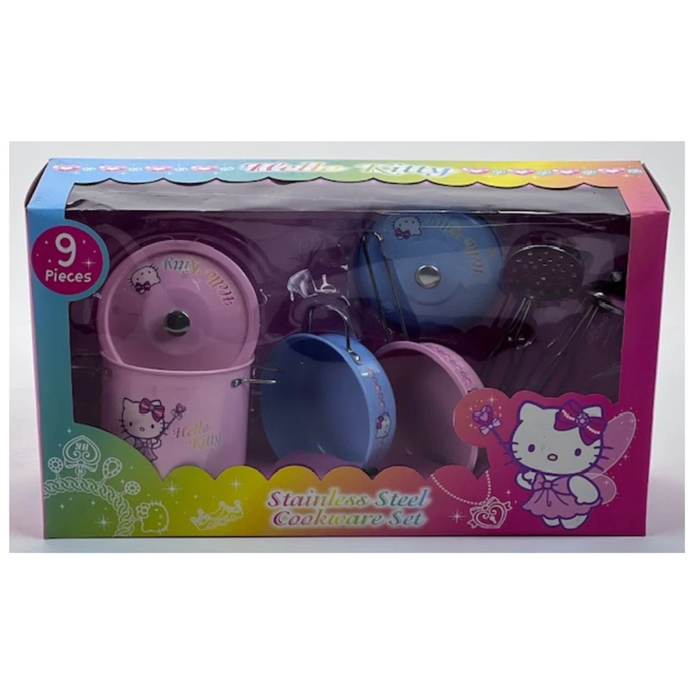 This 9-piece cookware set is perfect for kids who love to cook and play with Hello Kitty. The set includes stainless steel pots and pans in various sizes, all adorned with the iconic Hello Kitty character. The pink color adds a fun touch to the kitchen and is sure to delight young chefs. The set is suitable for children aged 4-7 and is part of the Hello Kitty character family. It is a great addition to any kitchen or playtime toy collection. Let your child's imagination run wild with this fun and functional cookware set. Hello Kitty 9-Piece Stainless Steel Cookware Set for Kids Contents: 1 diameter stock pot 2 pans 2 lids 1 slotted spoon 1 ladle 1 spaghetti fork 1 spatula