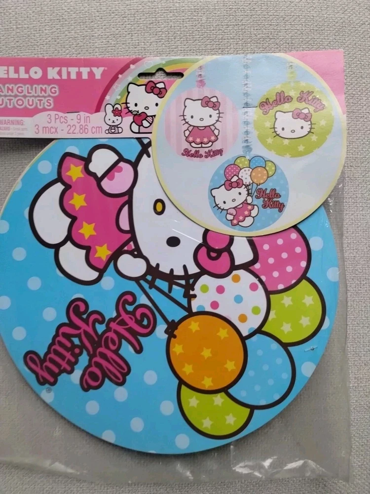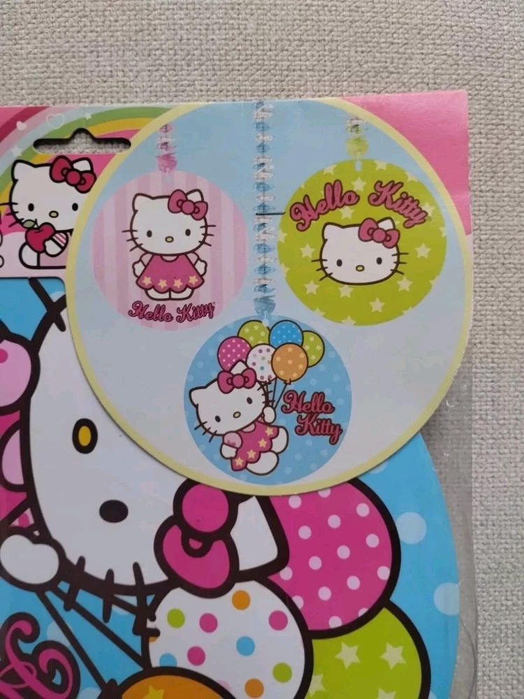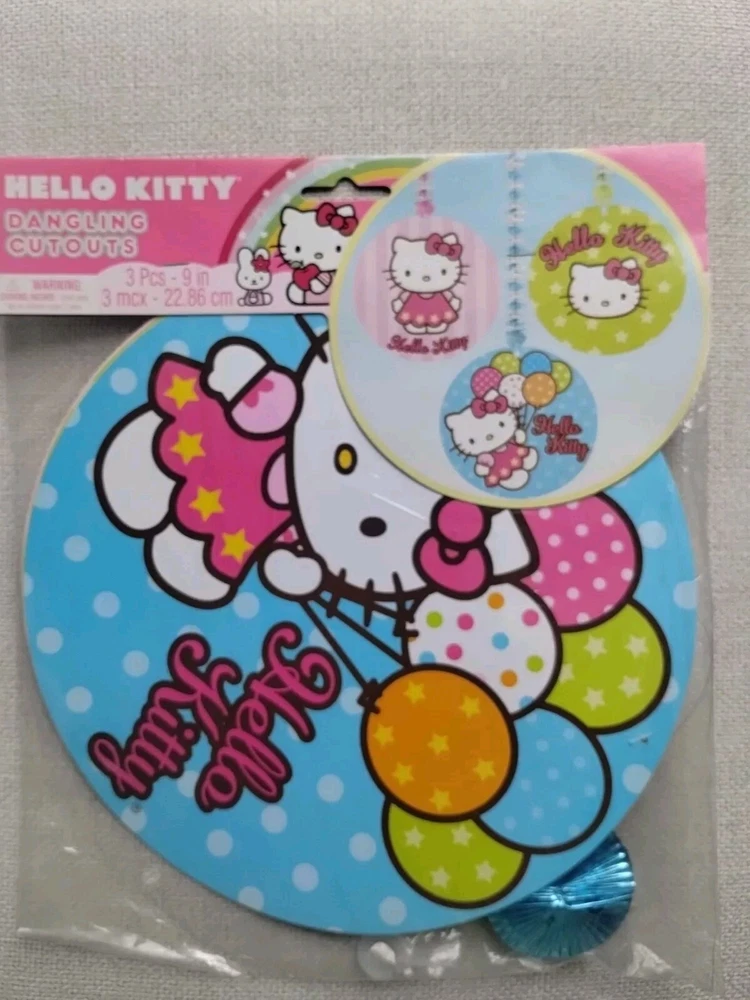 The product is a set of Hello Kitty birthday party decorations featuring dangling cutouts. The decorations are made of cardboard with a foil production technique, showcasing the popular Hello Kitty character in a multi-color design. Perfect for a child's birthday celebration, these party deco items are brand new and come from the Amscan brand. Ideal for creating a fun and festive atmosphere at the party. Track Page Views With Auctiva's Counter