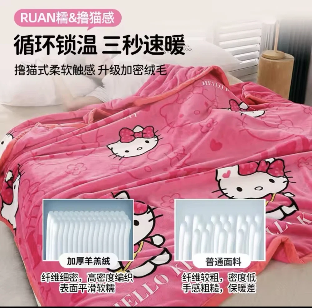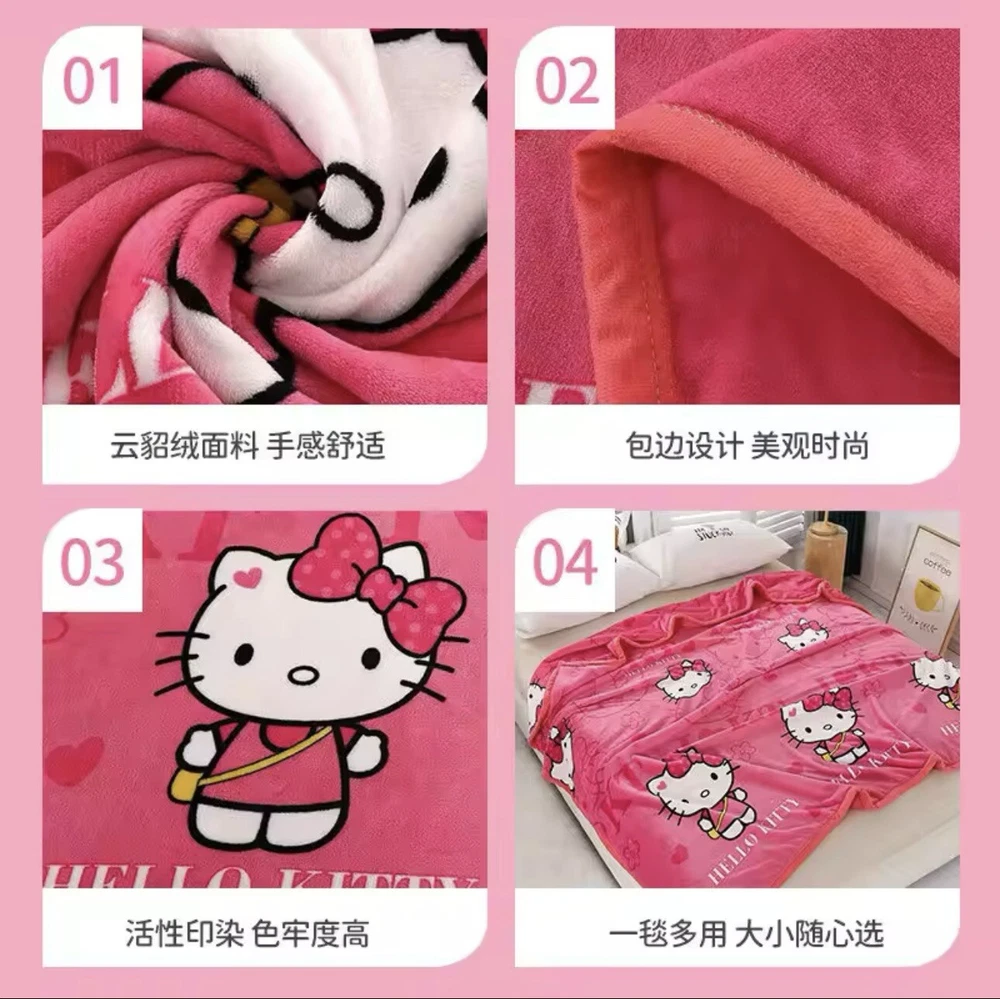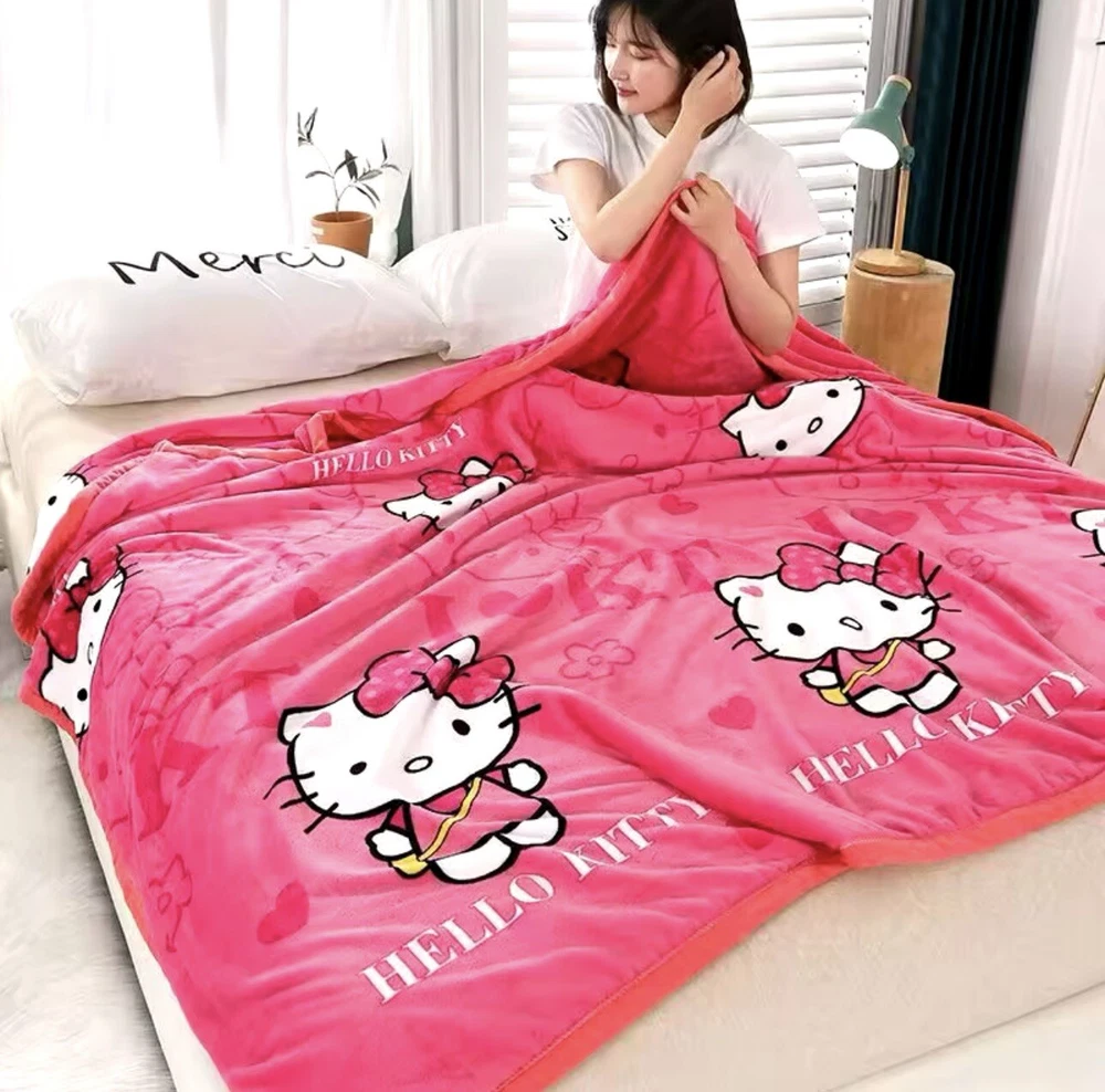 Snuggle up with this adorable Hello Kitty Cartoon Blanket. Made of soft and warm flannel material, this blanket is perfect for any bedroom. The blanket features a cute and cozy Hello Kitty design that will add a touch of fun to your home decor. The blanket is ideal for those who love to lounge around the house or use it as an extra layer of warmth on the couch. The blanket is machine washable, making it easy to clean and maintain. Get this Hello Kitty Cartoon Blanket today and add some feline charm to your home.