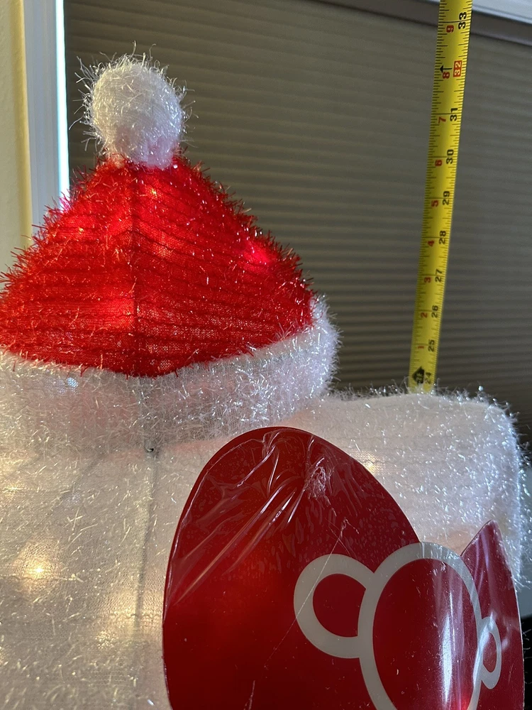 Add a touch of holiday cheer to your home with this rare and jumbo Hello Kitty Christmas 28" 3D lighted electrical figure. The beloved character, brought to you by Kurt Adler in collaboration with Sanrio, is dressed in festive attire and ready to spread some Christmas joy. The figure is made of high-quality materials such as fabric, wire, electrical wire, and plastic, ensuring durability and longevity. This collectible piece is perfect for fans of the Hello Kitty franchise and animation merchandise alike. Despite the box being damaged, the figure is in excellent shape and will make a great addition to any collection. Don't miss your chance to own this special 2012 edition of the Hello Kitty Christmas 28" 3D lighted holiday decor. Has never been used except to put together to take pictures. Included is the original zip ties, instructions, and ground stakes if needed. The clear plastic is still on the tin bow (see closeup picture) It was stored in the original box (box has lots of storage damage). Extremely hard to find!!