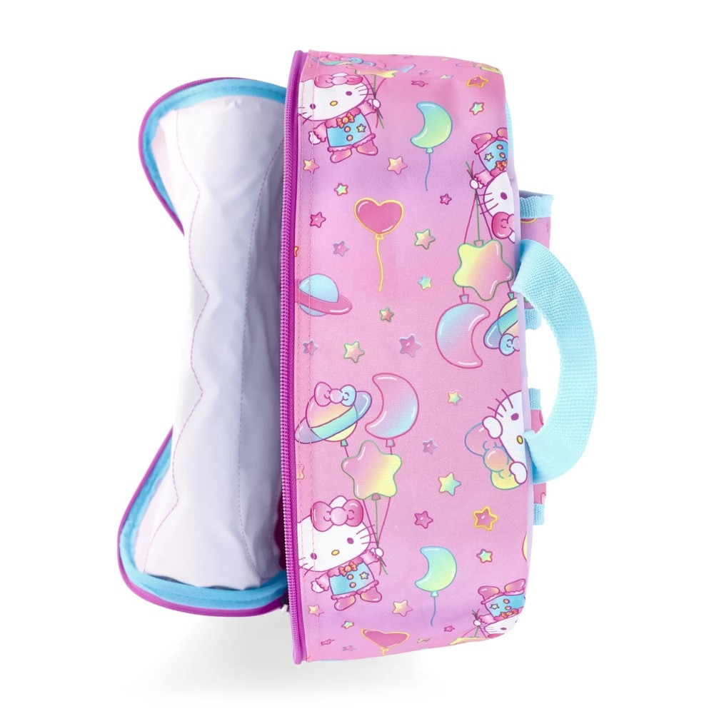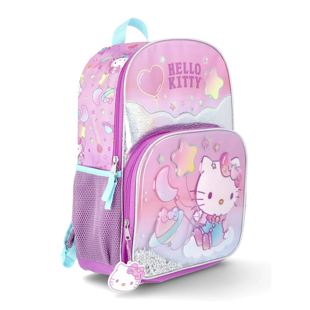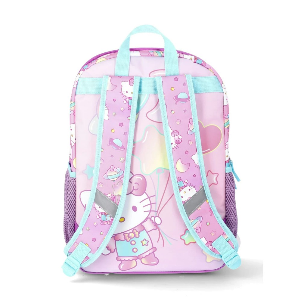 Sanrio Hello Kitty "On A Cloud " Girls' 17" Graphic Backpack and Keychain Material: 100% Polyester Care: Wipe clean Country of Origin: Imported Dimensions: 17" H x 12" W x 5" D Closure: Top zip Straps: Adjustable with reflective detail; foam mesh undersides Pockets: One main compartment; one front pocket; padded laptop pocket; two foam mesh pockets for water bottle Features: Inside backwall printed ID tag; waterproof base; approx. 4" drop length; all over print on gusset; ball chain; Hello Kitty molded graphics Copyright: © Sanrio, All Rights Reserved Hello Kitty On A Cloud Graphic Backpack for Girls from Sanrio