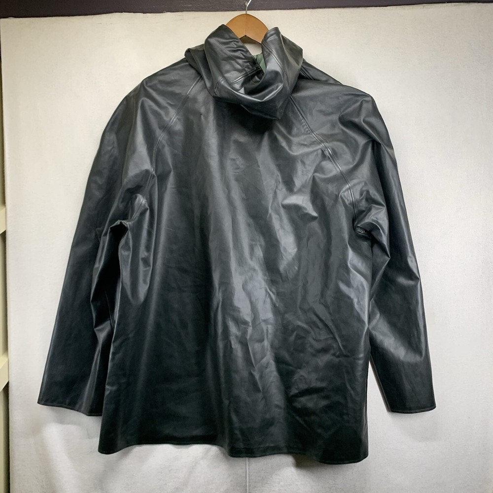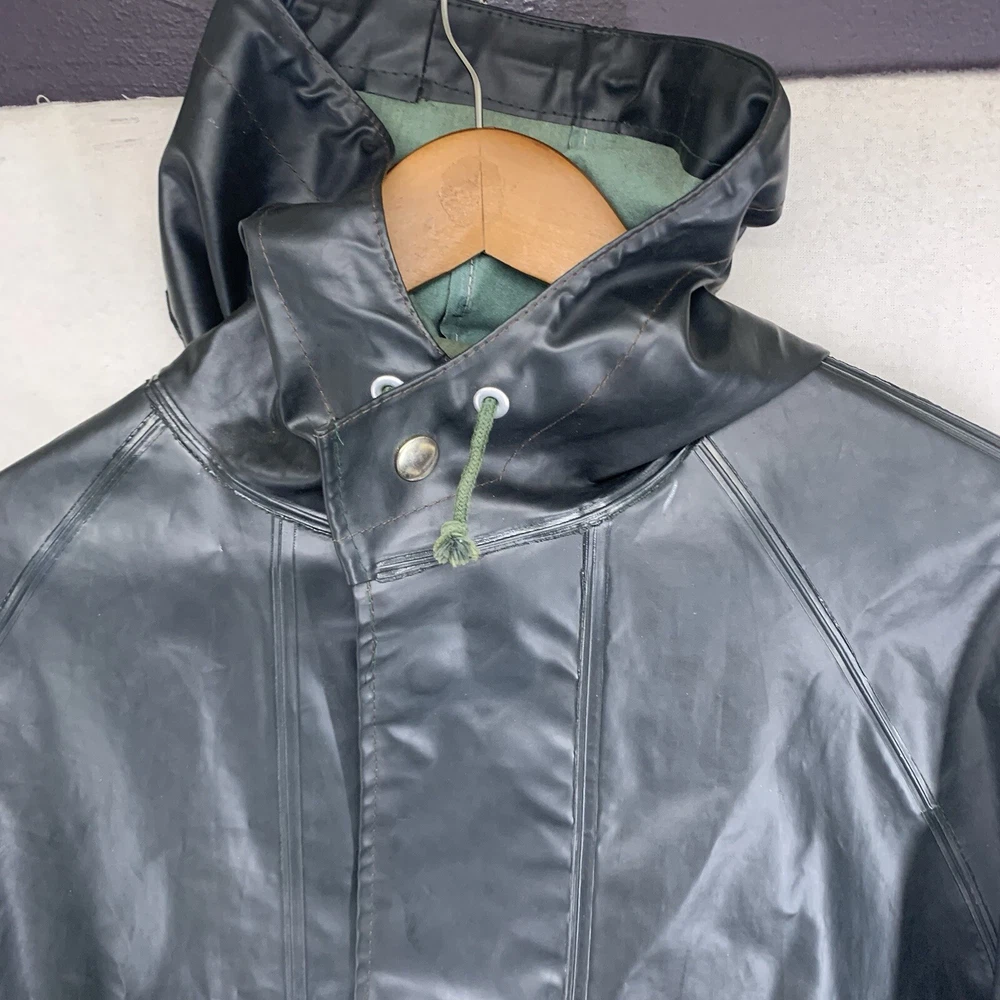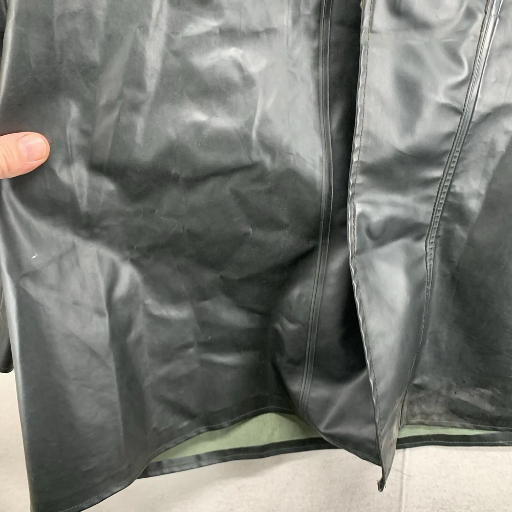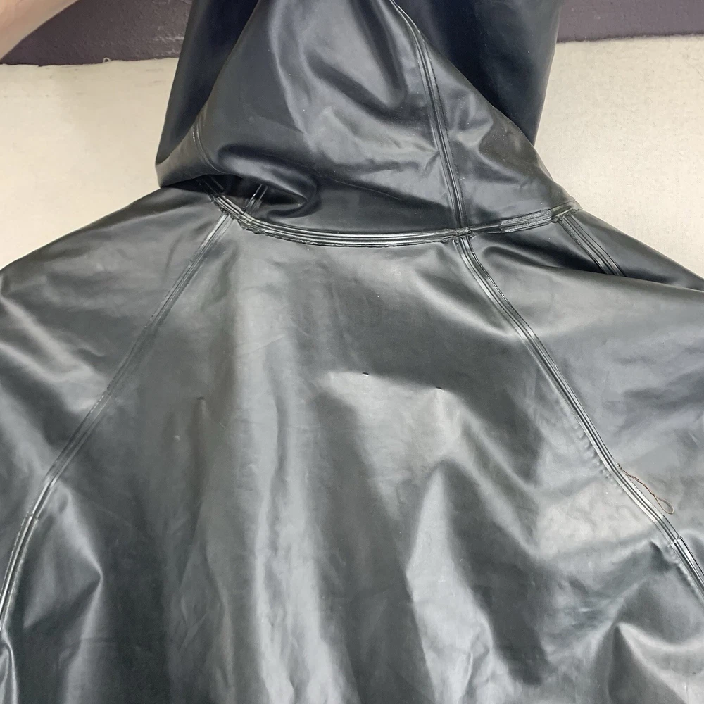 This Helly Hansen Rain Coat is a vintage-style piece designed for men in size L. Made from PVC material, it features a solid black color with a snap closure and button accents. The coat is waterproof, making it ideal for outdoor activities like fishing and hunting. With a hood and a regular fit, this coat provides protection from the elements while maintaining a classic and practical style.