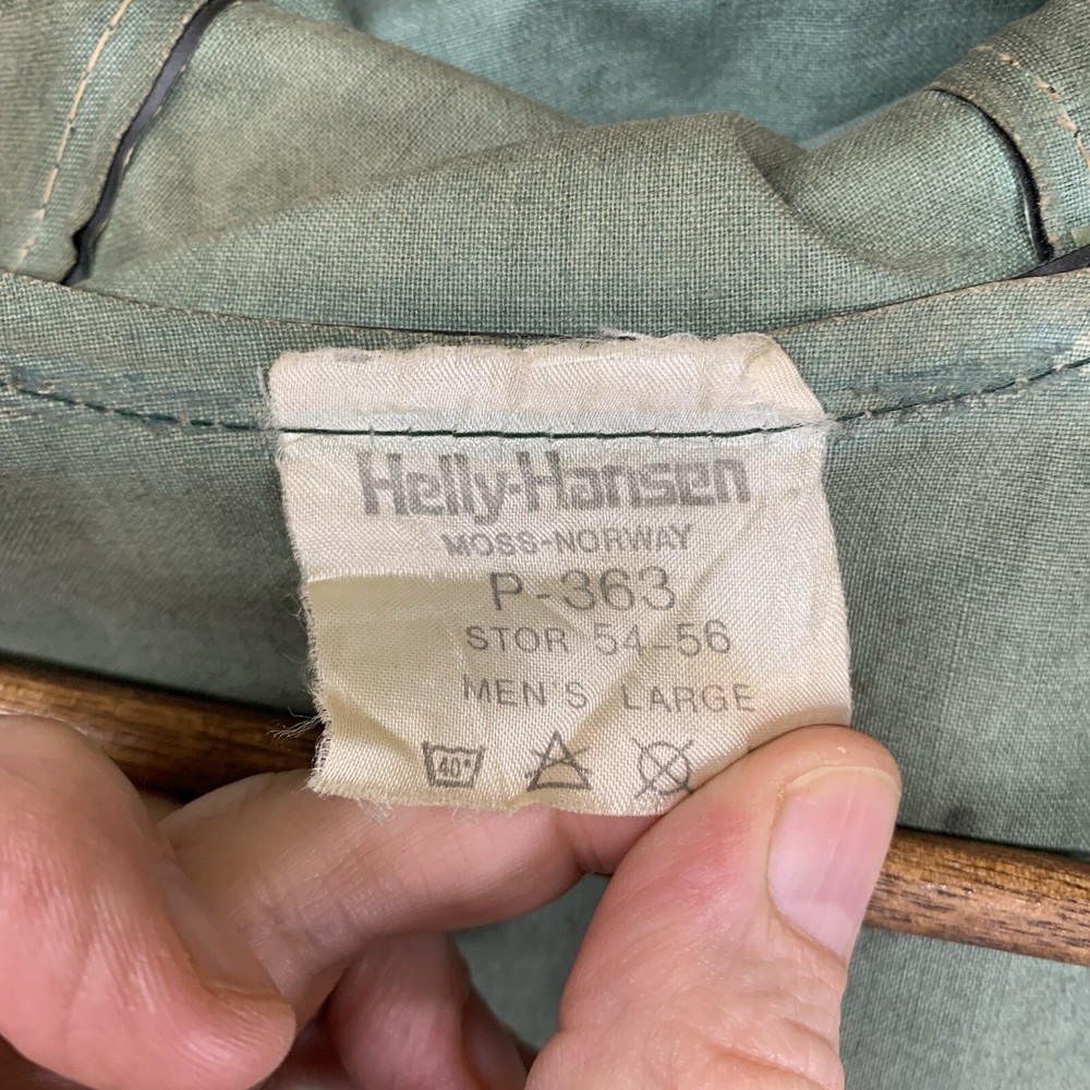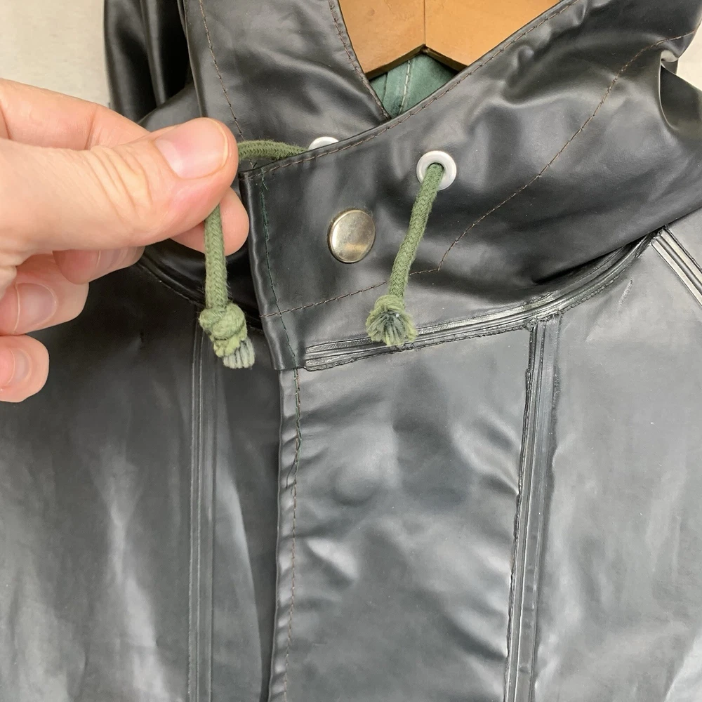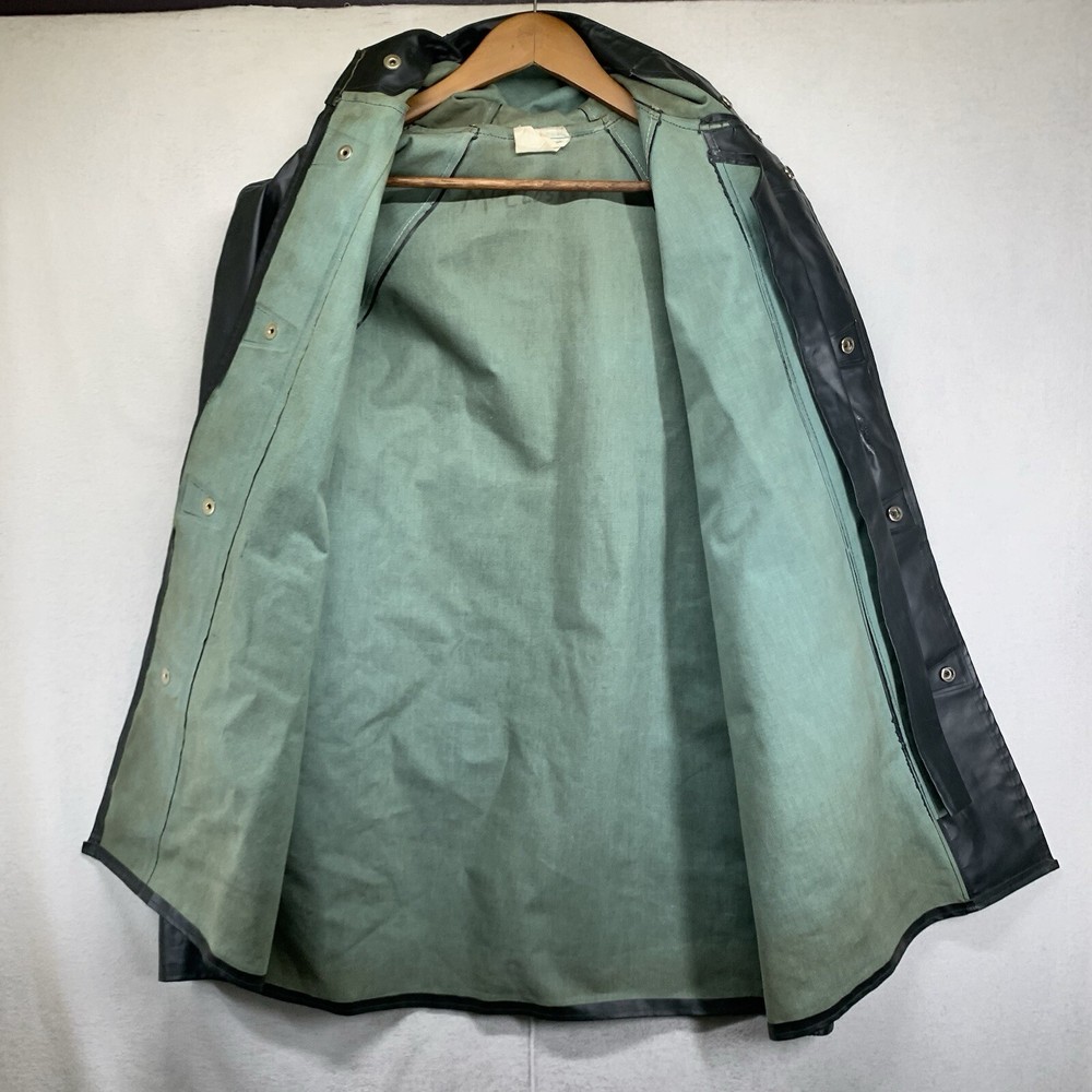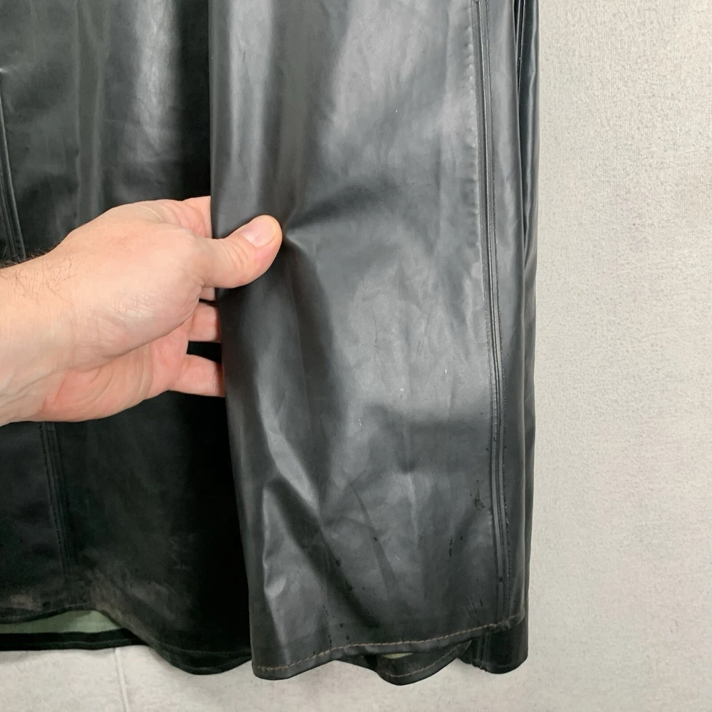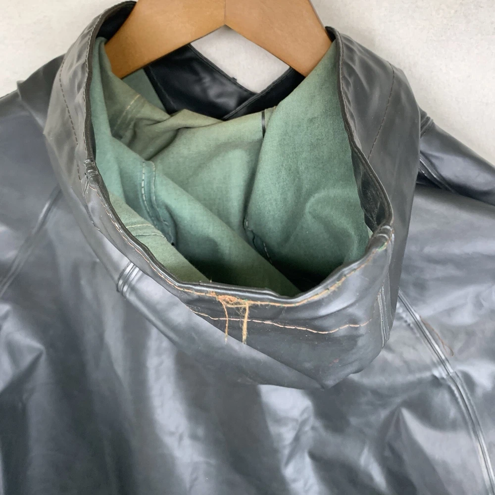 This Helly Hansen Rain Coat is a vintage-style piece designed for men in size L. Made from PVC material, it features a solid black color with a snap closure and button accents. The coat is waterproof, making it ideal for outdoor activities like fishing and hunting. With a hood and a regular fit, this coat provides protection from the elements while maintaining a classic and practical style.
