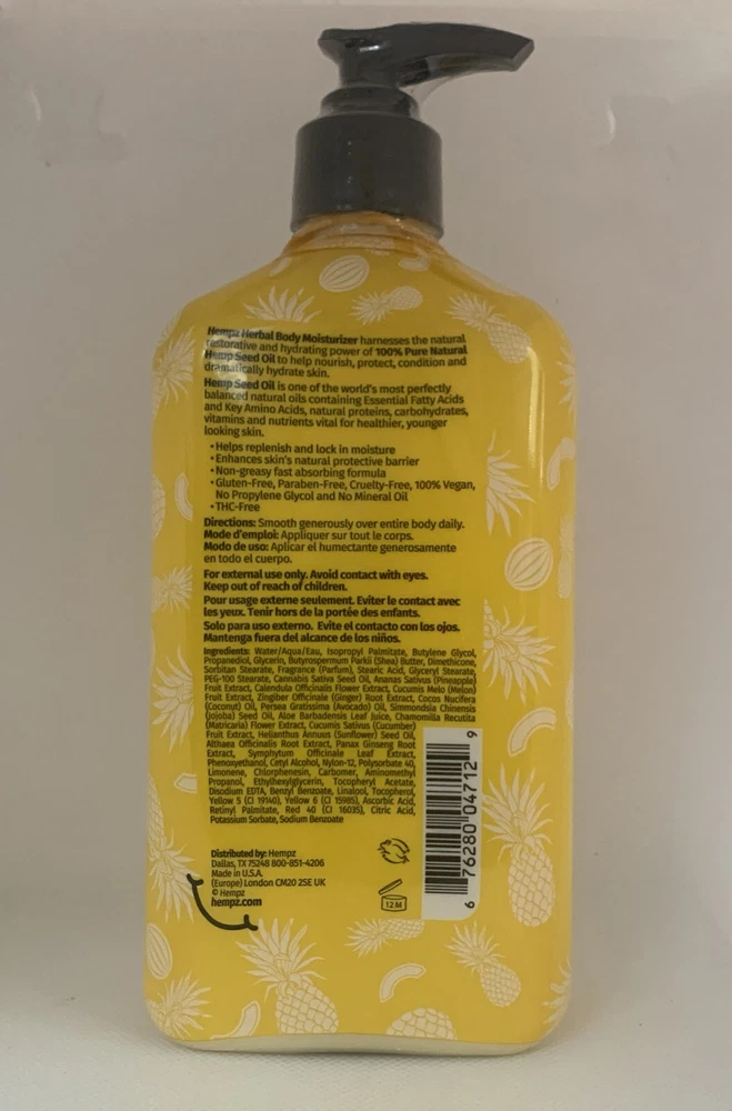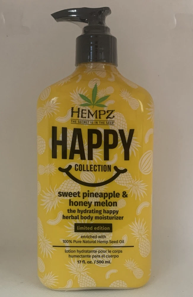 Hempz Happy Sweet Pineapple & Honey Melon Body Lotion Full Size 500/17fl.oz. LIMITED EDITION SEALED. Hydrate skin with our uplifting hydrating happy herbal body lotion. It contains plant-based ingredients rich in vitamin C to help rejuvenate skin. 17-ounce pump bottle.