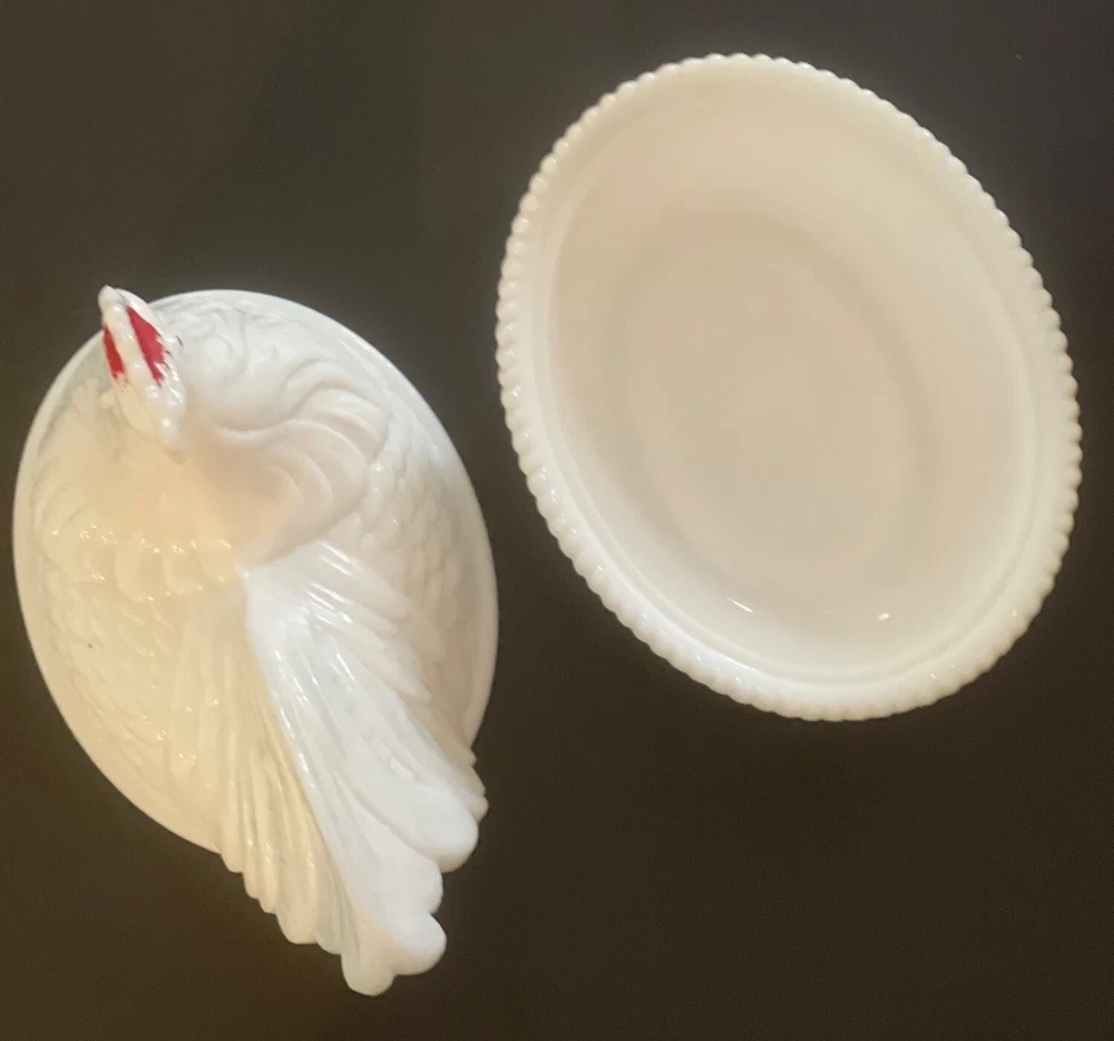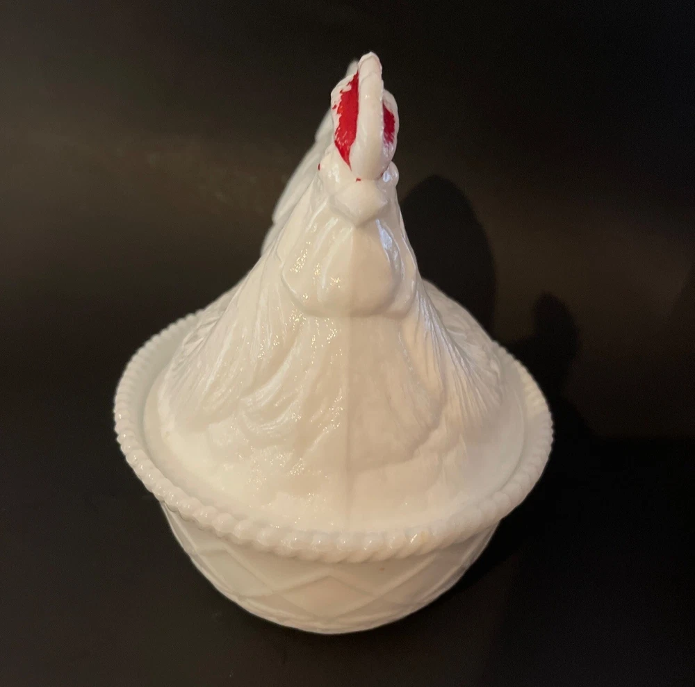 Westmoreland Rooster on a Nest White Milk Glass MCM Split Tail 8" x 6" Vintage 1950's This piece is in great vintage condition. There is paint loss on the eyes and comb but no cracks or chips. Shipping weight is over 4 pounds from Florida
