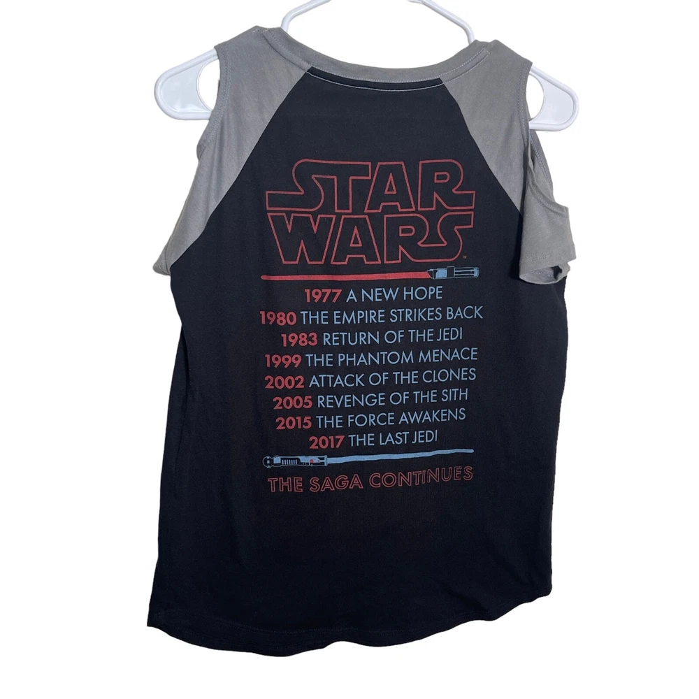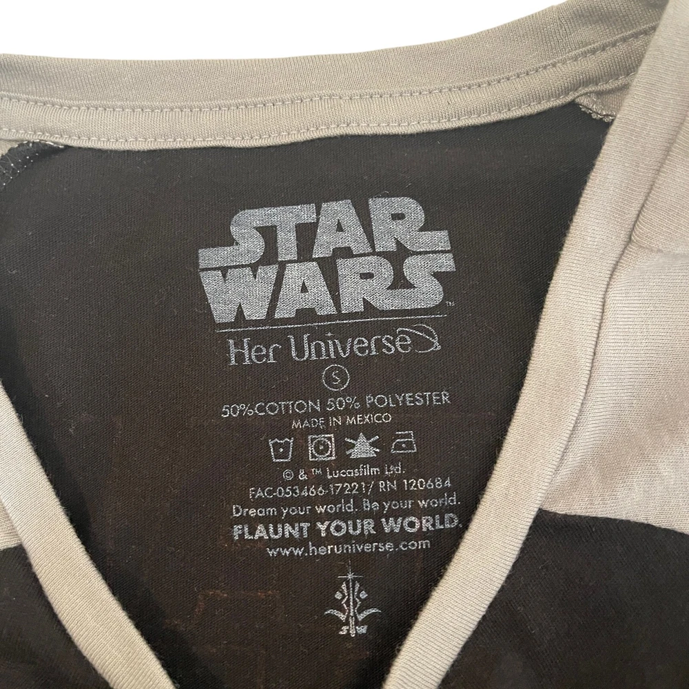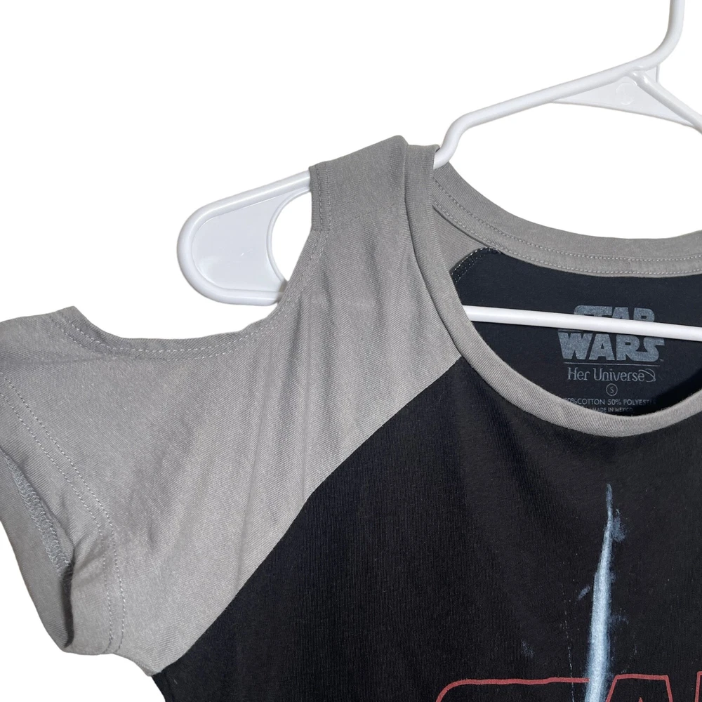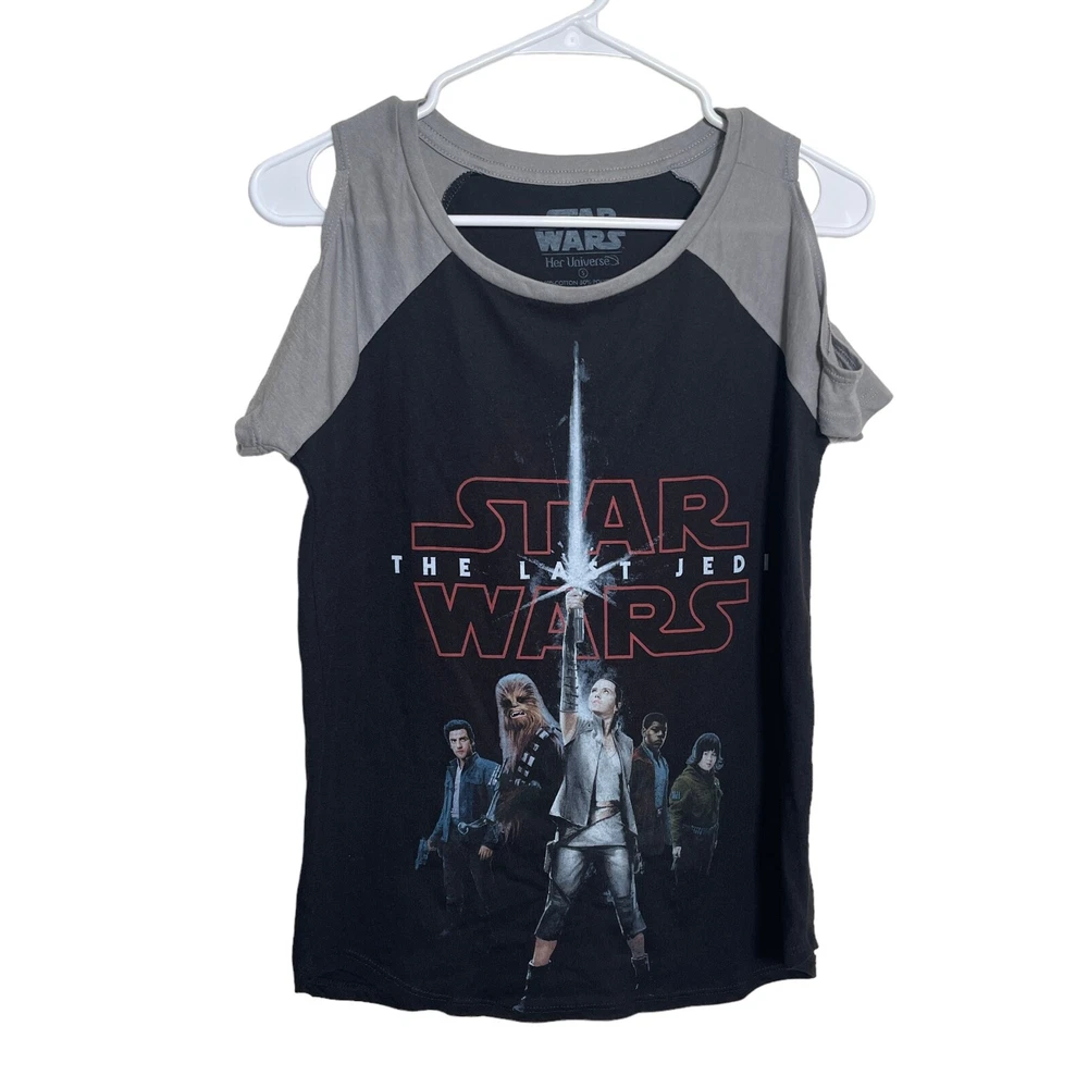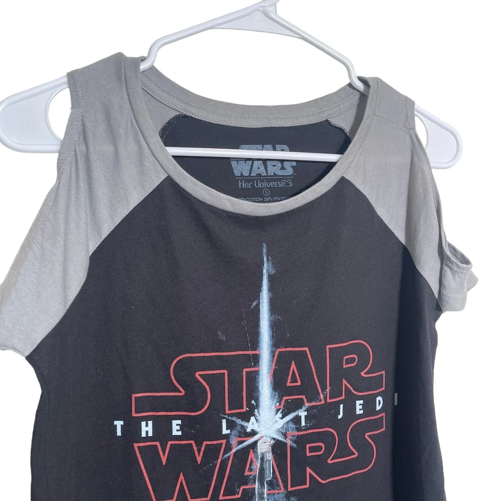 Her Universe Star Wars The Last Jedi T-Shirt Women's Small Cold Shoulder Gray This item is preloved and may show normal signs of wear and wash. I look over each item but there may be small pulls or marks that I have missed. Please refer to approximate measurements for accurate sizing Please reach out with any questions or problems Thanks for looking!
