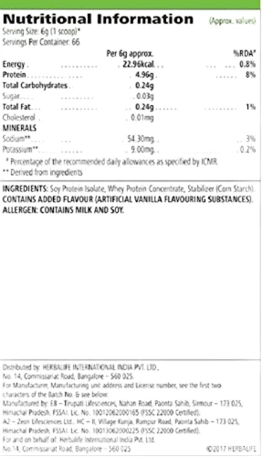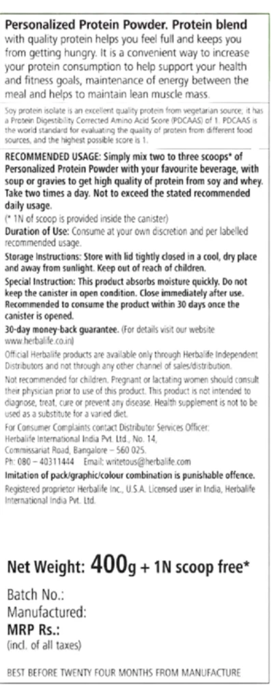 Herbalife Personalized Protein Powder 400g - Weight Management With Free Shipping Personalized Protein Powder is expertly crafted to meet your daily protein needs, featuring a premium blend of high-quality whey and soy protein. Each serving delivers 5 grams of protein, designed to support the maintenance of lean muscle mass and help you feel satisfied throughout the day. With its neutral flavor profile, this versatile powder seamlessly mixes into your favorite shakes, smoothies, soups, and sauces—providing an effortless way to boost your protein intake. Whether you're enhancing your morning smoothie or adding it to a savory dish, achieving your protein goals has never been easier. Herbalife Personalized Protein Powder 400g - High-Quality Whey & Soy Blend - Supports Lean Muscle Mass - 5g Protein per Serving - Neutral Flavor for Easy Mixing - Perfect for Shakes, Smoothies, Soups & Sauces - 66 Servings - Boost Your Daily Protein Intake - Ideal for Active Lifestyles - Helps with Satiety and Energy - Convenient and Versatile Protein Solution! Key Benefits: - 5 g of Quality Protein: Sourced from soy and whey to fuel your body effectively. - Supports Satiety: Helps keep hunger at bay, making it easier to maintain your energy levels between meals. - Maintains Lean Muscle Mass: Essential for fitness enthusiasts and anyone looking to support their active lifestyle. - Convenient Serving Size: Each scoop (6 g) can be easily mixed, making it simple to incorporate into your daily routine. Ingredients: Soy Protein Isolate, Whey Protein Concentrate, Artificial Vanilla Flavoring, Stabilizer (Corn Starch). Recommended Usage: Mix 2 to 3 scoops of Personalized Protein Powder into your favorite beverages or meals twice a day for optimal results. Storage: Keep the lid tightly closed in a cool, dry place away from sunlight. Ensure it’s stored out of reach of children. Elevate your protein intake effortlessly with Personalized Protein Powder—your go-to solution for supporting an active and healthy lifestyle!