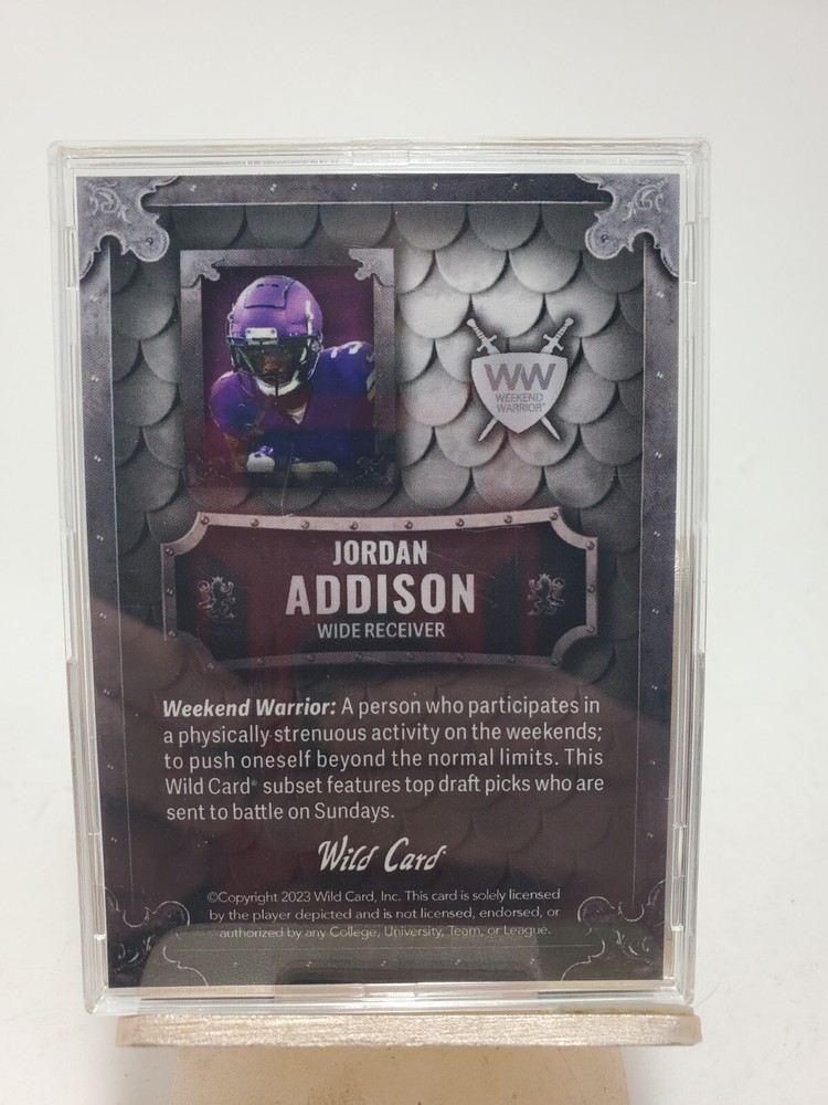 This Wild Card Matte Jordan Addison 18/100 Weekend Warrior trading card is a must-have for any sports enthusiast. Featuring a rookie card of the Minnesota Vikings' Jordan Addison, this card is a rare find with a print run of only 100. The card is in excellent shape, with no noticeable flaws or defects. The card is part of the National Football League (NFL) collection and is perfect for collectors looking to add a unique and valuable item to their collection. The card's features include a stunning matte design and a clear image of Jordan Addison in action. This trading card is a great investment for any football fan looking to add a rare and high-quality card to their collection.