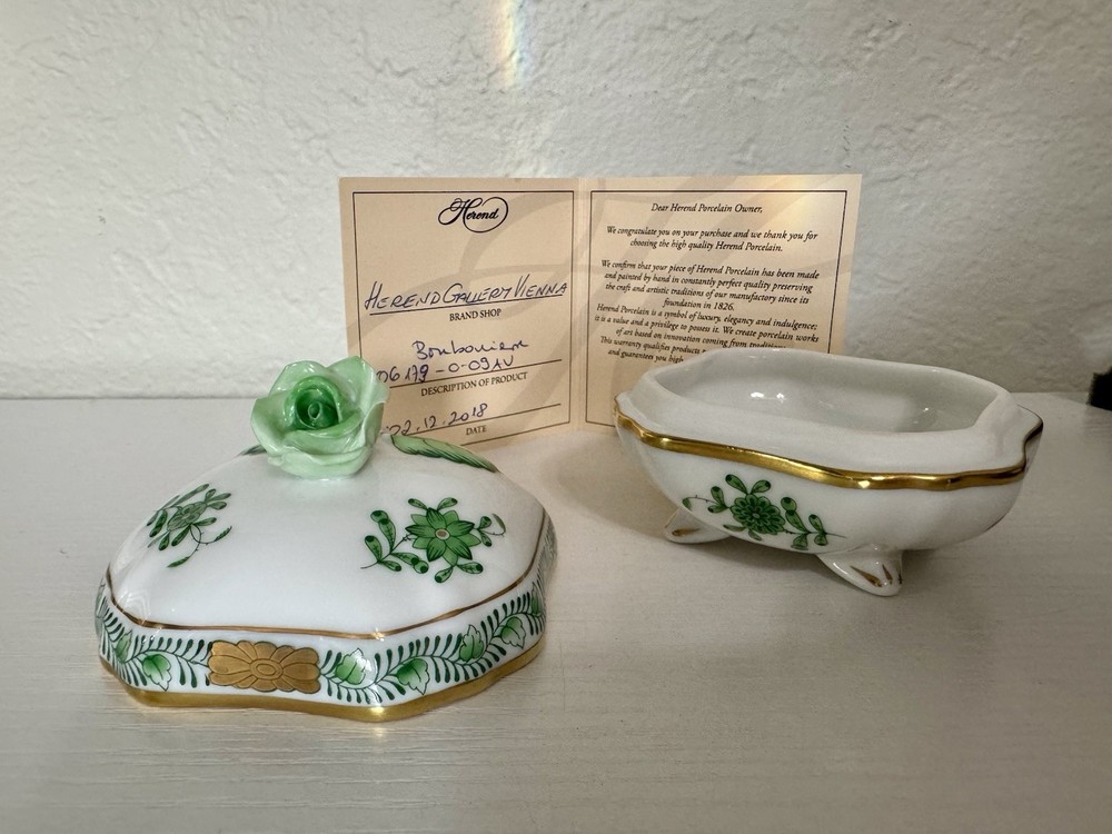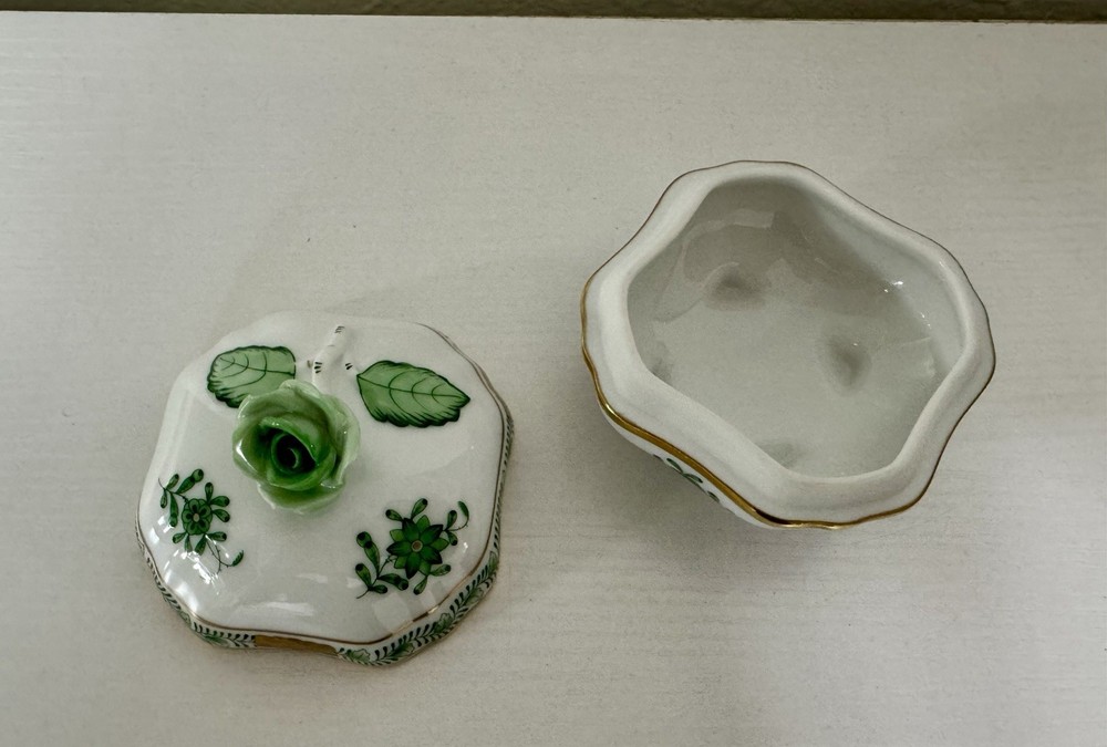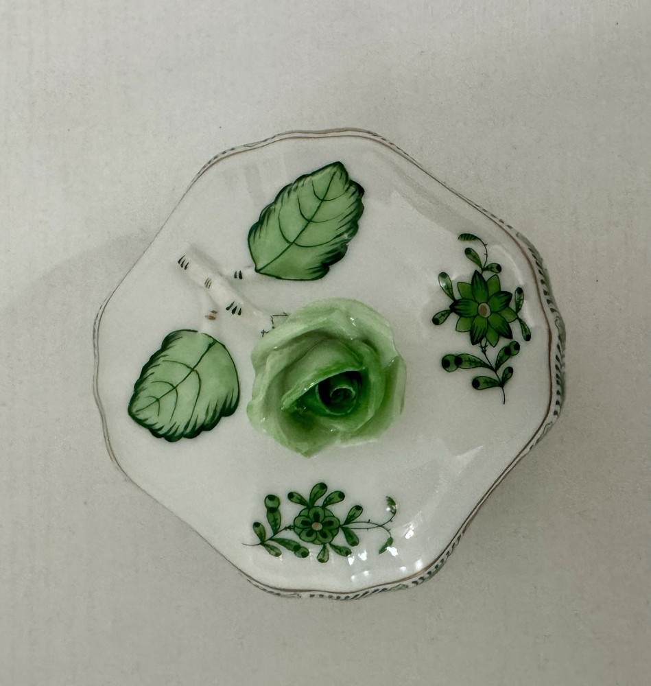 Discover the exquisite craftsmanship of the Herend Hungary Floral Porcelain Hand Painted Lidded Trinket Jewelry Box, an exceptional piece for your collection. With its delicate floral pattern set against a classic white background, this small-sized box showcases the timeless elegance of Herend's renowned hand-painting technique. The box features a variety of shapes and a glazed finish that enhances its intricate details and adds a touch of luxury to any setting. Crafted from high-quality porcelain, this trinket box is not only visually appealing but also durable. Its lidded design ensures the safekeeping of your cherished jewelry or keepsakes, while the hand-painted features infuse each piece with a unique charm. Proudly made in Hungary, it's a testament to the country's rich tradition of artisanal craftsmanship.