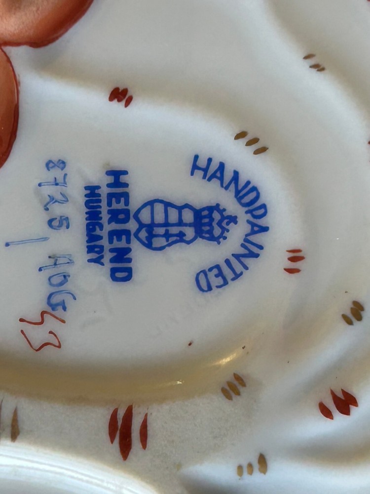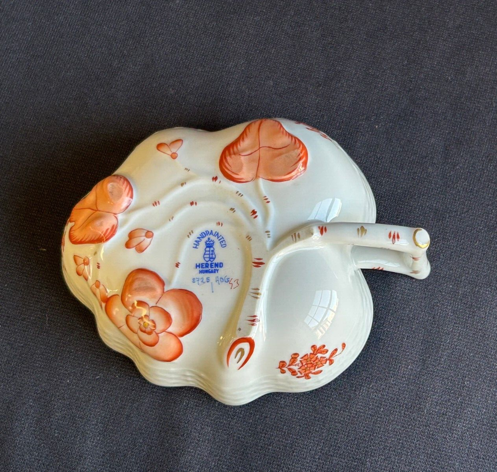 Brick House Antiques of Lewisburg, WV is pleased to offer a Herend Porcelain Lead Dish Small leaf shaped dish with handpainted orange and gold decoration. Basket weave texture on outside rim. Great as a display piece. BUYER PAYS SHIPPING AND HANDLING. WE COMBINE SHIPPING. Local pick up is always welcome!