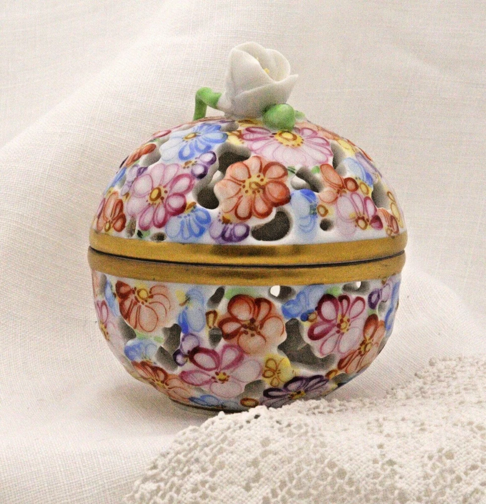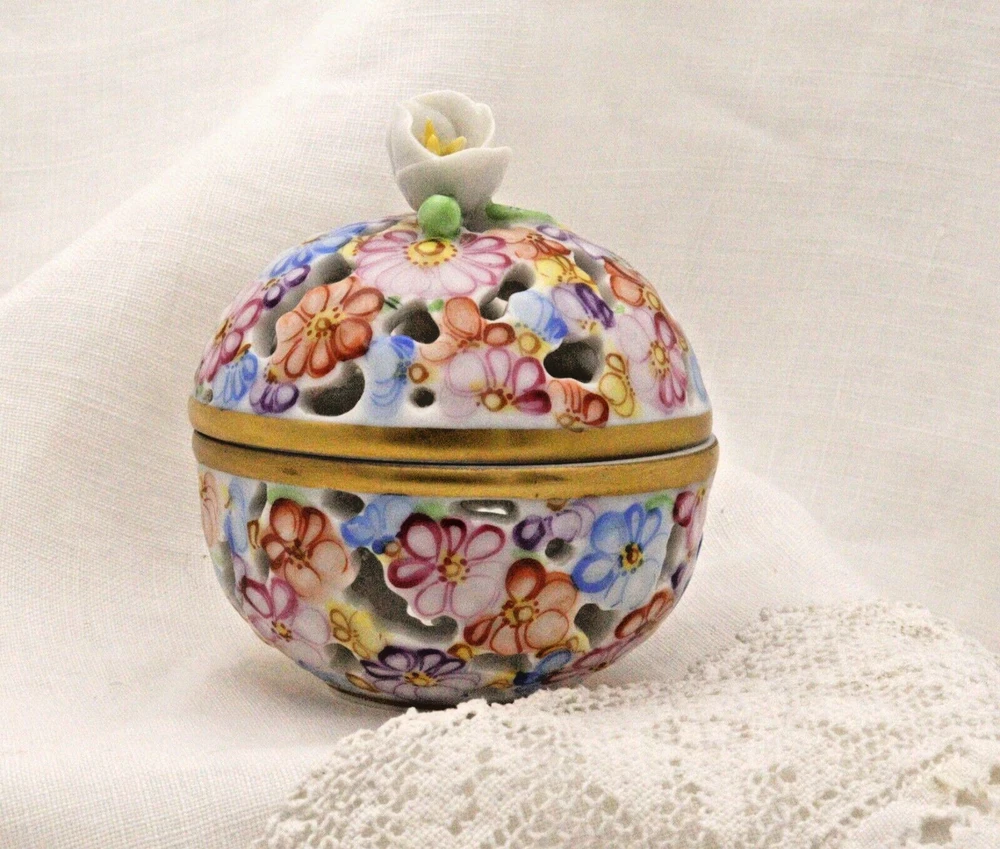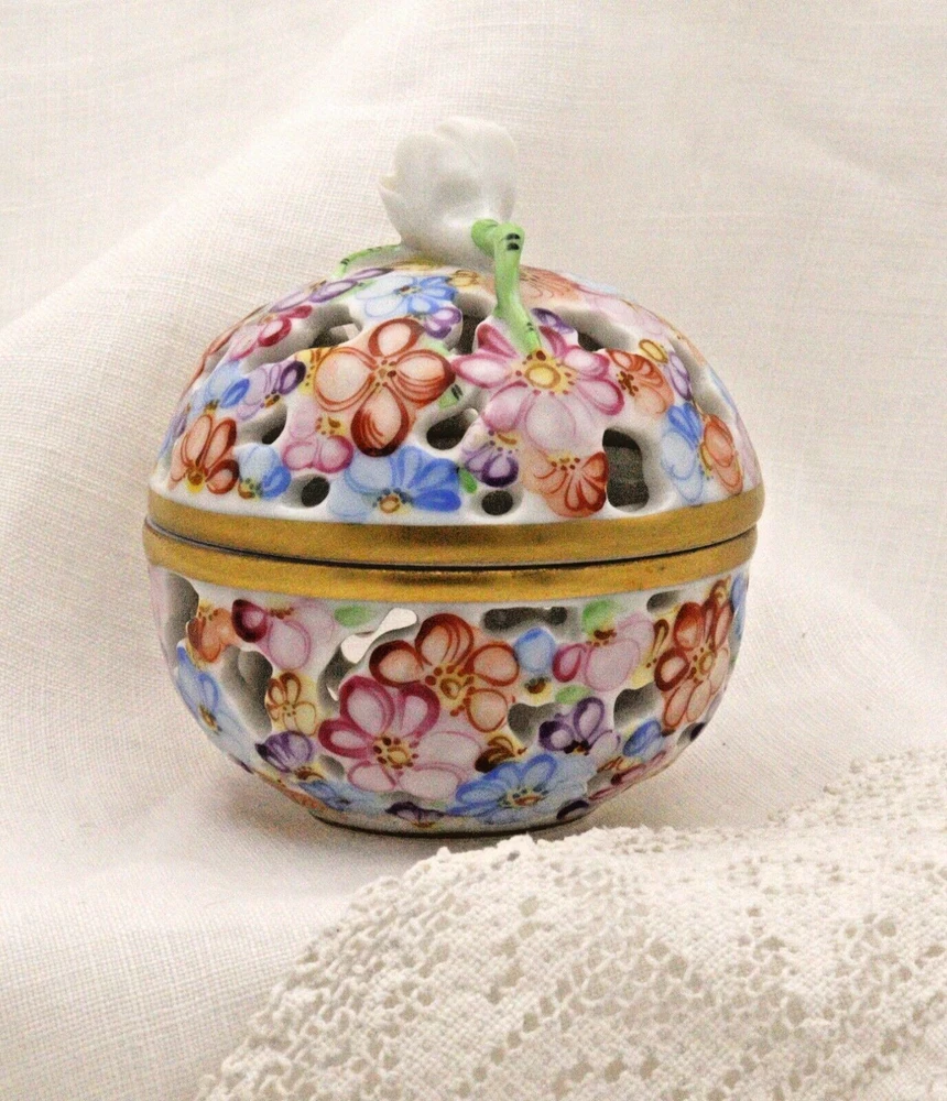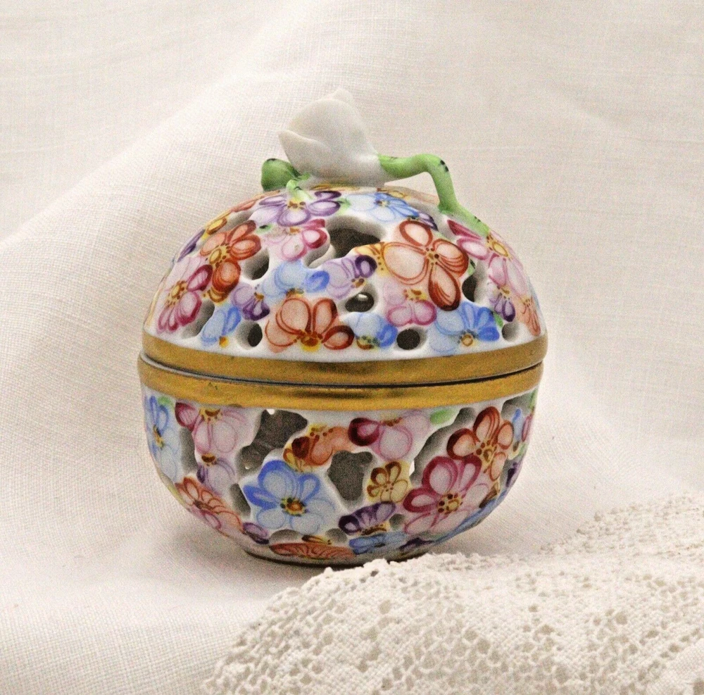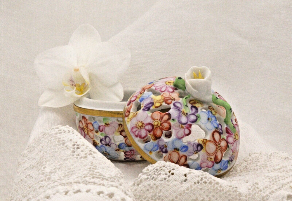 This Herend trinket box is a small round porcelain box featuring a beautiful cut out hand-painted multi-color flower design. The box is adorned with a Lilly finial on the lid, adding a touch of elegance to its Victorian style. Made in Hungary, this collectible piece is part of the Love, Romance collection by Herend and is individually numbered, showcasing its craftsmanship and uniqueness. Perfect for storing small treasures, potpourri, or as a decorative accent, this trinket box combines artistry with functionality in a very charming way. 3" H x 2" W Gorgeous Condition