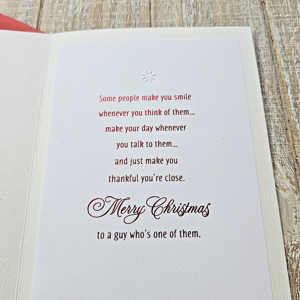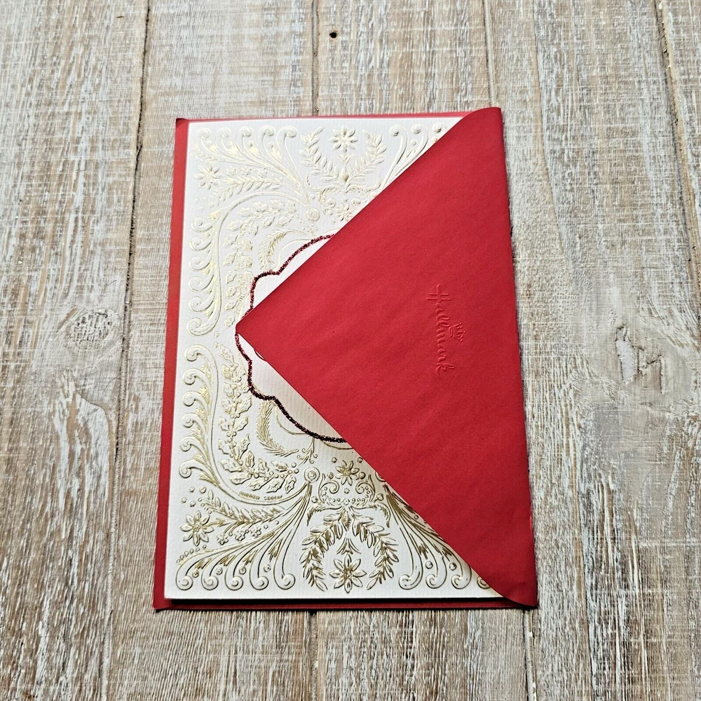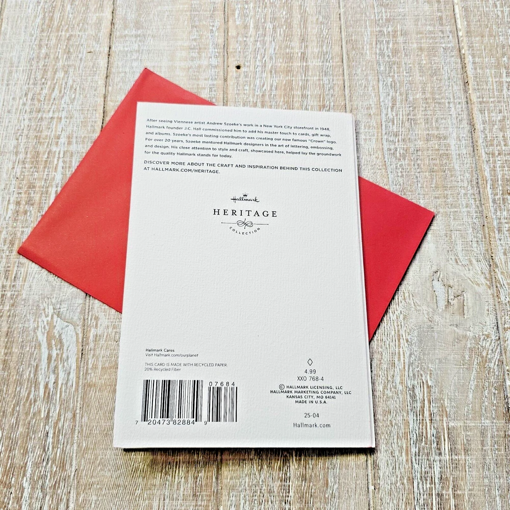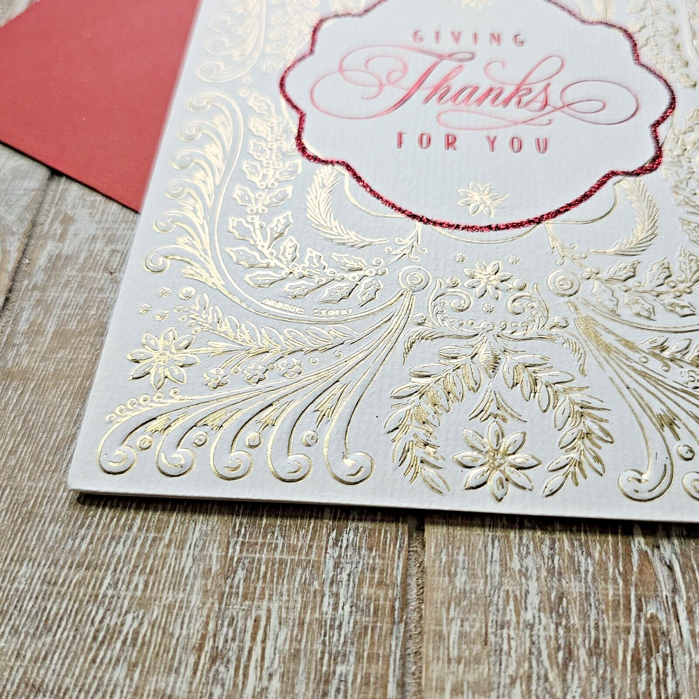 Hallmark Heritage Christmas Greeting Card White Gold Embossed Red Giving Thanks Full Size 5.5 x 8 inch card This listing is for a single card and matching envelope in new condition. Click here to add a personalized label to the inside of your card. Search thousands of cards for all occasions in our eBay Store . Our cards ship with limited tracking via USPS First Class. Standard delivery time is 5-7 days but may take up to 10 days.