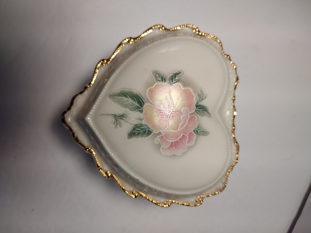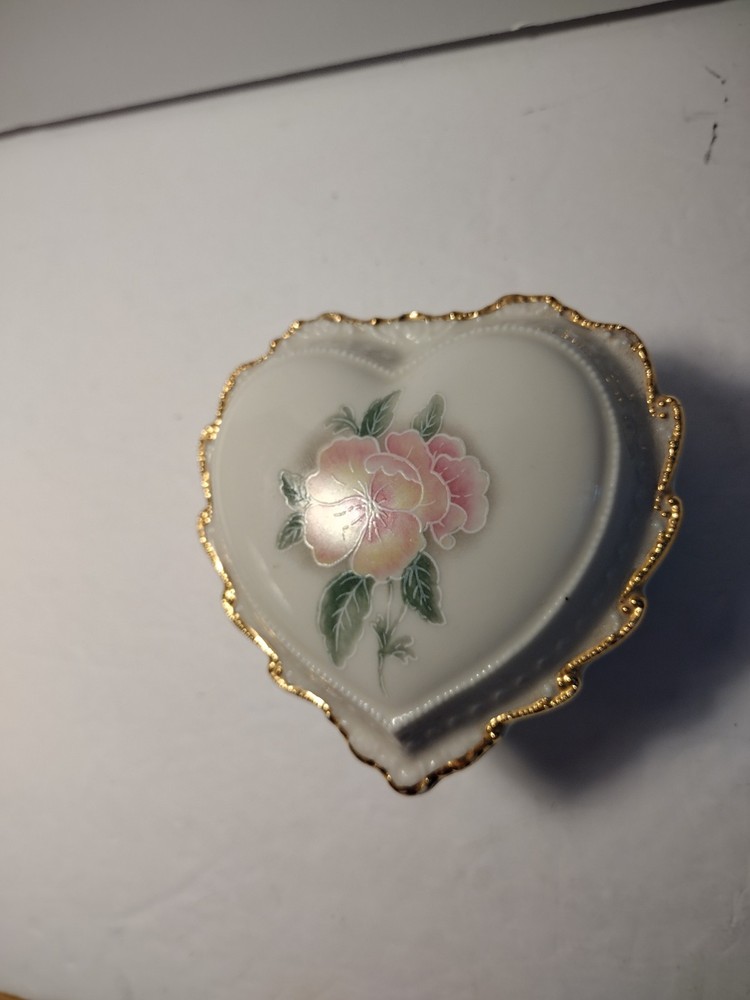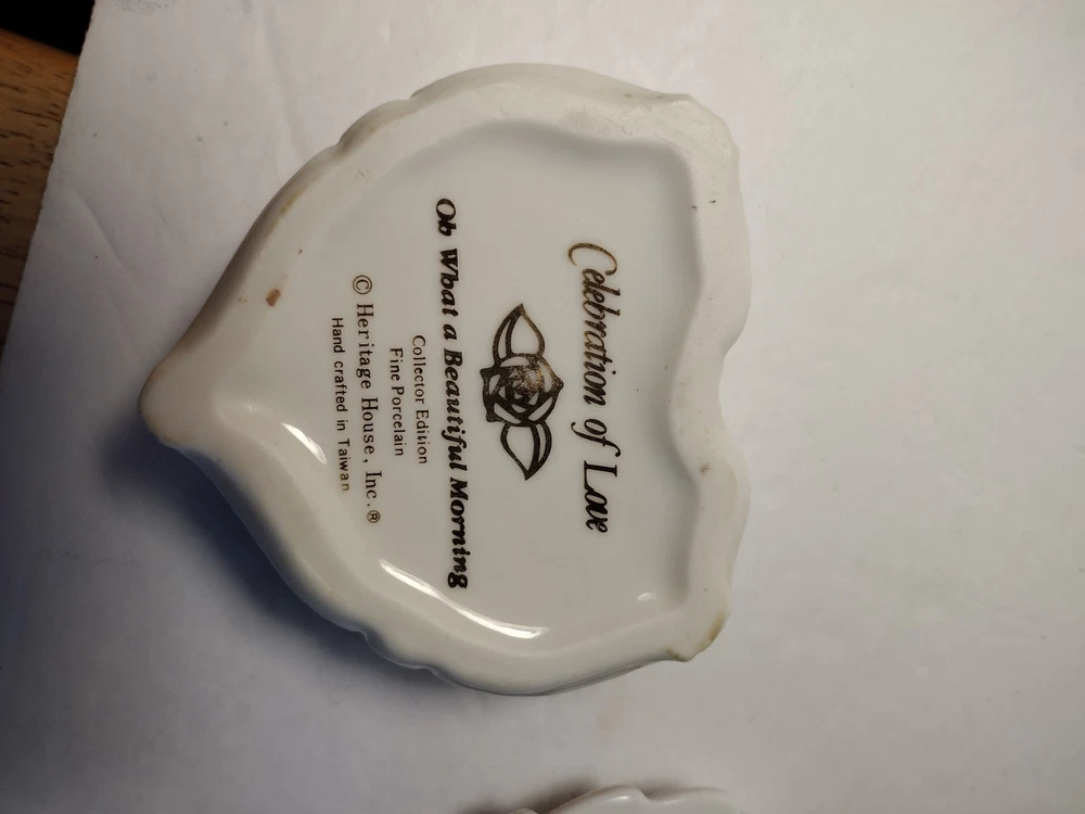 This Heritage House jewelry or ring dish is made of fine porcelain, measuring 3.5 inches in length and featuring a lid. Ideal for storing small items like jewelry or rings, this beautiful piece adds a touch of elegance to any space..