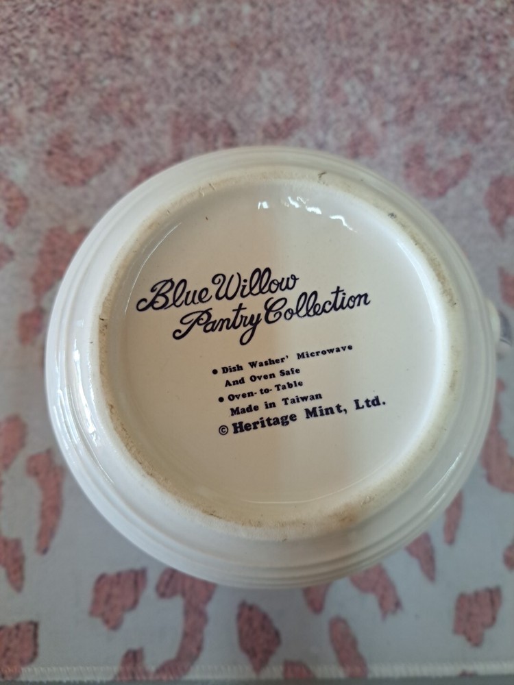 The Blue Willow Pantry Collection Soup Mug by Heritage Mint Ltd is a vintage coffee mug set made of ceramic and porcelain in a traditional Blue Willow pattern. This set includes a pitcher and is suitable for hot or cold beverages. It is an original design from the Willow Pantry Collection, featuring a classic blue and white color scheme. The unisex adults can enjoy this timeless piece for all occasions, adding a touch of elegance to any kitchen or dining setting.