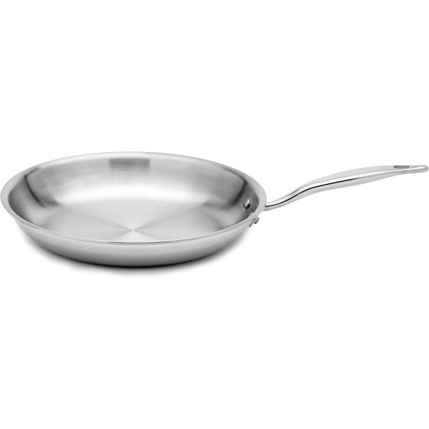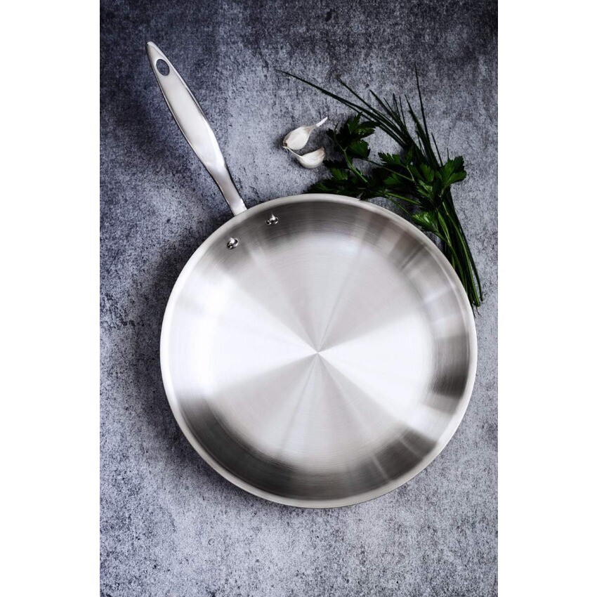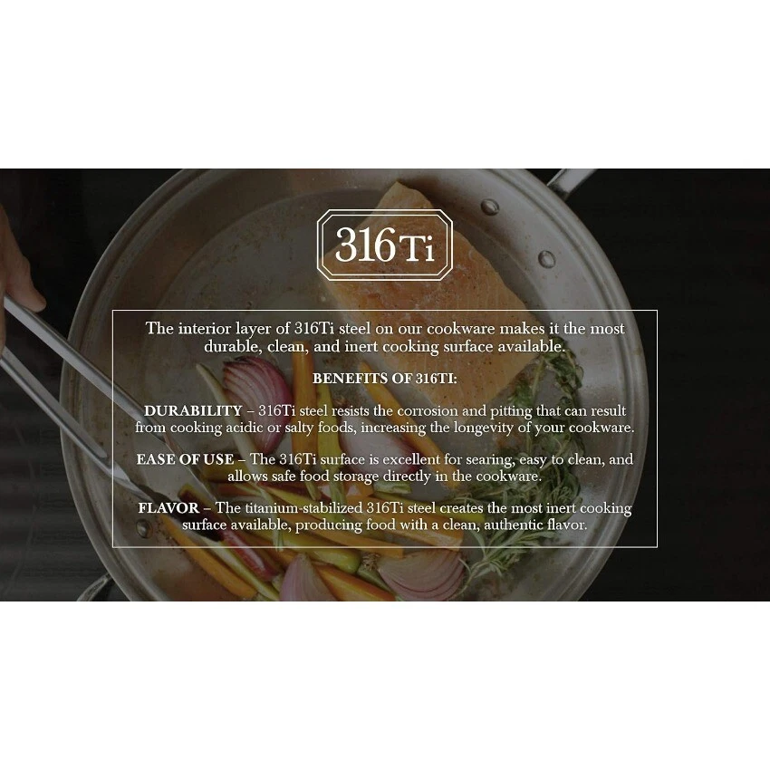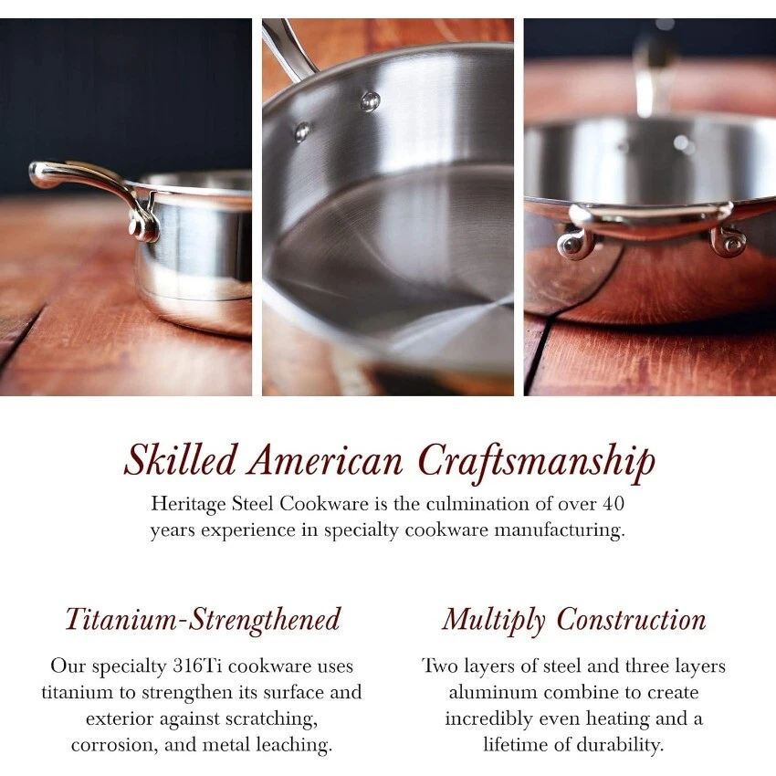Package: 1X Heritage Steel 12 Inch Fry Pan | Made In USA | Titanium Series | 316Ti Skillet with Stay Cool Handle | Fully Clad Stainless Steel Pan with 5-Ply Construction | Induction Ready & Non Toxic Description: PROFESSIONAL PERFORMANCE: Built from thick 5 ply cladded stainless steel, our fry pans are built to heat up evenly and retain heat well. Fully cladded on both the base and sides, the entire pan performs predictably and reliably for all your cooking needs. AMERICAN MADE, LIFETIME WARRANTY: We’re a family-owned craft manufacturer obsessed with building great stainless clad cookware. It’s the only thing we’ve been making for over 40 years, so we’ve gotten pretty good at it. Our cookware is fully made in the USA with global materials and is backed by a lifetime warranty. EVEN COOKING AND EASY CLEANING: Our 5 ply fully clad construction includes three layers of aluminum that are sandwiched between protective layers of stainless steel, resulting in cookware that combines even heating with incredible durability. Use it on any stovetop (including induction), in the oven up to 800 degrees and it’s broiler safe. The handles are built to stay cool on the stovetop and rounded pan lips enable drip-free pouring NON-TOXIC WITH NO CHEMICAL COATINGS: We don’t use any type of chemical coatings on our cookware. It is made without any type of PFAS (PFOA, PTFE aka Teflon, PFOS, or other), ceramic sol-gel, nanoparticles, lead, cadmium, or any other chemically applied coating. You deserve the very best in your cooking surface, so we rely only on high quality clad stainless steel. No funny business or gimmicks, just tried and tested heritage materials. TITANIUM SERIES: This pan features a specialty 316Ti stainless steel cooking surface. The alloy is strengthened with molybdenum and titanium to better protect against salt pitting and metal leaching.