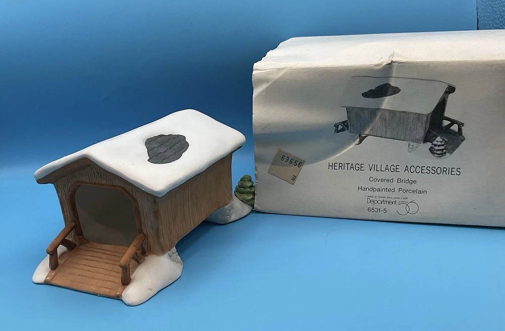 The Heritage Village Collection Dept. 56 Covered Bridge is a charming porcelain Christmas village piece, featuring a multicolor handpainted design. This original Department 56 collectible from the Heritage Village series depicts a traditional covered bridge, making it a festive addition to any Christmas decor. Packaged in its original box, this #6531-5 model is perfect for collectors or anyone looking to add a touch of nostalgia to their holiday display.