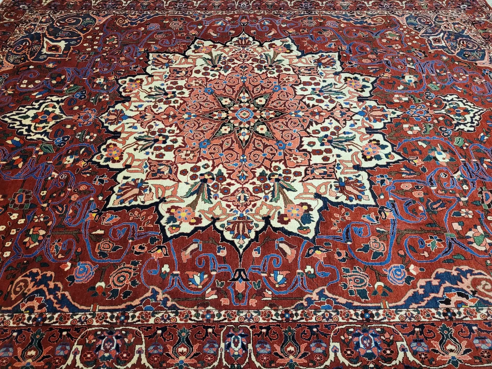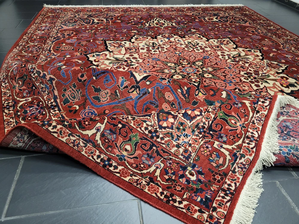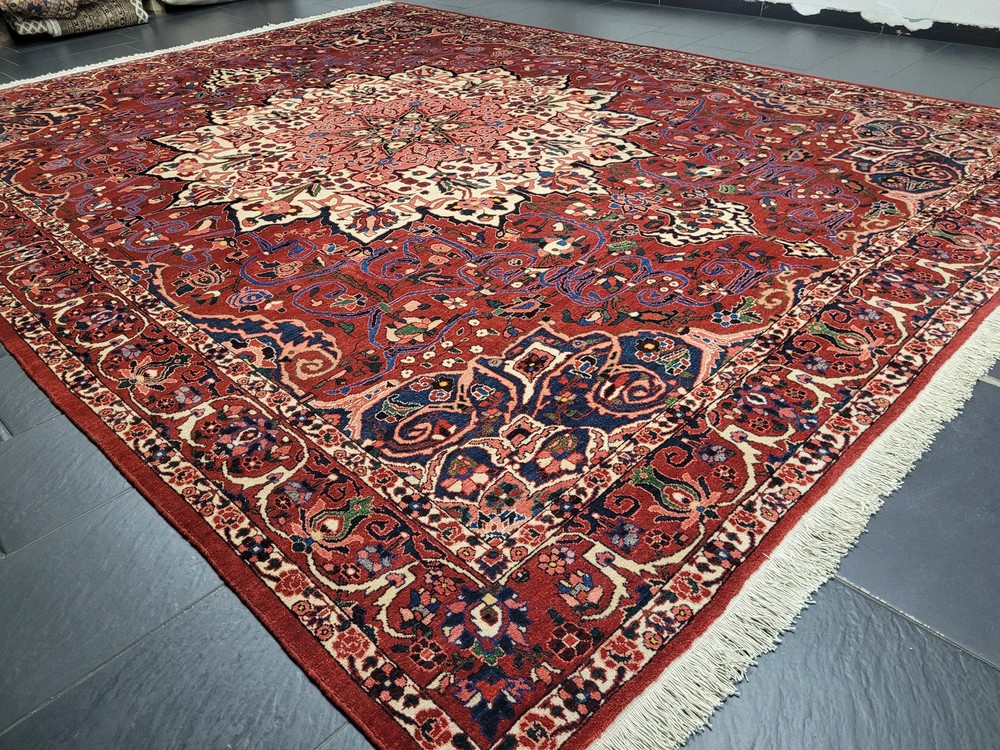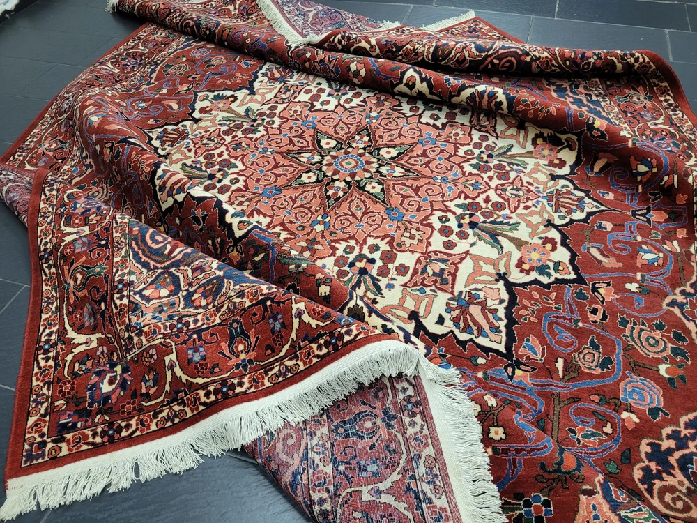 Herzlich willkommen, angeboten wird ein eindrucksvoller Heriz Teppich aus feiner Korkwolle, handgeknüpft und von stattlicher Größe. Dieses Stück besticht durch sein großflächiges, sternförmiges Medaillon in der Mitte, das sich kontrastreich vom roten Fond abhebt. Umgeben ist das Medaillon von kraftvollen floralen Ornamenten, Blütenranken und geometrischen Elementen, die typisch für die Knüpfkunst aus dieser Region sind. Artikelnummer: GJH25/179 Maße: 383 × 291 cm Gewicht: ca. 46 kg Details: Material: Korkwolle, handgeknüpft Knüpfung: robust und dicht, langlebige Verarbeitung Farben: Rot, Elfenbein, Blau, Dunkelblau, Grün und Akzente in Schwarz Design: Großes, sternförmiges Medaillon mit feiner Ornamentik Reich verzierte Felder mit floralem Dekor und geschwungenen Mustern Bordüre mit stilisierten Blüten und geometrischen Elementen Verarbeitung: hochwertige Handarbeit, klar strukturierte Komposition, alt und charaktervoll Zustand: Sehr guter, gepflegter Zustand mit schöner Ausstrahlung. Die Bilder sind Teil der Zustandsbeschreibung. Versand: Wir versenden per GLS, UPS und DHL versichert weltweit.