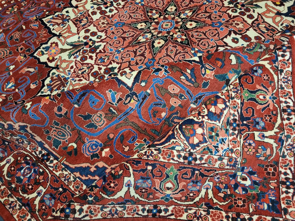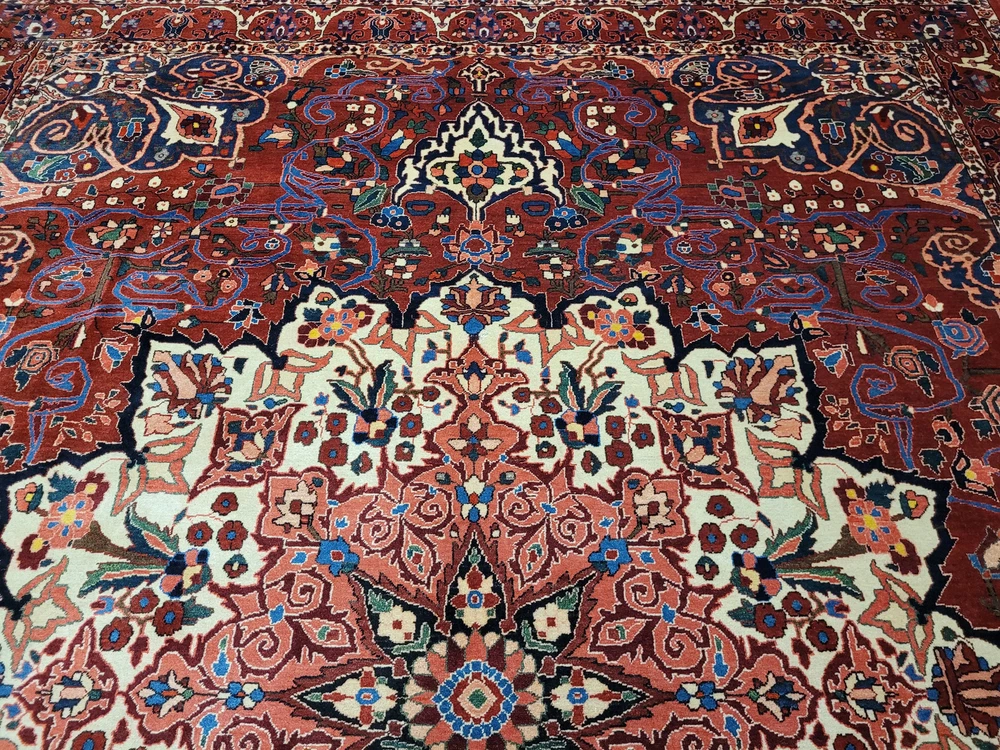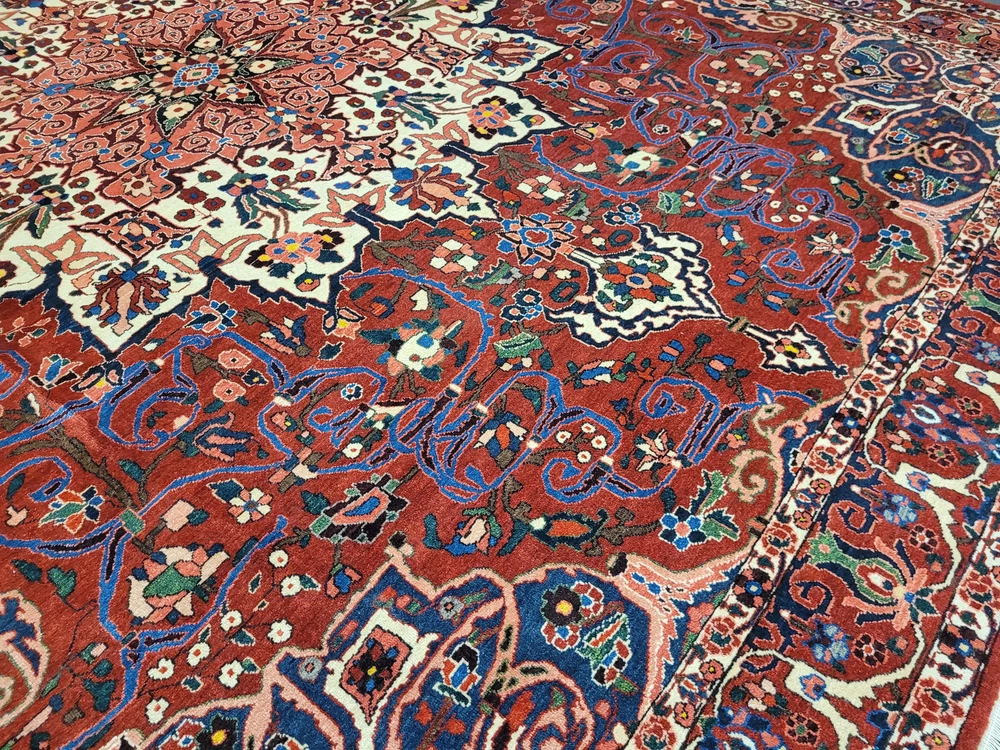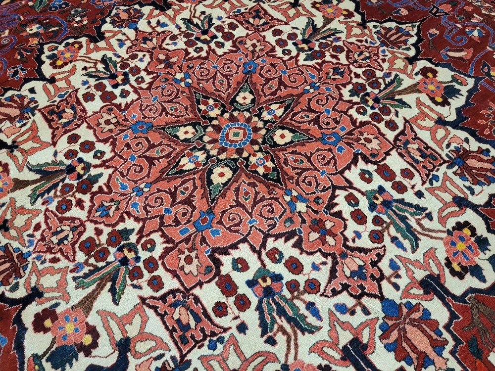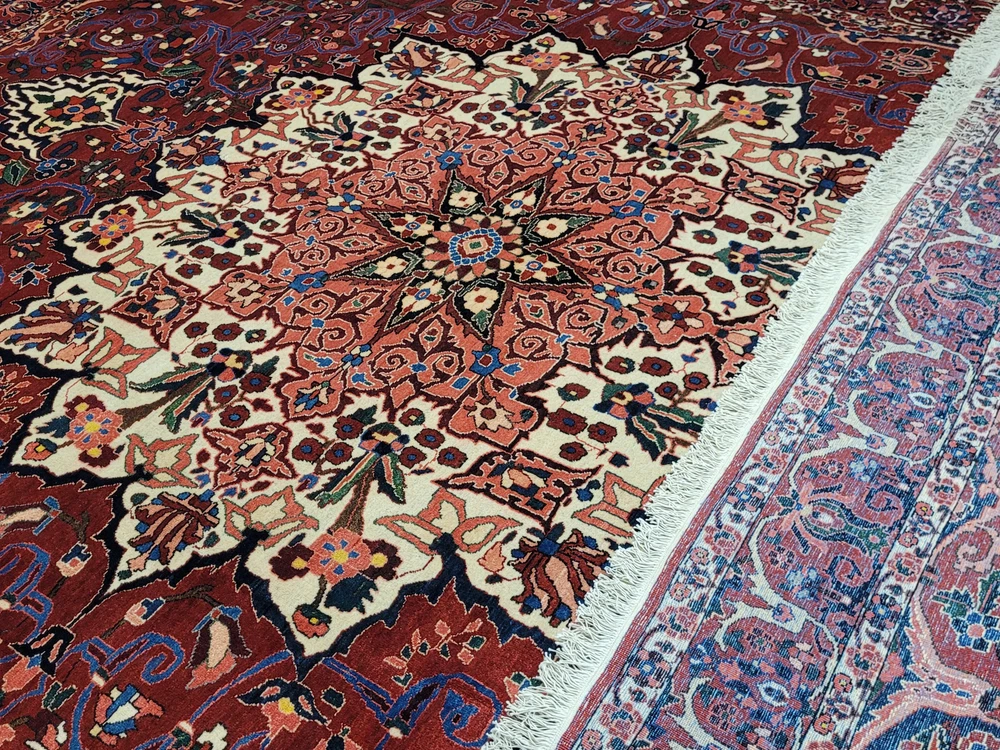 Herzlich willkommen, angeboten wird ein eindrucksvoller Heriz Teppich aus feiner Korkwolle, handgeknüpft und von stattlicher Größe. Dieses Stück besticht durch sein großflächiges, sternförmiges Medaillon in der Mitte, das sich kontrastreich vom roten Fond abhebt. Umgeben ist das Medaillon von kraftvollen floralen Ornamenten, Blütenranken und geometrischen Elementen, die typisch für die Knüpfkunst aus dieser Region sind. Artikelnummer: GJH25/179 Maße: 383 × 291 cm Gewicht: ca. 46 kg Details: Material: Korkwolle, handgeknüpft Knüpfung: robust und dicht, langlebige Verarbeitung Farben: Rot, Elfenbein, Blau, Dunkelblau, Grün und Akzente in Schwarz Design: Großes, sternförmiges Medaillon mit feiner Ornamentik Reich verzierte Felder mit floralem Dekor und geschwungenen Mustern Bordüre mit stilisierten Blüten und geometrischen Elementen Verarbeitung: hochwertige Handarbeit, klar strukturierte Komposition, alt und charaktervoll Zustand: Sehr guter, gepflegter Zustand mit schöner Ausstrahlung. Die Bilder sind Teil der Zustandsbeschreibung. Versand: Wir versenden per GLS, UPS und DHL versichert weltweit.