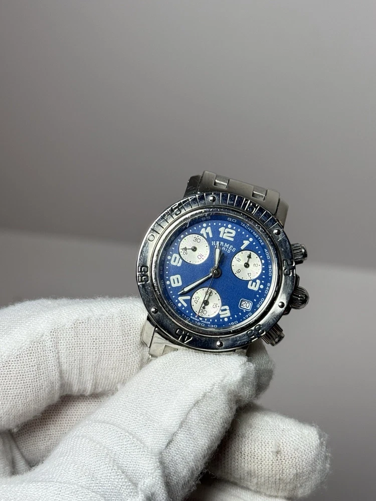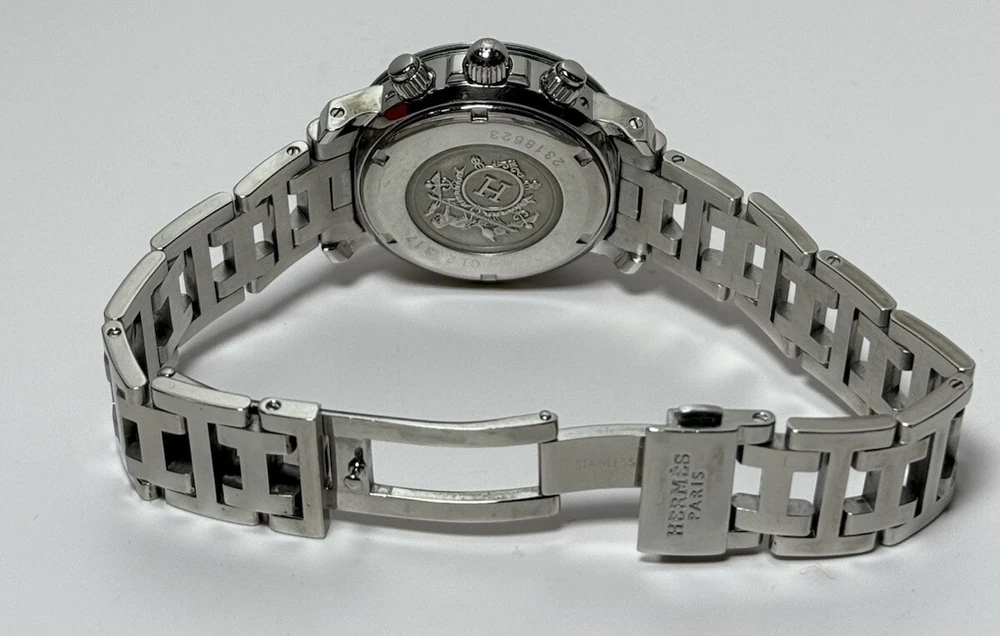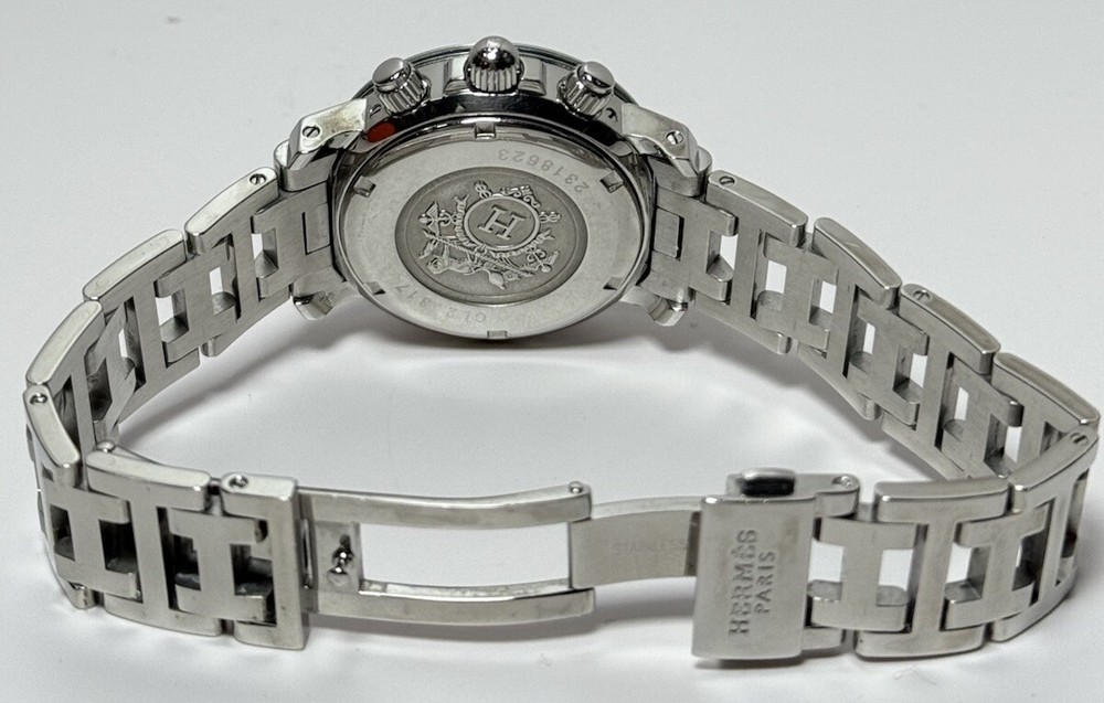 Hermès Clipper Ladies CL2.317 Diver Stainless Good condition, has a few minor scratch marks on the glass near 3 and 10 o'clock and on bezel near #5 (rotating part) Was cleaned and bracelet polished. The robber circle around the bezel is no longer present (cosmetic feature that was removed by original owner). Metal bracelet, fits up to 6.5" wrist circumference. No extra links. Comes with a box as pictured but nothing else. Guaranteed authentic, works well