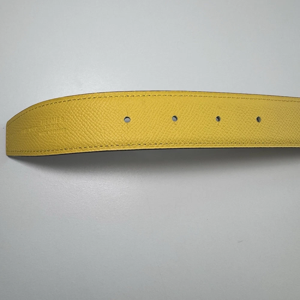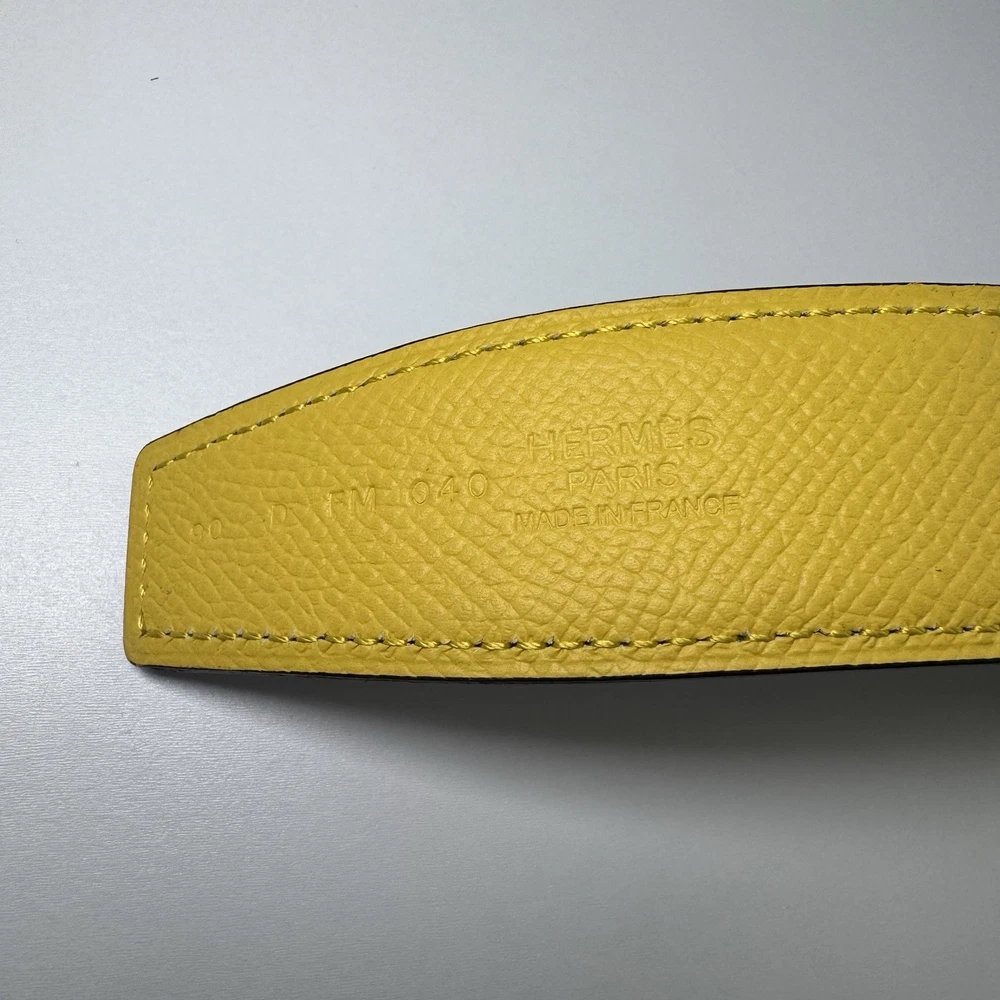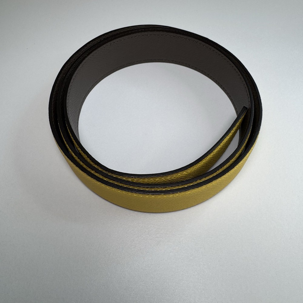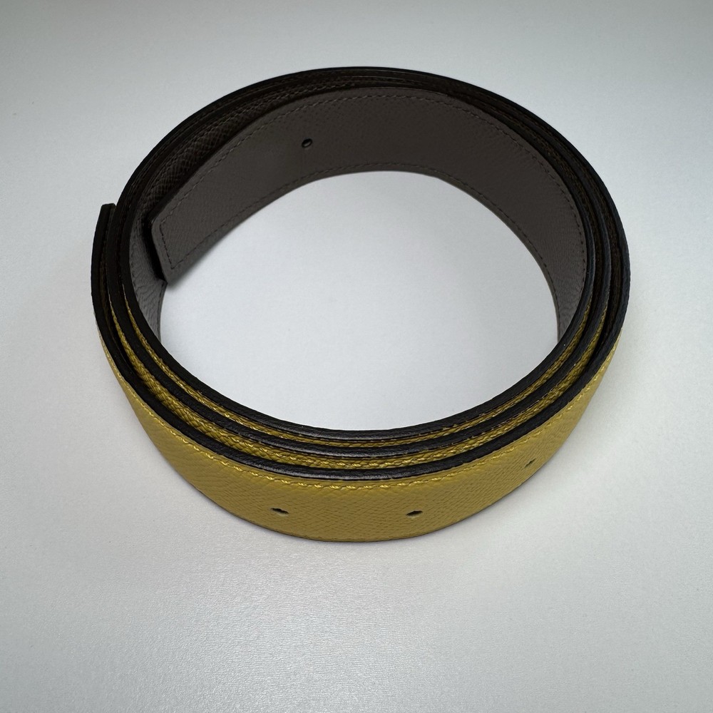 Authentic Hermès reversible leather belt strap in size 90 with a yellow side and grey reverse. Strap only, no buckle included. Striking color combination that pairs well with gold, palladium, or brushed hardware buckles. Leather is in very good condition with no major flaws. Includes original Hermès box. Fully authentic with Hermès heat stamp and strap codes. Please review photos carefully and feel free to ask questions.