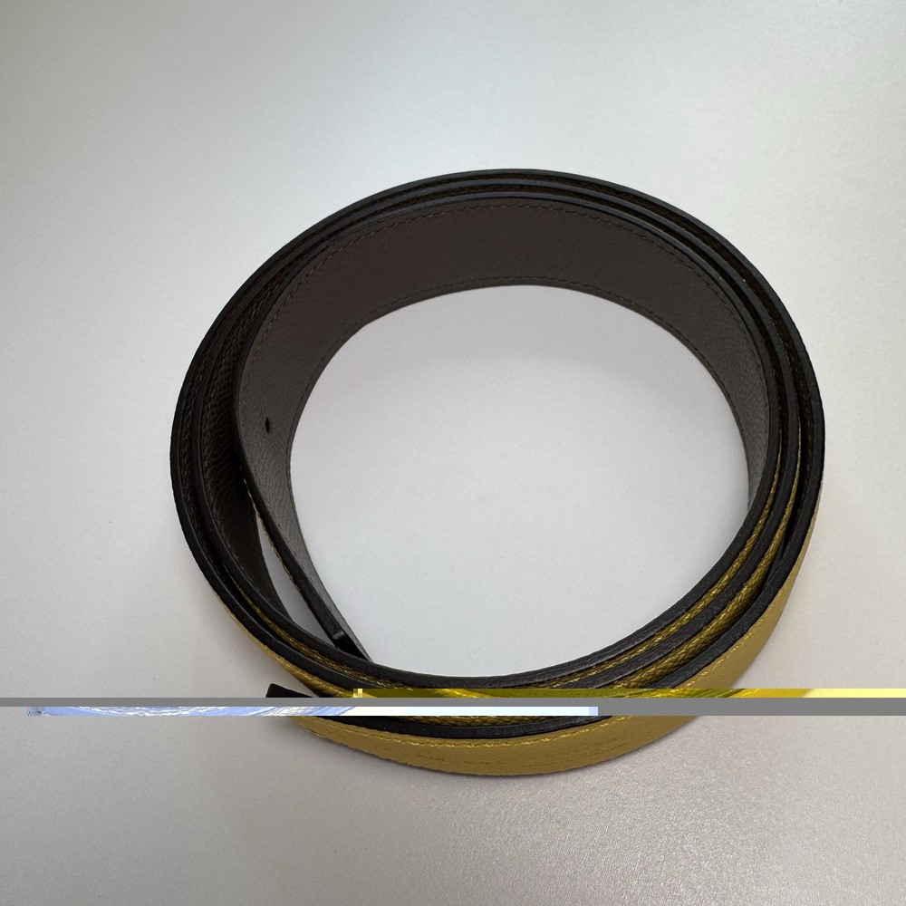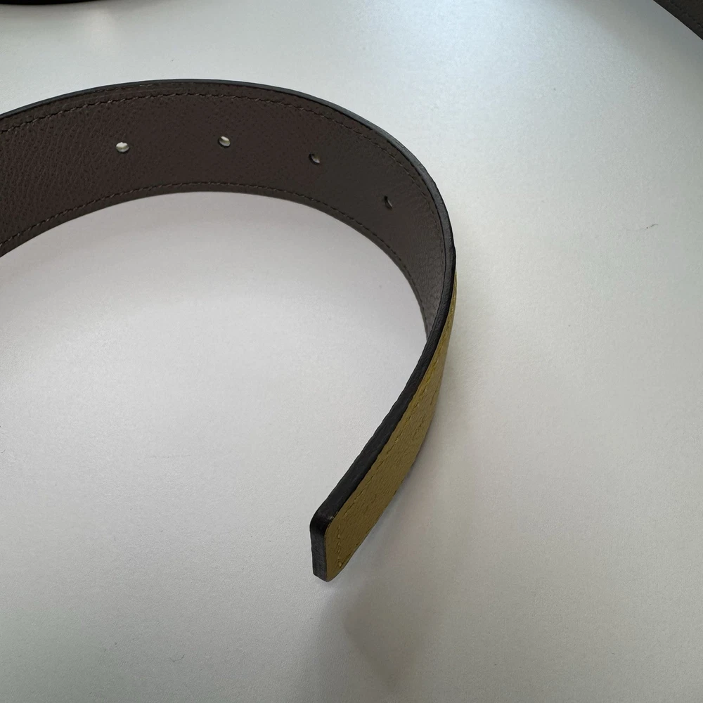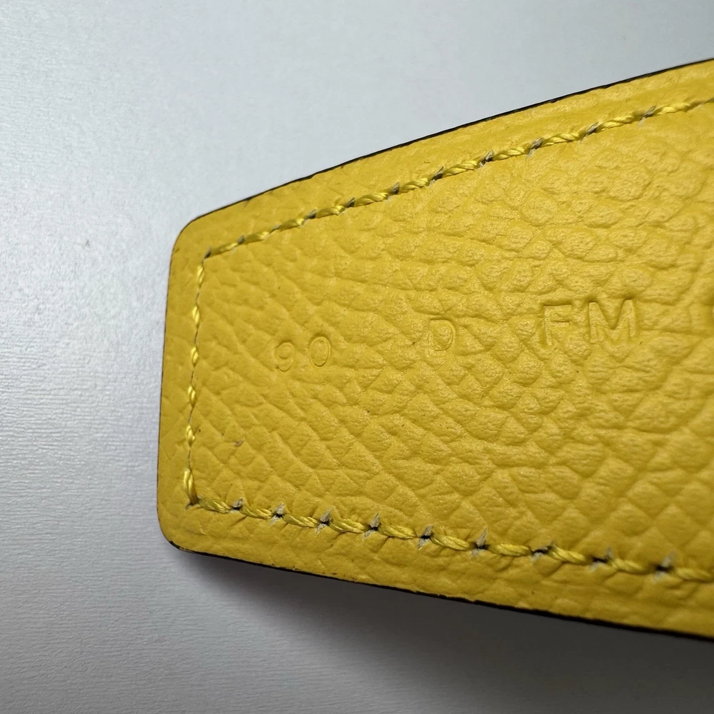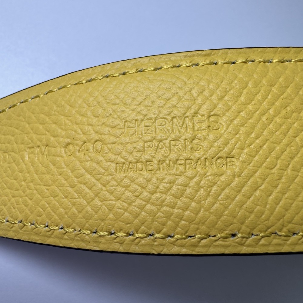 Authentic Hermès reversible leather belt strap in size 90 with a yellow side and grey reverse. Strap only, no buckle included. Striking color combination that pairs well with gold, palladium, or brushed hardware buckles. Leather is in very good condition with no major flaws. Includes original Hermès box. Fully authentic with Hermès heat stamp and strap codes. Please review photos carefully and feel free to ask questions.