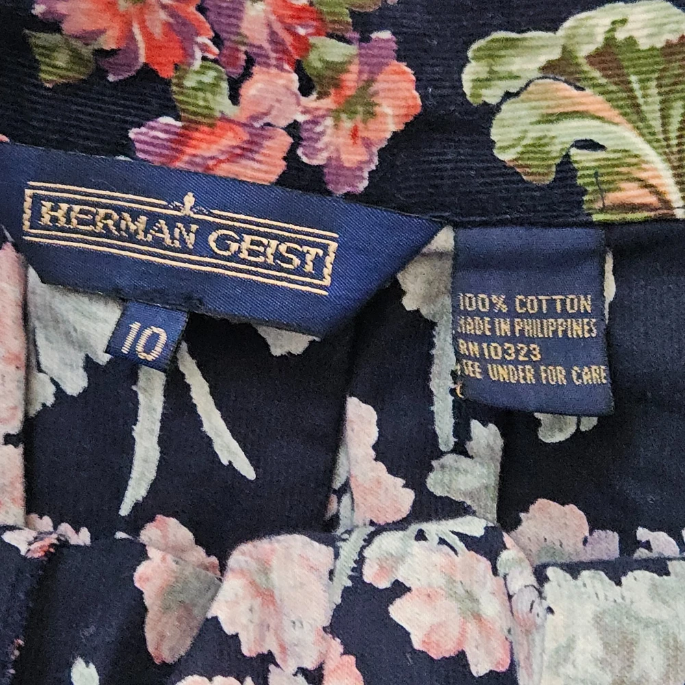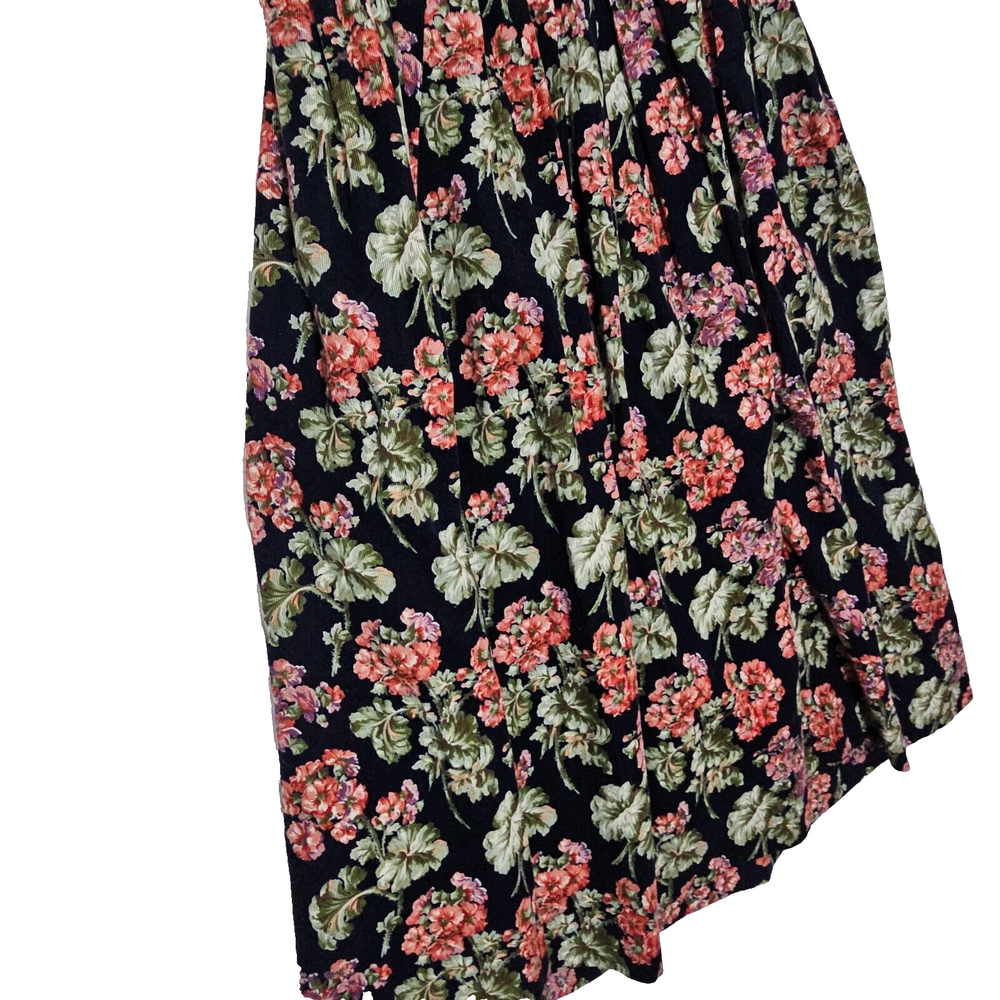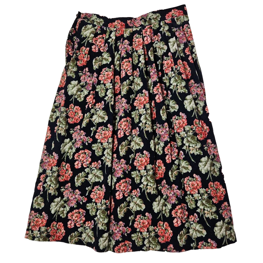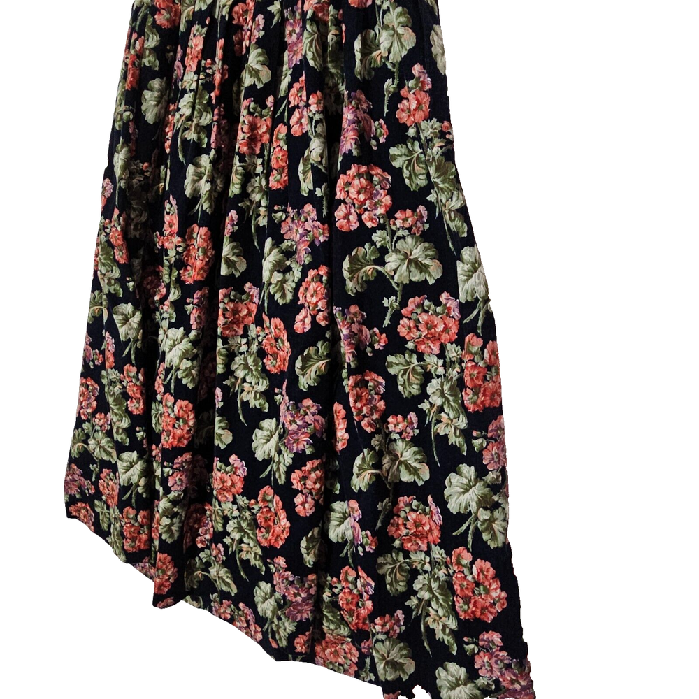 100% cotton classic vintage floral pattern light corduroy pull on with side button closure long below knee length skirt is in excellent clean condition no holes or rips Sz 10 measures flat 13.5" waist 31" length
