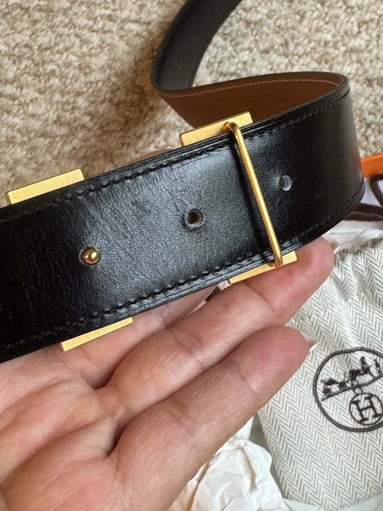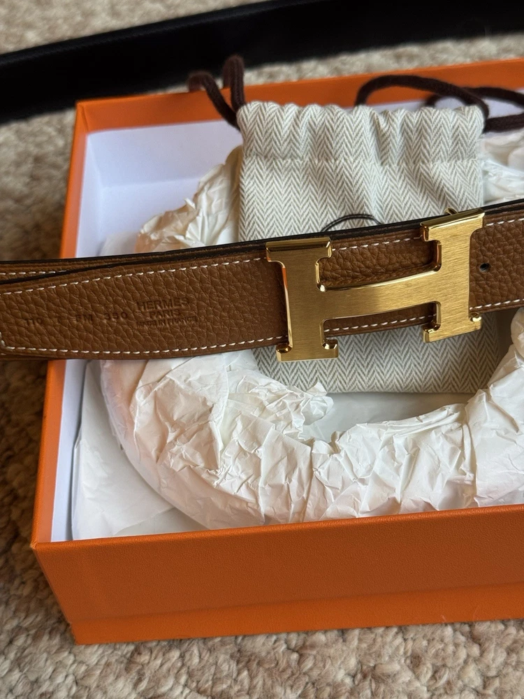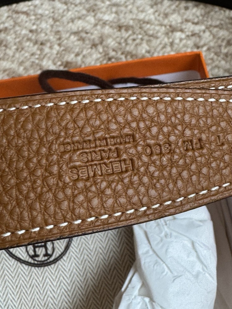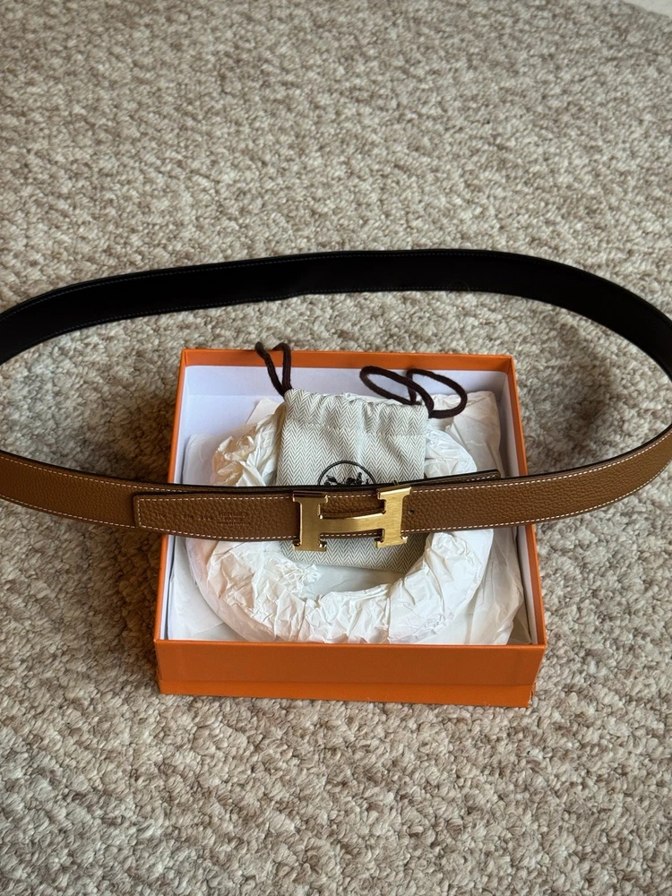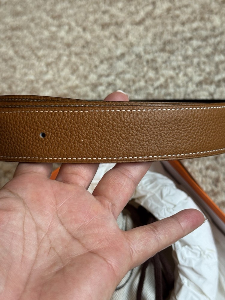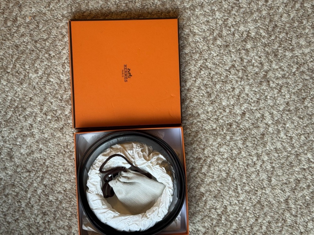 The Hermes H belt buckle and reversible leather strap in 44mm width is a classic and stylish accessory for men. Made of high-quality leather in a solid brown color, it features a sleek buckle accent and reversible design for versatile styling options. With its adjustable and dress belt style, this Hermes belt is perfect for adding a touch of sophistication to any outfit. Ideal for the modern man who appreciates timeless elegance and superior craftsmanship. Authentic Hermes belt in like new condition.