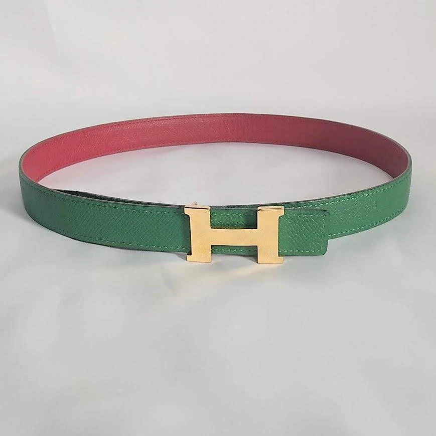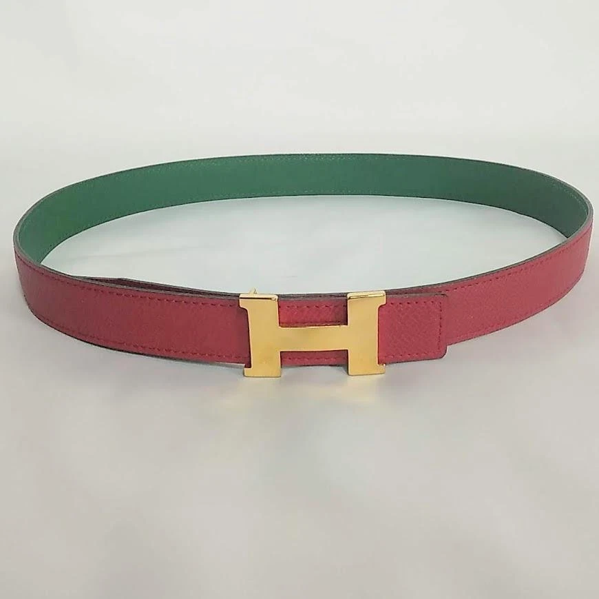 This Hermes Constance belt is a stunning two-tone piece—vibrant green on one side and classic red on the other, with elegant gold hardware. The leather is rich and durable, showing minimal wear for its age, and the reversible design makes it super versatile. The extra belt hole is a practical touch, ensuring a perfect fit. Such a timeless luxury accessory!