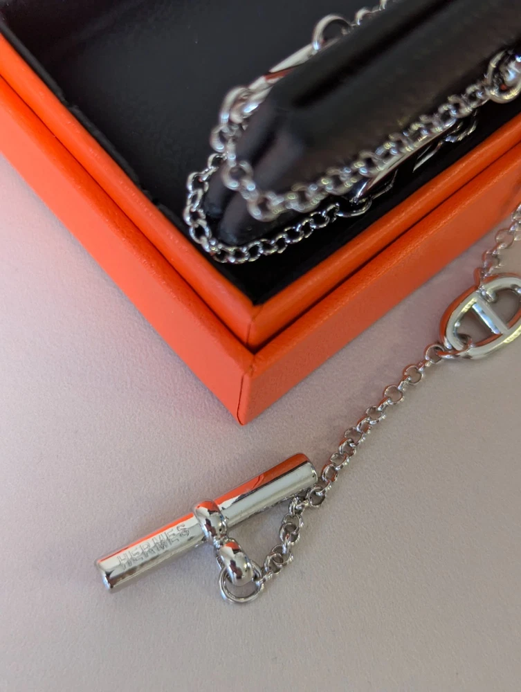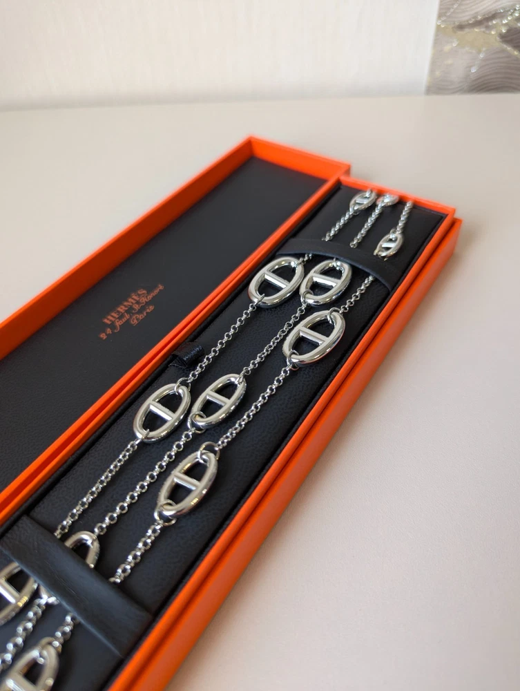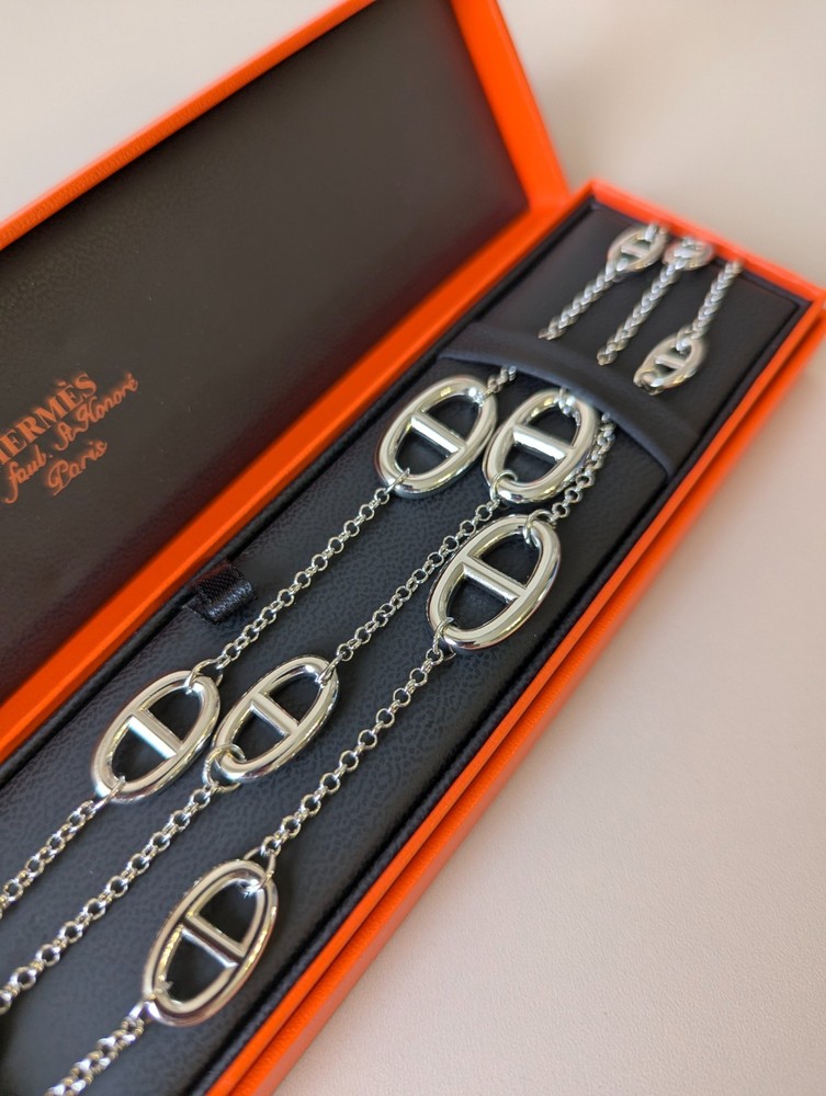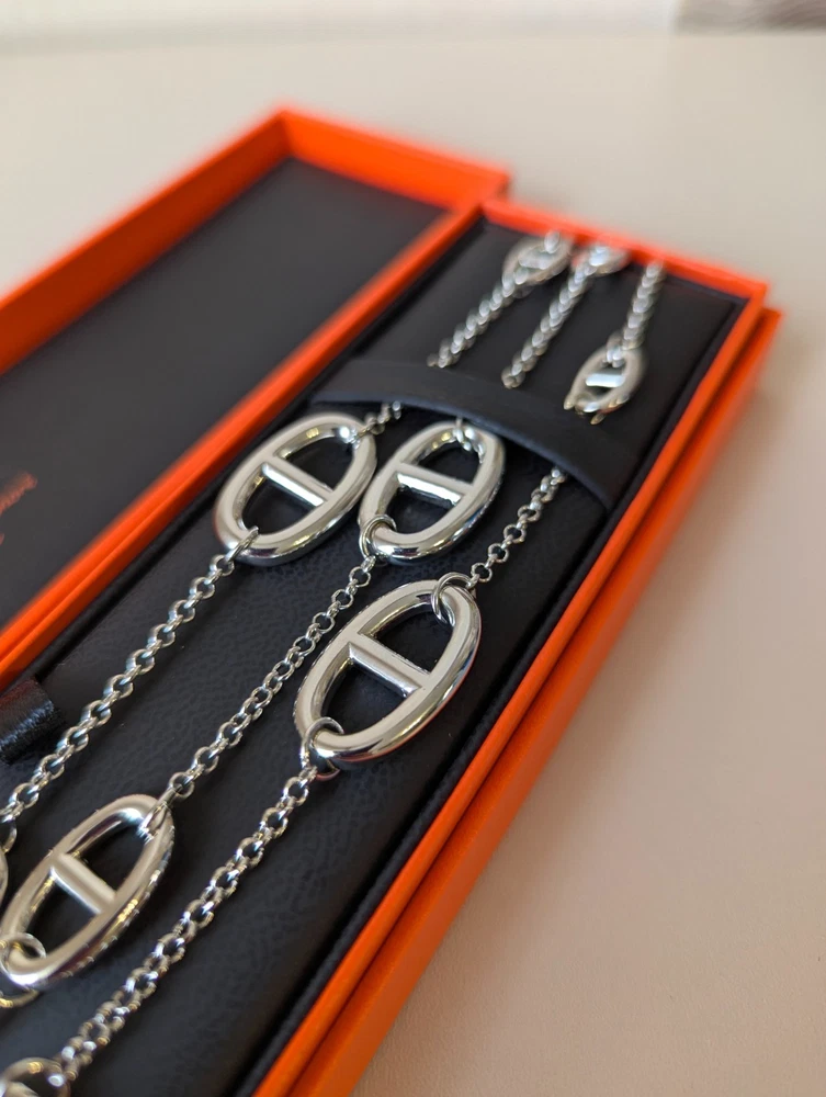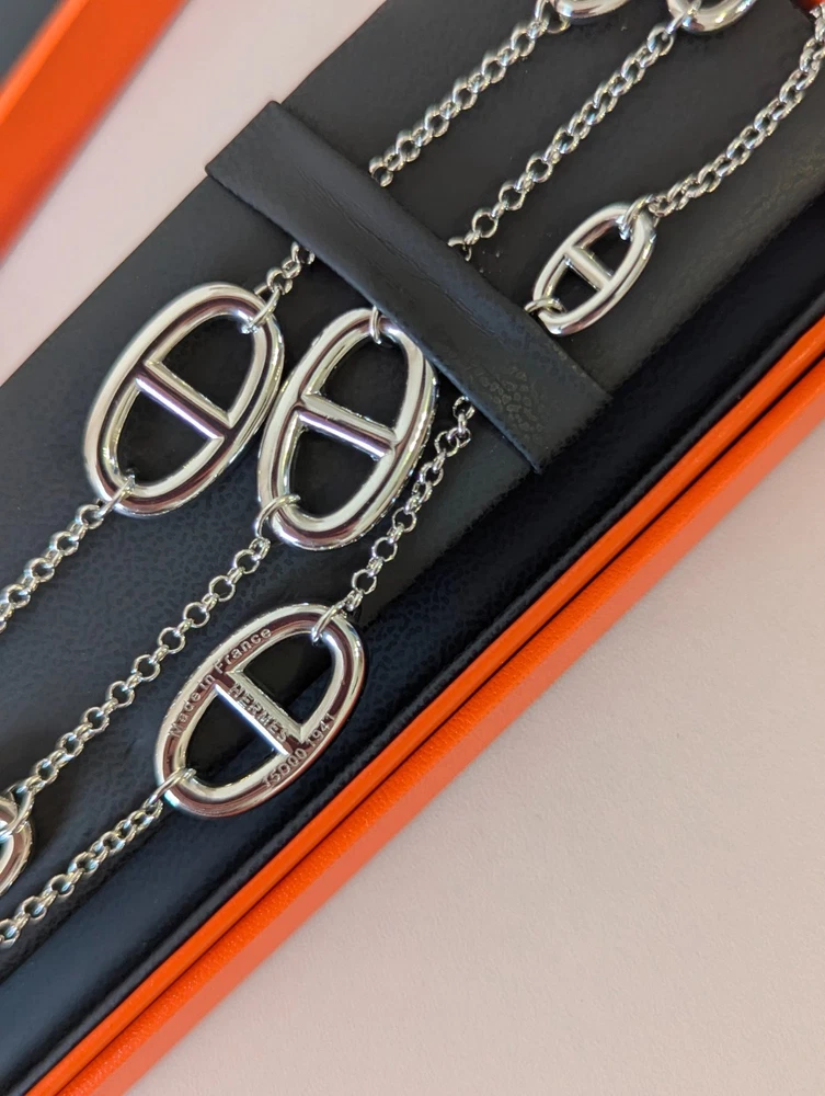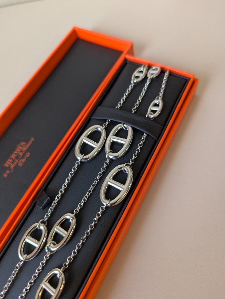 The Hermes Farandole Necklace is a stunning piece of fine jewellery crafted from sterling silver. This elegant necklace features a toggle closure and a chain style design, with a length of 120 cm making it a versatile and stylish accessory. The silver colour and brand signature of Hermés add a touch of luxury and sophistication, making it a perfect piece for those who appreciate beauty and love in their jewellery collection. Perfect for adding a touch of glamour to any outfit, this necklace is a timeless and classic addition to any jewellery collection.