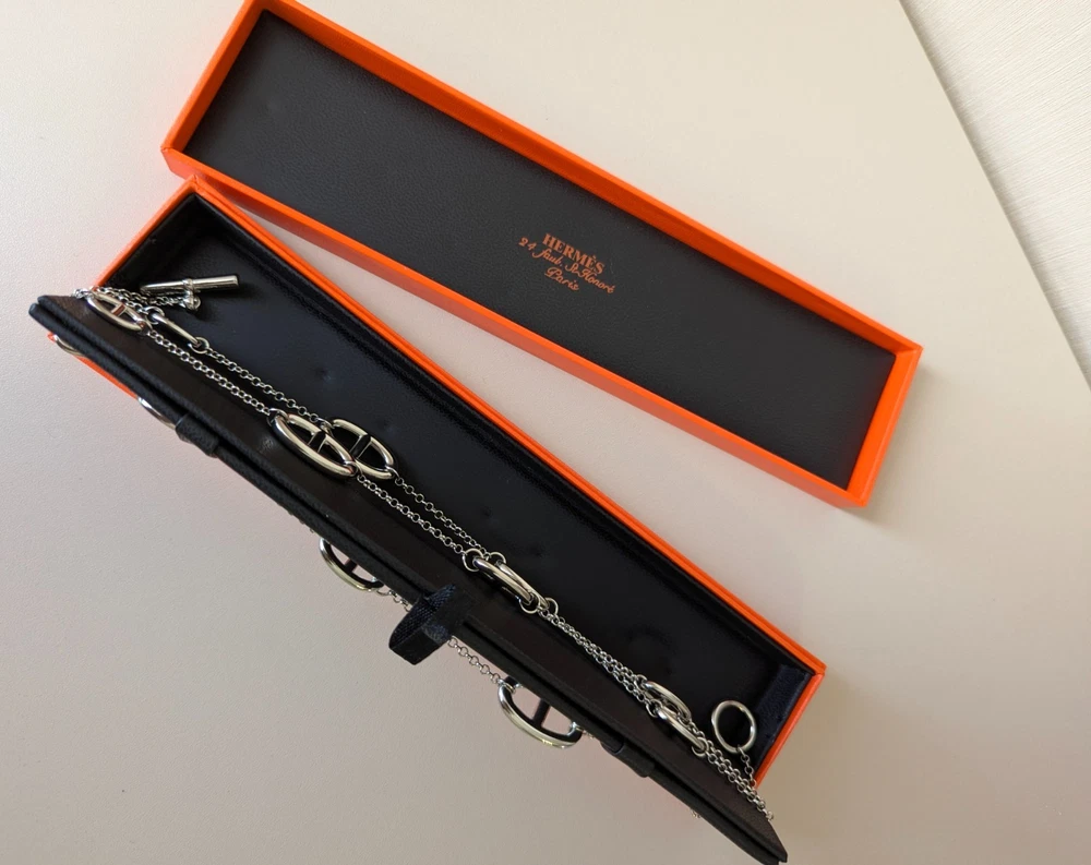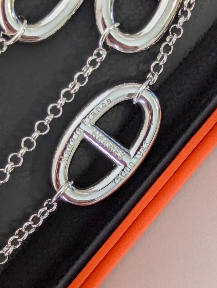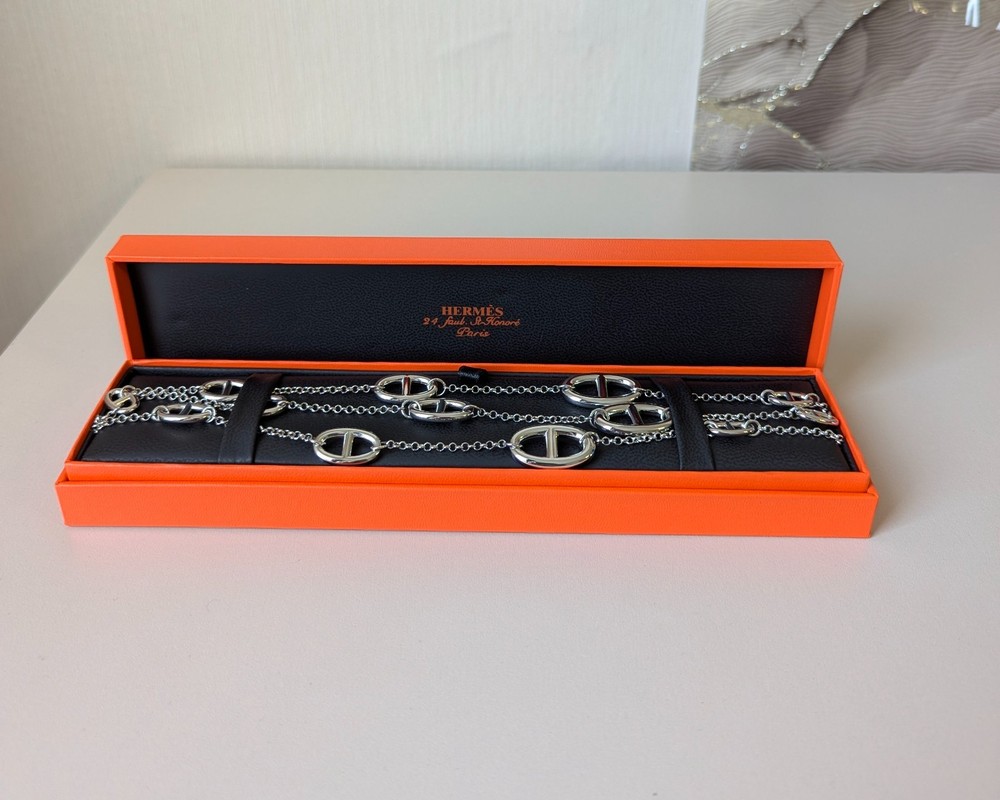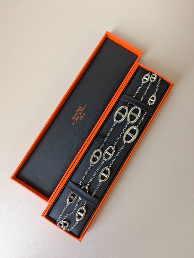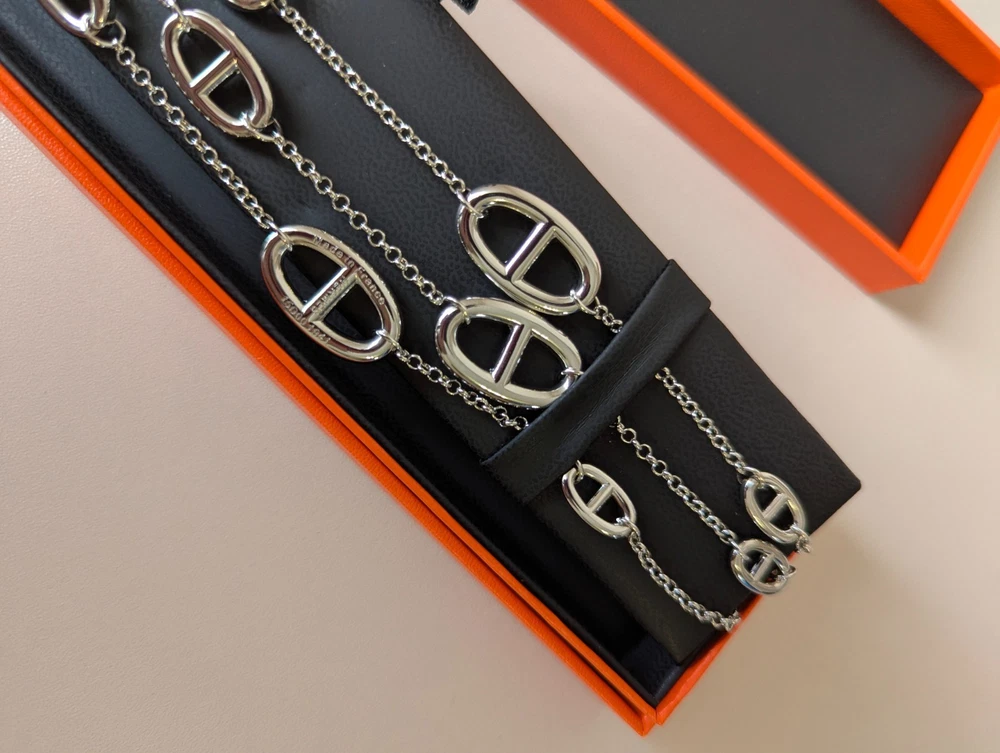The Hermes Farandole Necklace is a stunning piece of fine jewellery crafted from sterling silver. This elegant necklace features a toggle closure and a chain style design, with a length of 120 cm making it a versatile and stylish accessory. The silver colour and brand signature of Hermés add a touch of luxury and sophistication, making it a perfect piece for those who appreciate beauty and love in their jewellery collection. Perfect for adding a touch of glamour to any outfit, this necklace is a timeless and classic addition to any jewellery collection.