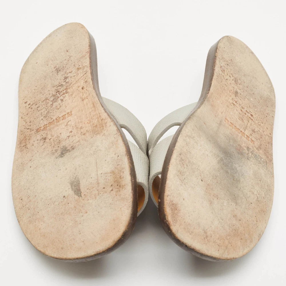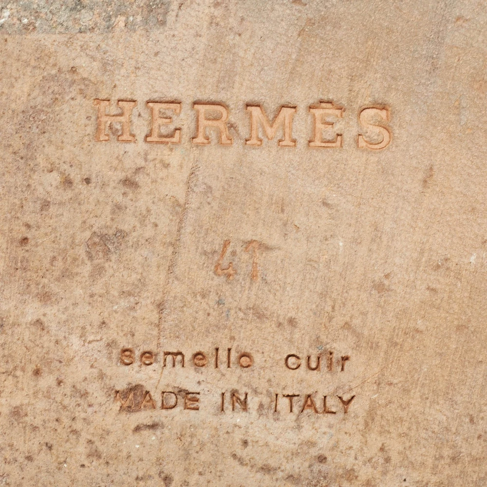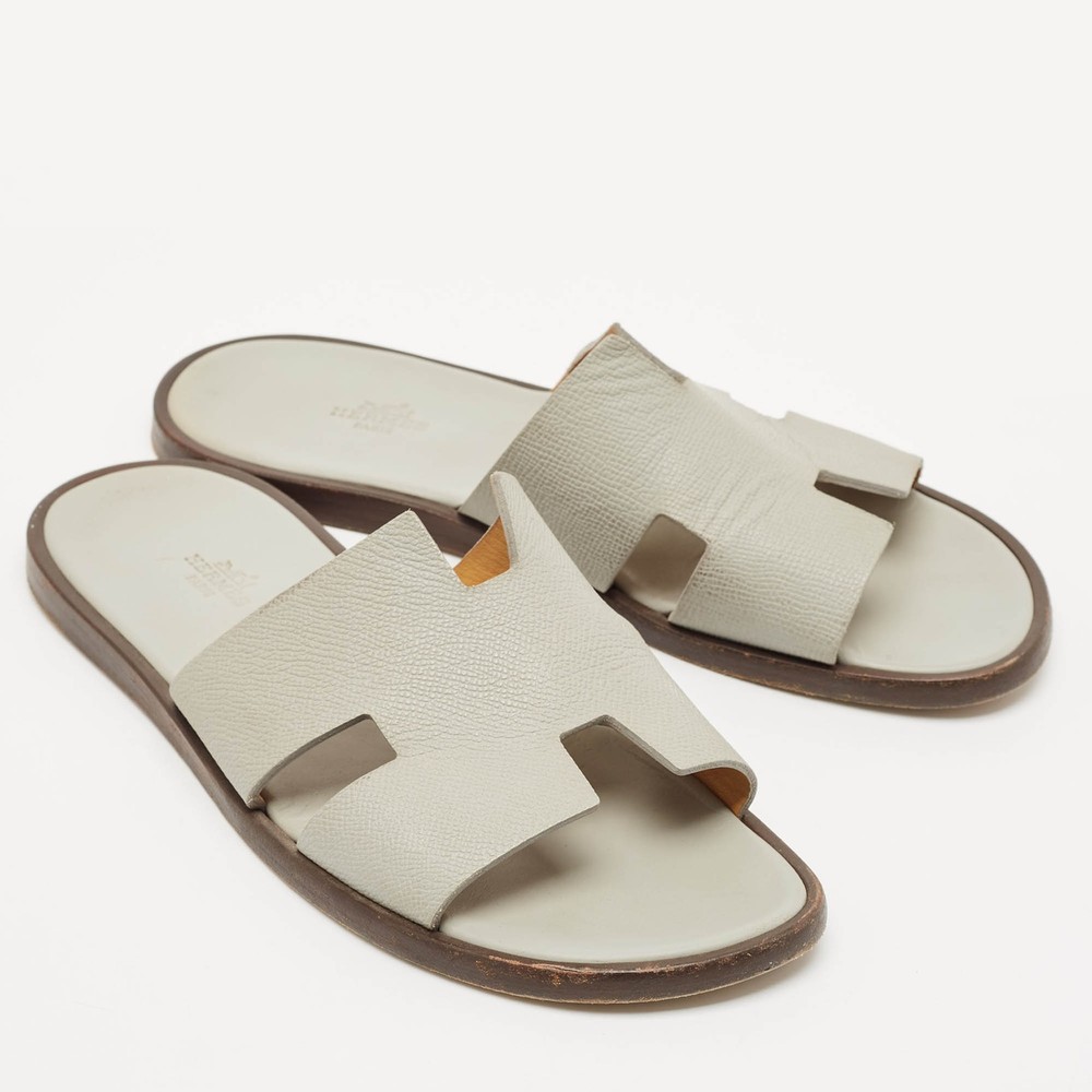 Hermes is a brand that epitomizes art and all their designs have a luxurious blend of comfort and style. These grey Izmir slides have been crafted from leather in Italy and feature the iconic H on the vamp, making it easy to slip them on over all your casual outfits.Certified by The Luxury Closet - This item has gone through a detailed authentication process overseen by our experts. We offer a lifetime guarantee of authenticity on all our items. Import duties, taxes and charges are not included in the item price. These charges are the buyers responsibility. Please check with your country’s customs office to determine what these additional cost will be prior to buying. Our eBay Store About Us Contact Us Add to Favorite Sellers Hermes Grey Leather Izmir Flat Slides Size 41 $414.7 Hermes is a brand that epitomizes art and all their designs have a luxurious blend of comfort and style. These grey Izmir slides have been crafted from leather in Italy and feature the iconic H on the vamp, making it easy to slip them on over all your casual outfits. Product Details Brand Color Grey Dimensions Material Leather Size 41 Outsole Width Outsole Length Heel Height Includes Certified by The Luxury Closet This item has gone through a detailed authentication process overseen by our experts. We offer a lifetime guarantee of authenticity on all our items. How We Check The in-house team of experts at The Luxury Closet is highly trained to verify the authenticity and the condition of the luxury products. They ensure that only 100% authentic items are put on sale.The evaluation process is unique with its own mix of assessment criteria and differs according to the category. Each item is evaluated based on the following combination of hallmarks, hardware, stitching, symmetry, material, craftsmanship, stamping, codes, hologram stickers, and packaging. Our authenticators also check if the items have been modified or amended (e.g., aftermarket diamonds, replaced batteries, repaired bags, etc.) International Buyers Import duties, taxes and charges are not included in the item price. These charges are the buyers responsibility. Please check with your country’s customs office to determine what these additional cost will be prior to buying.