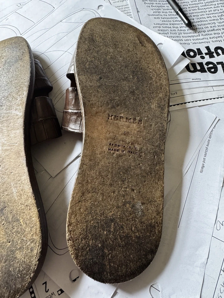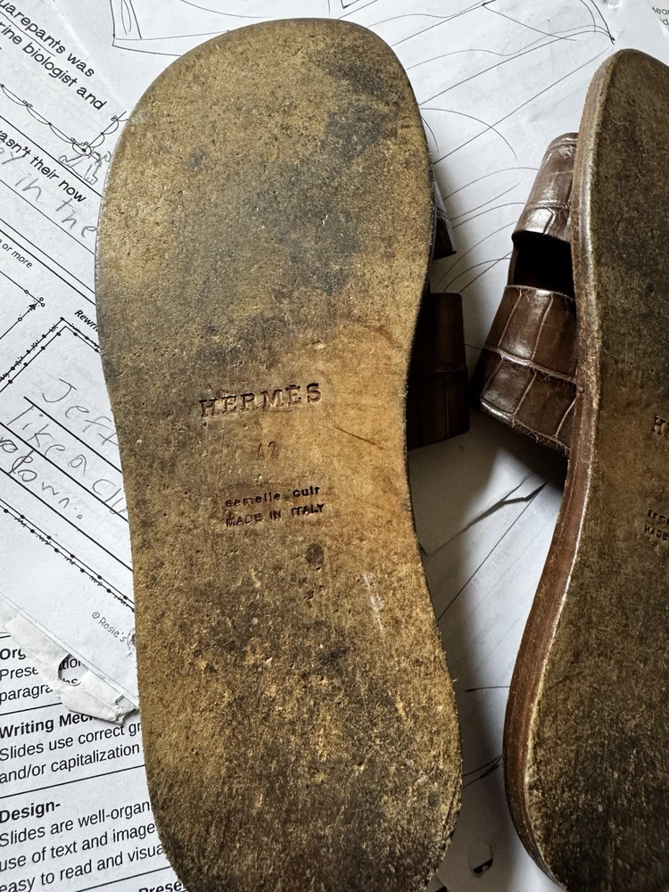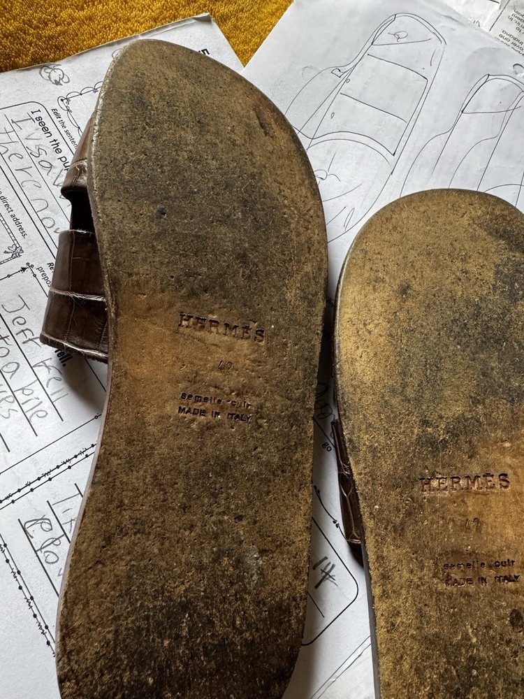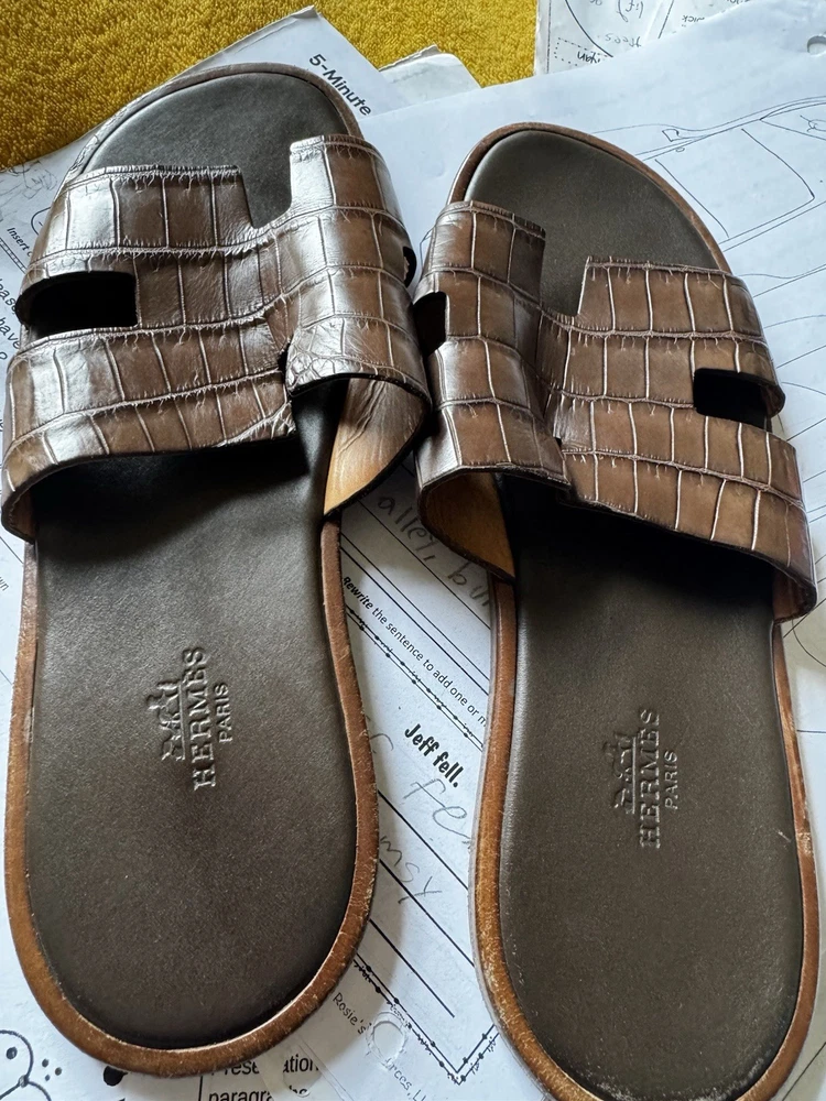 Used Hermes Crocodile Izmir Sandals Iconic H Cutout men's size US 9 Italy 42 slides in brown very rare new goes over $6k Please see all pictures and ask any questions before making a purchase. This is a used item. I can send you more images upon request. No return.