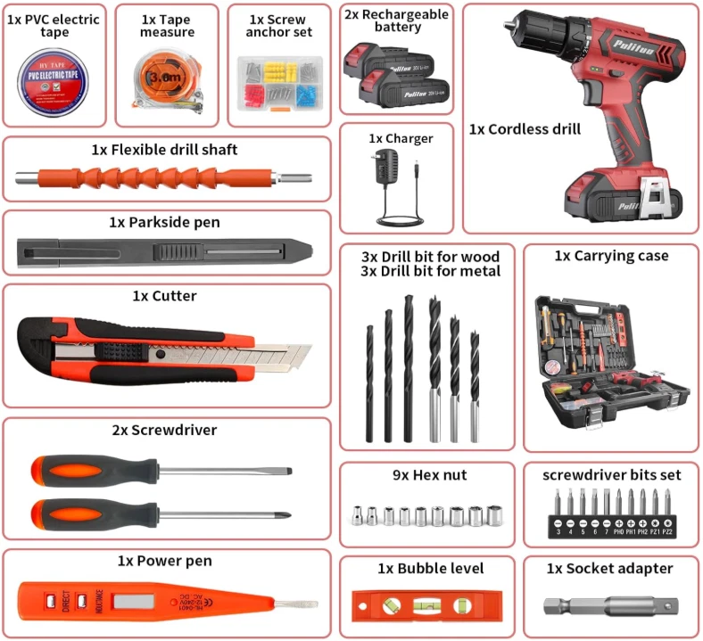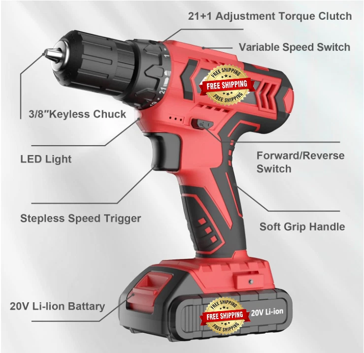 Herramienta con taladro inalámbrico 20V, pack de 2 baterías de litio, 30N.m KIT DE HERRAMIENTAS VERSÁTILES PARA EL HOGAR: Viene con dos baterías y un cargador, tres brocas para metal y tres para madera, adaptador de 9 vasos, 10 puntas de destornillador, eje flexible, cinta métrica, bolígrafo, cuchillo, destornilladores, bolígrafo eléctrico, nivel de burbuja, cinta de PVC, juego de anclajes para tornillos. MÚLTIPLES AJUSTES: Taladro inalámbrico de 20 V con un par de torsión de 30 Nm, que ofrece un ajuste de doble velocidad (alta y baja) para diferentes tareas; Con 21+1 configuraciones de par, garantiza un control preciso para proyectos profesionales o de bricolaje; Potente y versátil. EJE DE EXTENSIÓN FLEXIBLE: El taladro está equipado con un eje de extensión flexible que le proporciona una mayor flexibilidad en su trabajo, lo que le permite abordar fácilmente esquinas estrechas y espacios reducidos cuando sea necesario. DISEÑO PORTÁTIL Y AGARRE CÓMODO: Diseñado teniendo en cuenta la portabilidad, este taladro es liviano y fácil de transportar; Su diseño de mango ergonómico garantiza un agarre cómodo, lo que reduce la fatiga durante el uso prolongado. RENDIMIENTO CONFIABLE Y DURABILIDAD: Este taladro ofrece un rendimiento confiable y una construcción duradera, brindándole resultados consistentes y confiables; Es una herramienta confiable que puede manejar sus requisitos de trabajo de manera efectiva. SHIPPING: We offer FREE shipping on all orders! We ship within Three business days of payment, usually sooner. We use a selection of shipping services such as UPS, FedEx, USPS etc. We only ship to the lower 48 states, no APO/FPO addresses or PO Boxes allowed. Local pickups and combined shipping options are not provided at this time. PAYMENT: We accept payment by any of the following methods: PayPal Please pay as soon as possible after winning an auction, as that will allow us to post your item to you sooner! FEEDBACK: Customer satisfaction is very important to us. If you have any problem with your order, please contact us and we will do our best to make you satisfied. Thank you for shopping with us!