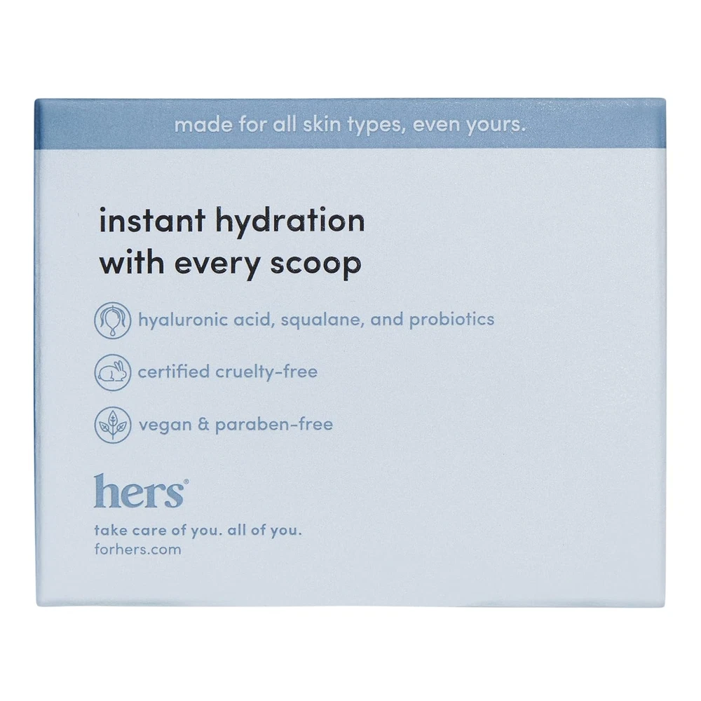 Hers Hydrobounce Instant Moisturizer - Squalane Moisturizer, All Skin Types Product Details HYDRATION: Meet your go-to moisturizer. Formulated for hydration, this lightweight yet ingredient-rich moisturizer supports healthy skin, day and night. Give skin the non-greasy hydration it needs to look and feel bouncy, moisturized, and healthy PLUMPS & SMOOTHES: Dermatologist-trusted ingredients that deeply nourish and hydrate. Hyaluronic acid helps skin retain moisture, which reduces the appearance of fine lines and wrinkles and promotes plump, healthy skin STRENGTHENS SKIN BARRIER: This paraben-free, cruelty-free, vegan formula contains Squalane which helps strengthens the skin barrier and helps with moisture retention for a plump and bouncy complexion SUPPORTS SKIN MICROBIOME: Our Probiotic moisturizer contains balancing microorganisms that help support and strengthen your skin microbiome USE DAY & NIGHT: Apply in the morning after cleansing or at night after cleansing to protect the skin’s natural barrier from irritation Product Description Item Volume 1.7 Fluid Ounces Active Ingredients hyaluronic acid,squalane Age Range (Description) Adult Special Feature Lightweight Package Dimensions 2.95 x 2.8 x 2.32 inches; 6.74 ounces Size 1.7 Fl Oz (Pack of 1) 2.8 inches x 2.95 inches x 2.32 inches. Weight: 6.74 oz Payment Details We accept all payments via Ebay using Credit Cards , PAYPAL , Apple Pay and many others Shipping Details We are always working hard to ensure your package arrives as soon as possible. Please understand that some factors like weather, high postal traffic, and the performance of shipping companies are outside of our control. Delivery & Return Policy Details We offer a 30-Day Return Policy on items in which you are not completely satisfied with. You have the option of a full-refund or an exchange of the item. No returns are available on items shipped outside of the USA.