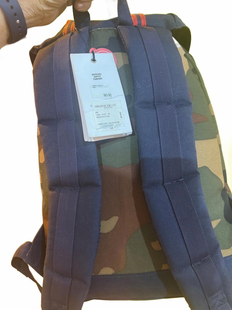 New with tags Herschel Supply Co. “Retreat” backpack in camo and navy blue (Peacoat) with tan trim. 19.5L capacity with internal padded fleece-lined sleeve fits laptops up to 15”. Features contoured padded straps, drawcord closure, magnetic buckle flap, and signature striped liner. Model: 10066-04107 Original retail $90.