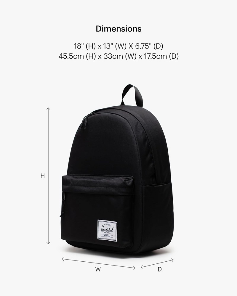 Herschel Supply Co. Classic XL Backpack, Black, One Size, Black Product Details Product Dimensions: 6.5 x 12.5 x 17.5 inches Item Weight: 1.1 pounds Department: unisex-adult Manufacturer: Herschel Supply Co. Country of Origin: Cambodia Item model number: 11380-00001-OS Age Range Description: Adult Item Weight: 0.5 Kilograms Capacity Total: 28 Liters New EcoSystem 600D Fabric made from 100% recycled post-consumer water bottles New Tonal stripe EcoSystem Liner made from 100% recycled post-consumer water bottles Floating sleeve fits a 15"/16" laptop Zippered closures with Prusik cord pulls Carry comfortably with adjustable padded shoulder straps Room for adventure. Sized for everything you love to do, this backpack is made with 100% recycled EcoSystem™ fabrics and has the volume you need to pack everything in.